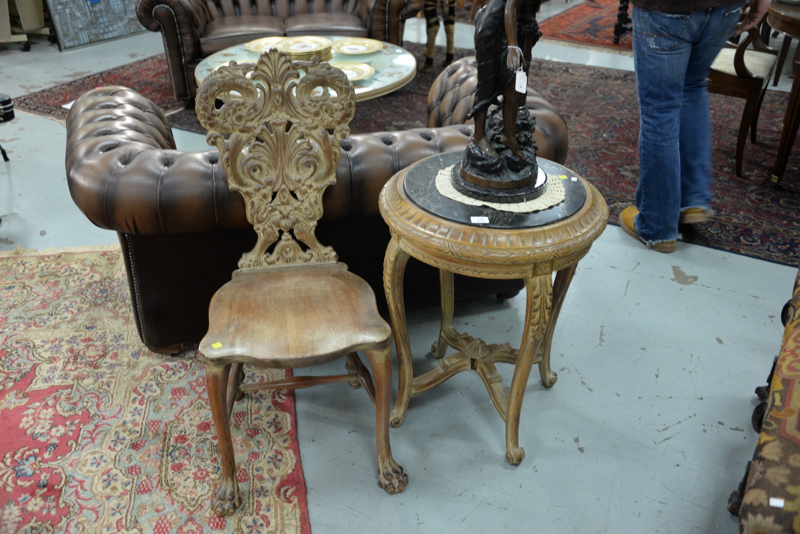 Two piece lot including a carved Victorian side chair and a marble top- table. table: ht. 28 in. dia. 22 in.