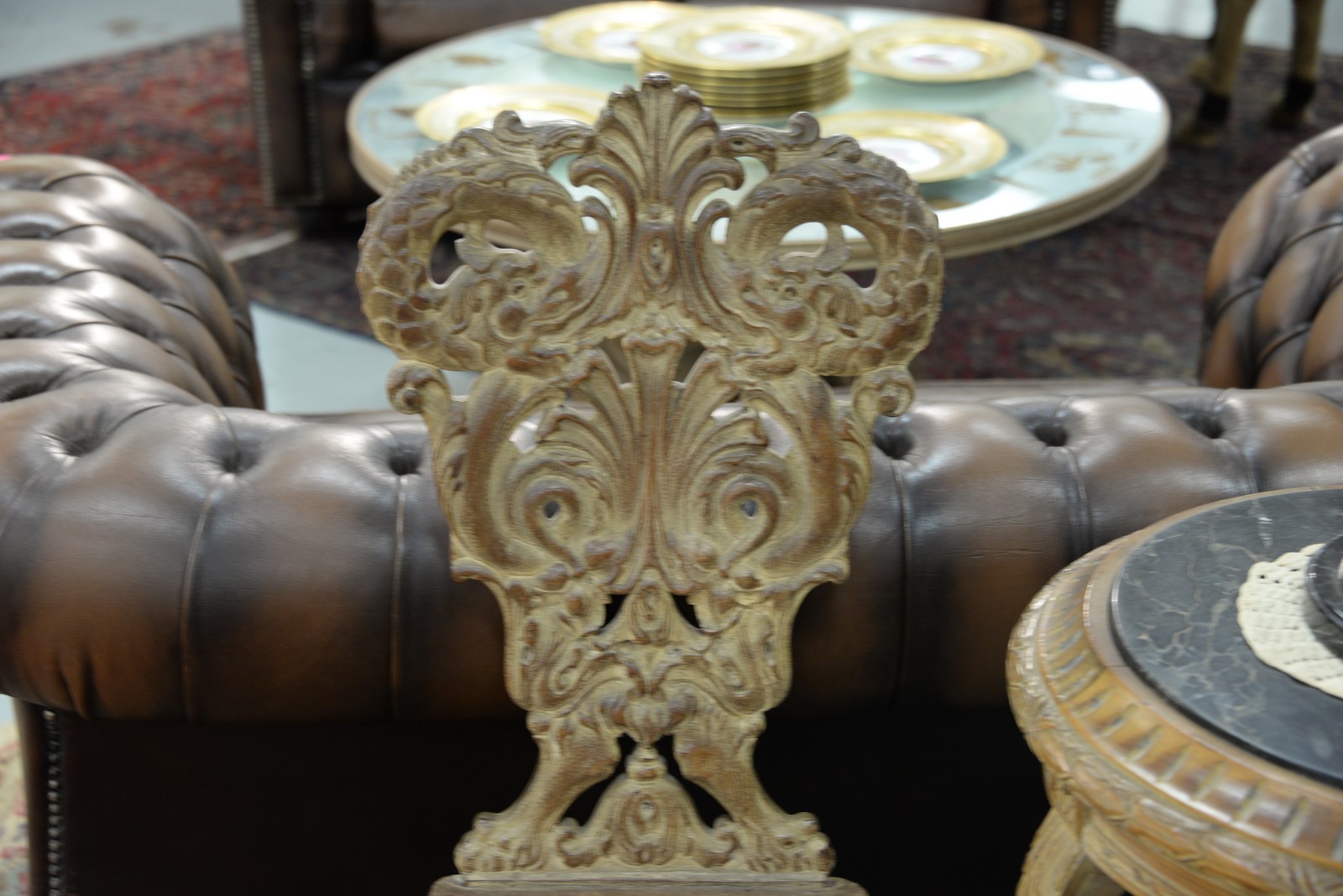 Lot 329: Two piece lot including a carved Victorian side chair and a marble top- table.table: ht. 28 in. dia. 22 in.