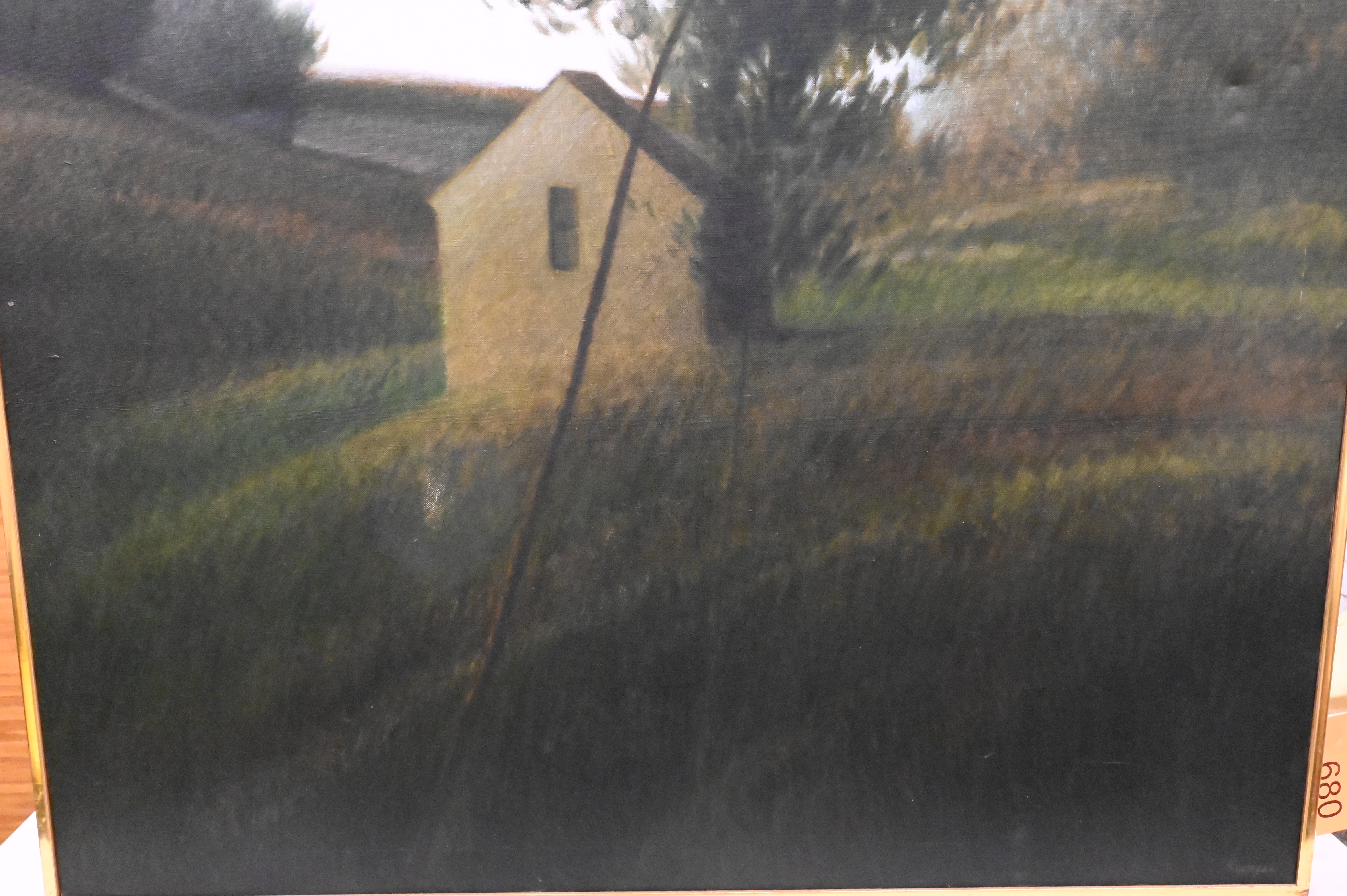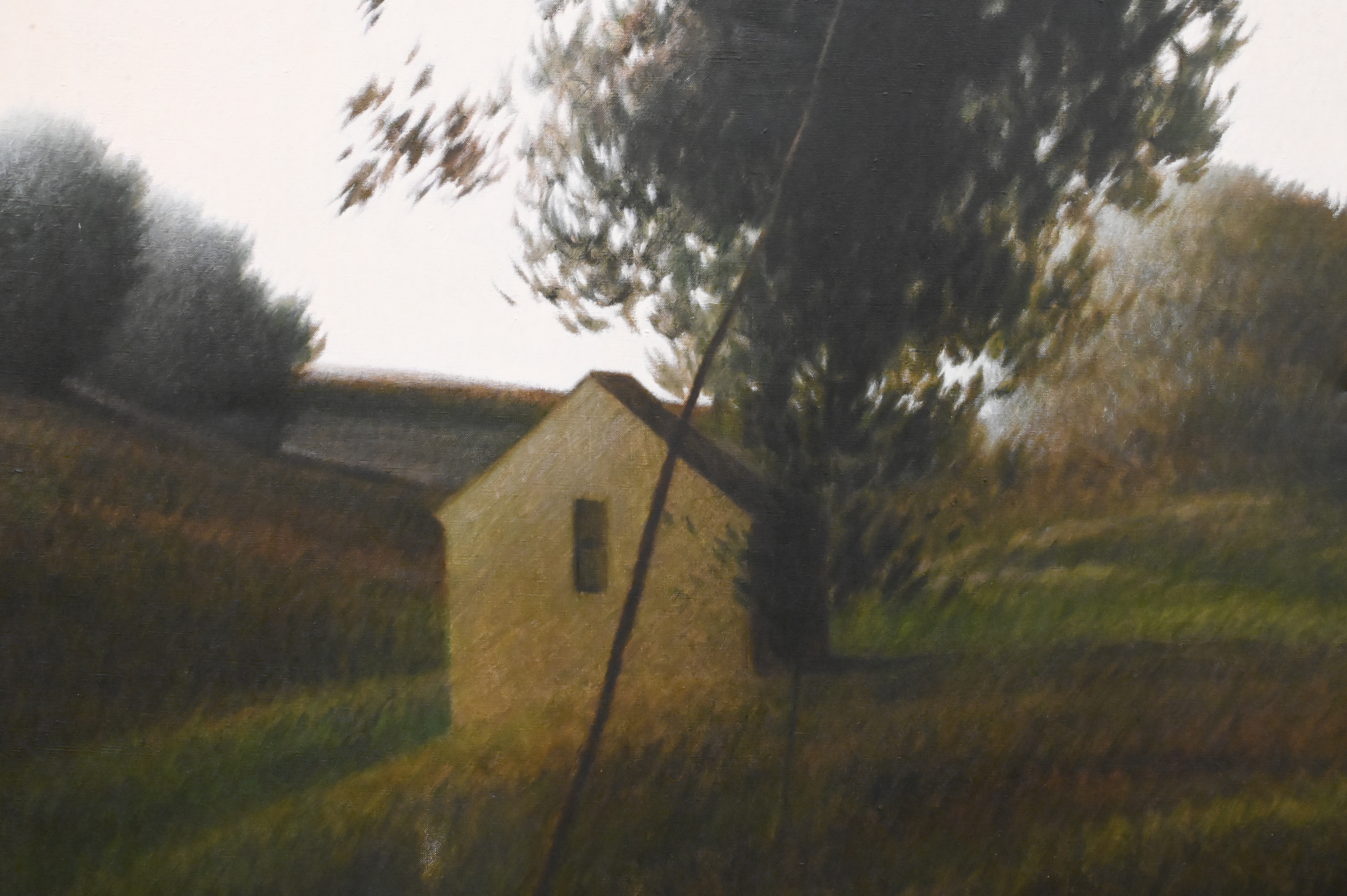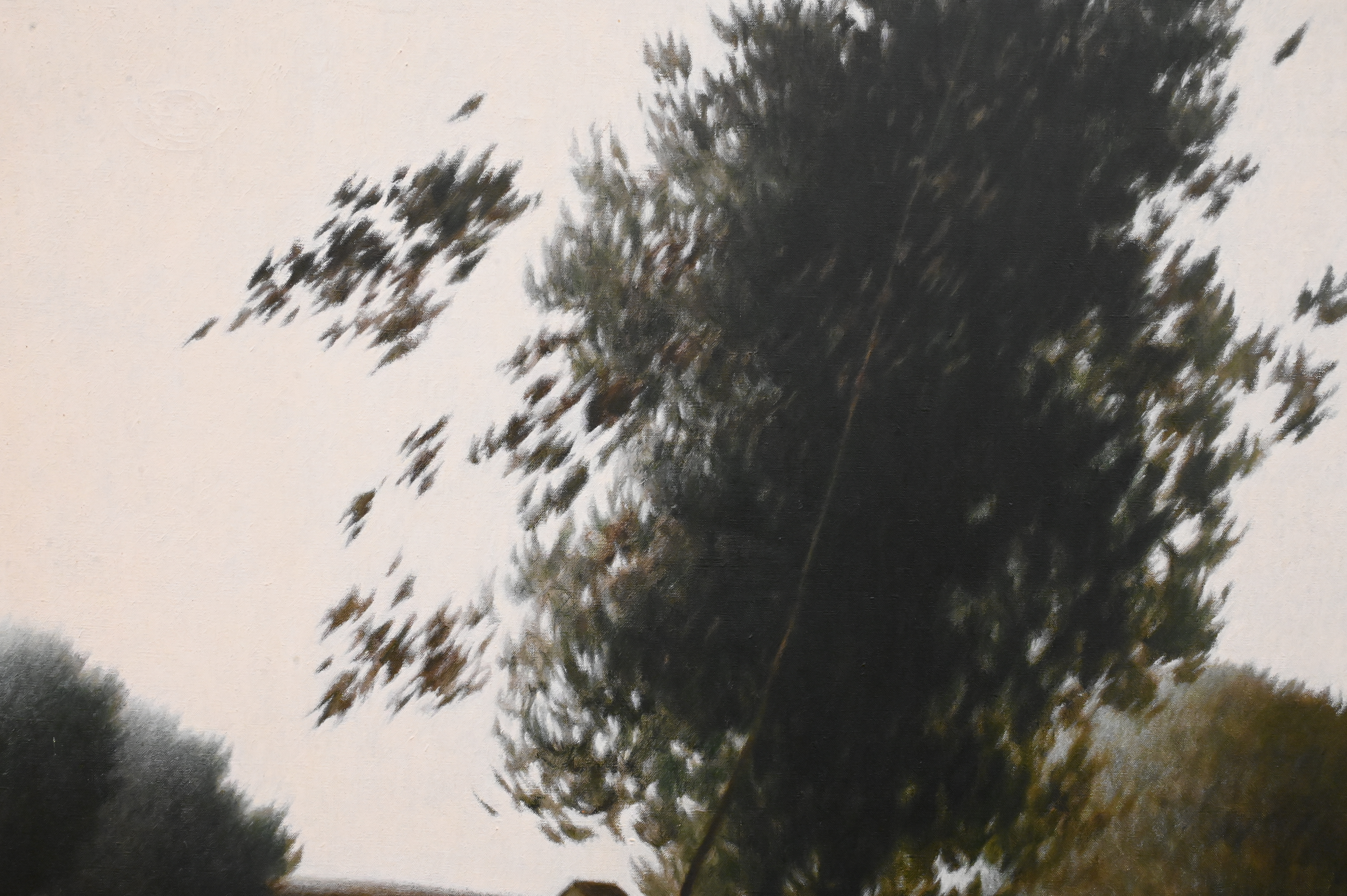 Depicting a small house beneath a dramatically bent tree, leaves blowing in the wind, in a stylized soft-focus