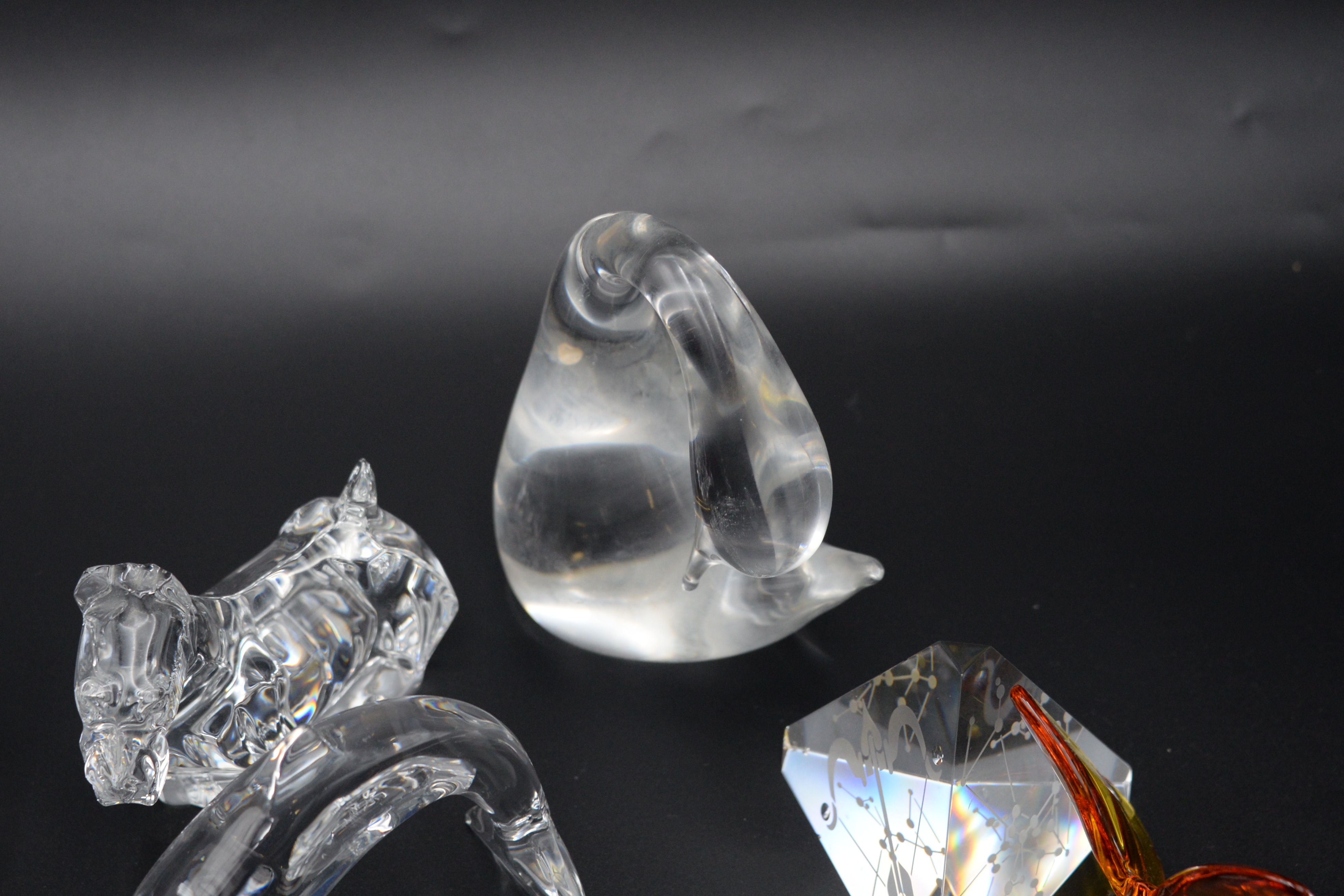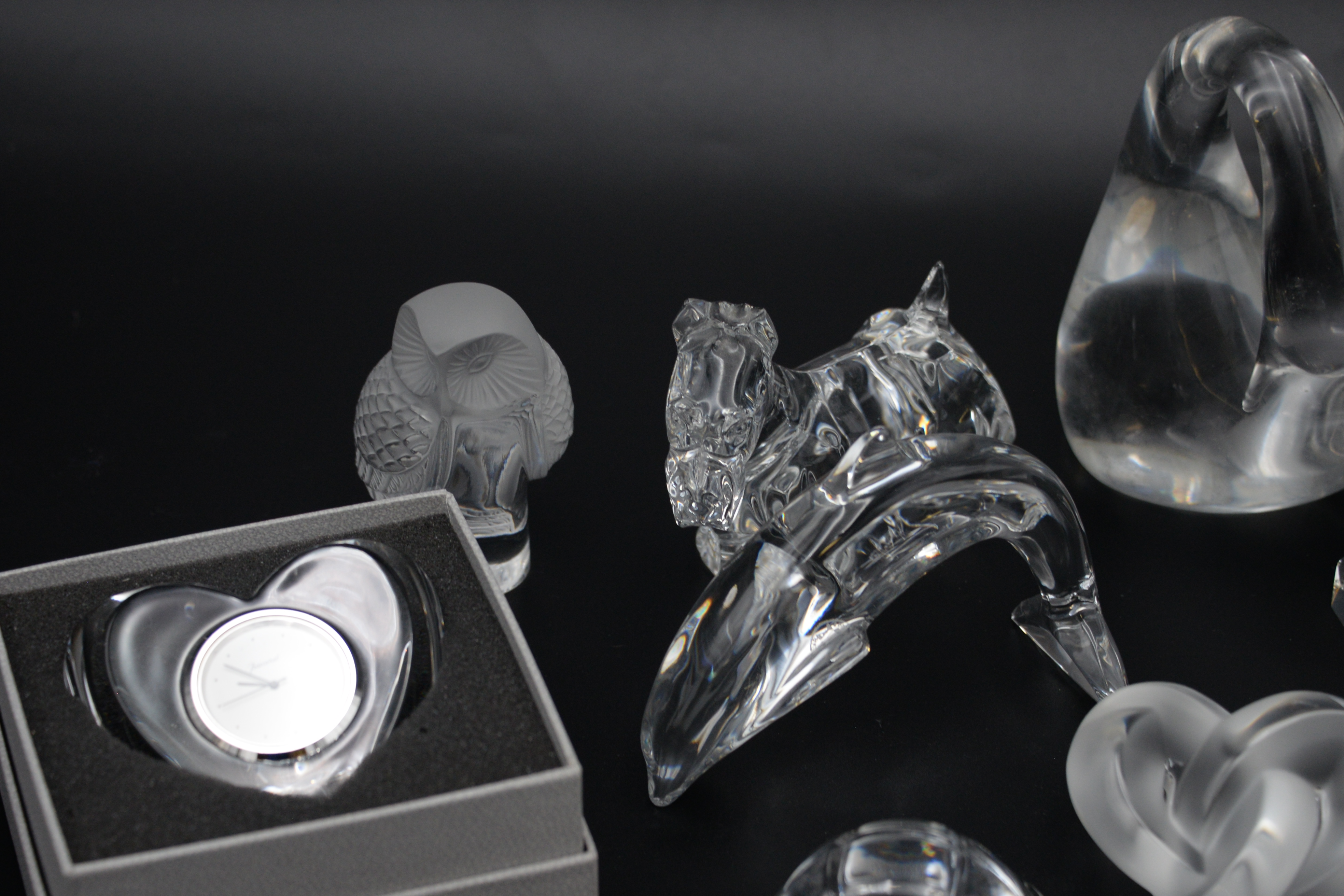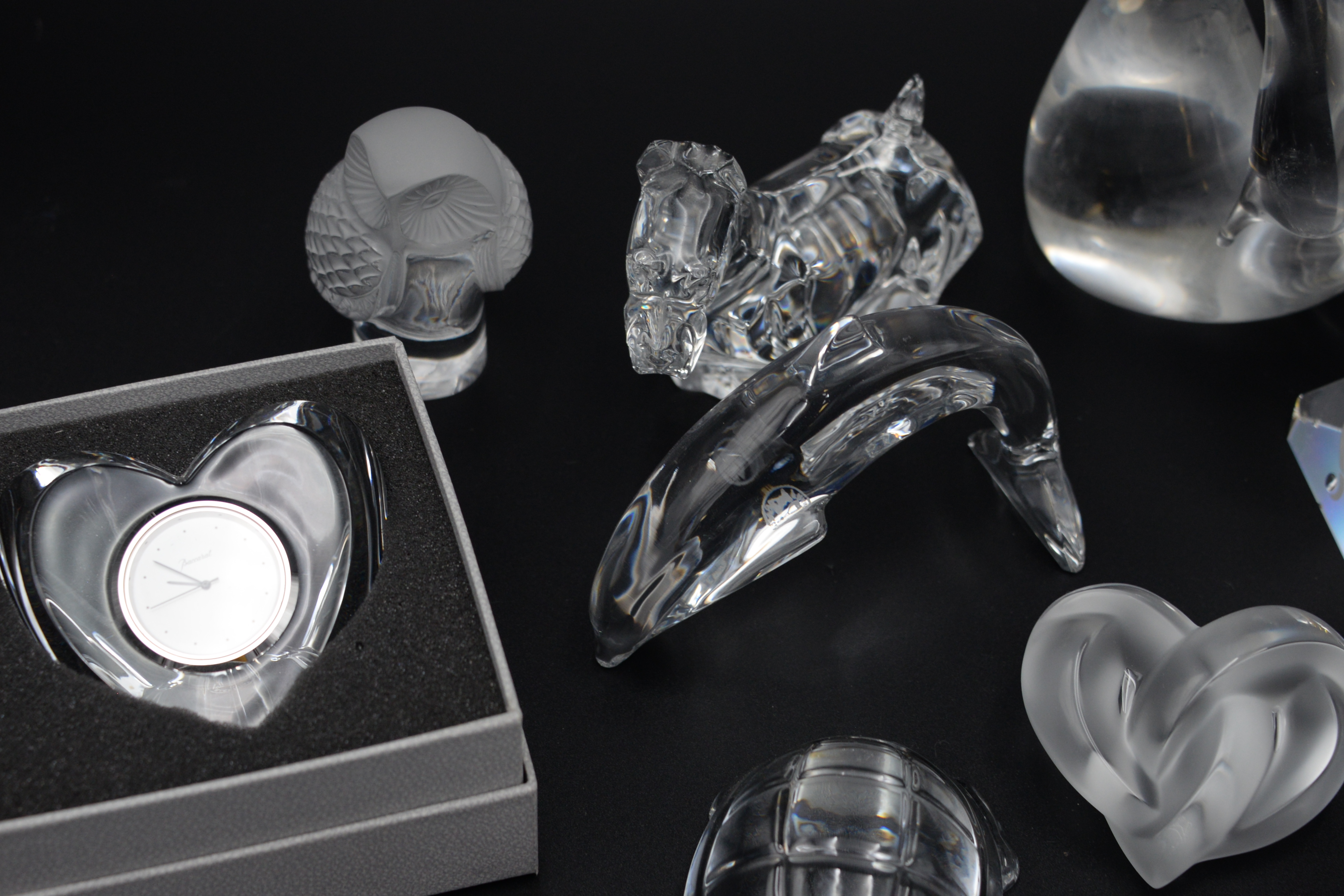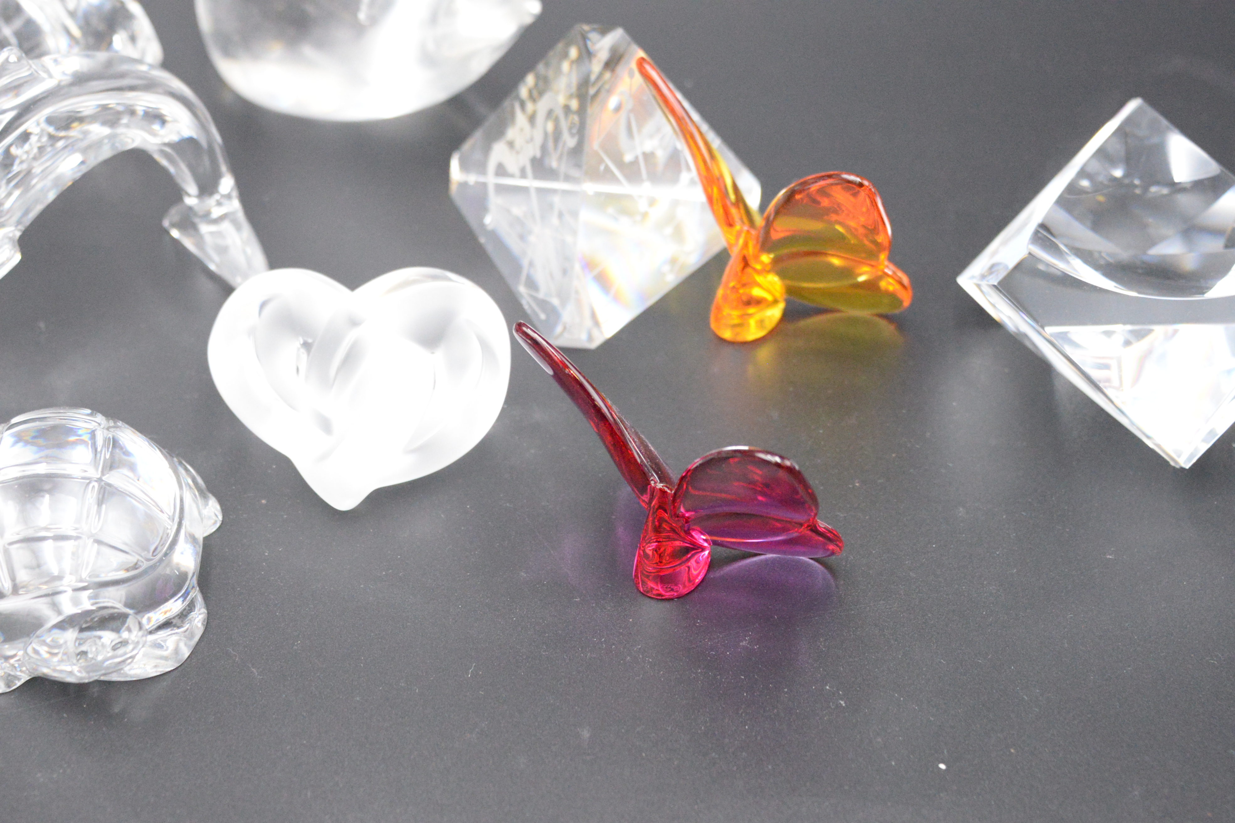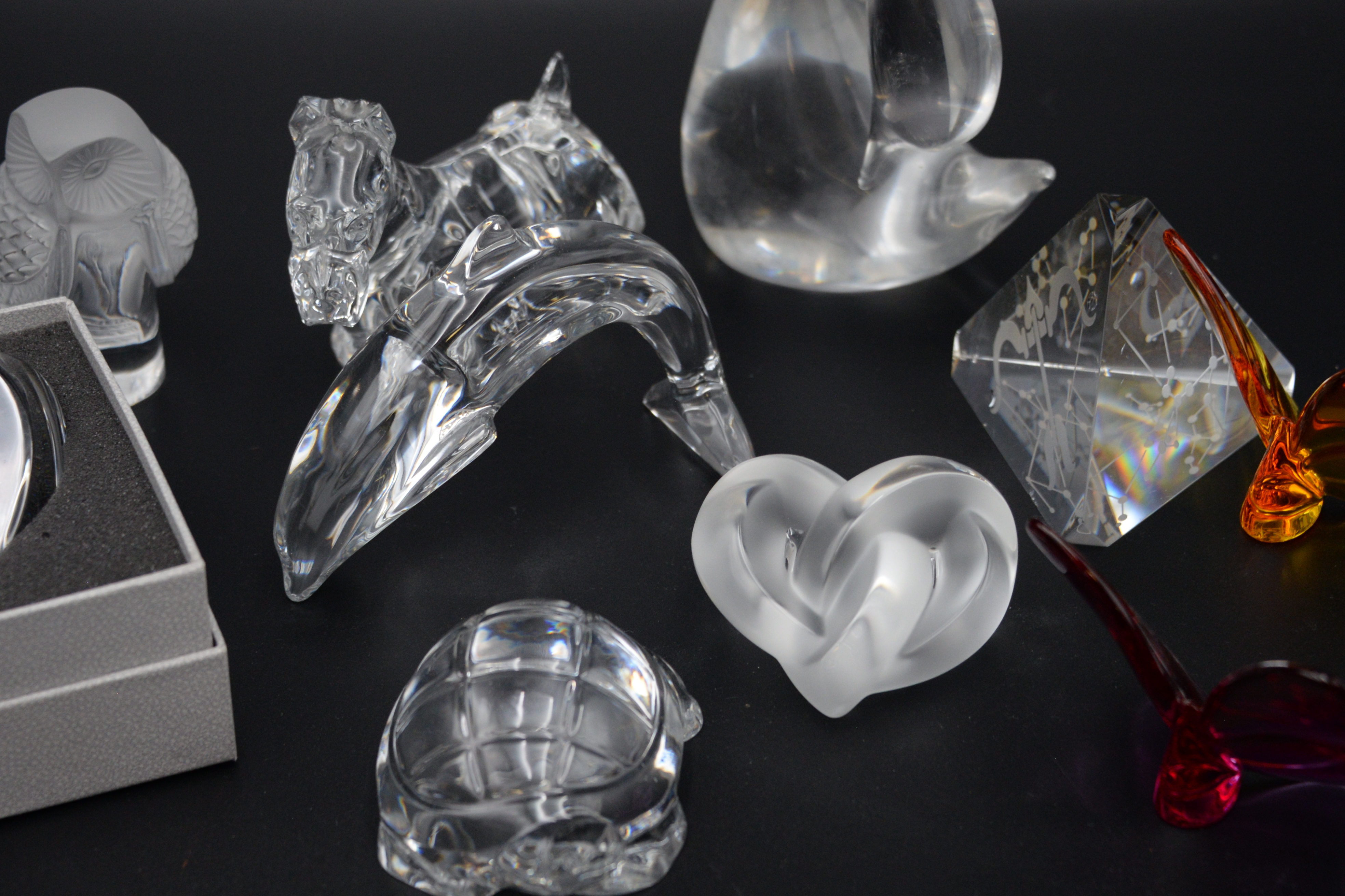 10 Piece Decorative Glass and Crystal Group to Include, Baccarat yellow and purple butterfly, Baccarat turtle, Baccarat Scottie dog, Baccarat dolphin, Baccarat clear glass heart clock, Lalique France owl, Lalique France heart, Daume France swan, each signed on bottom, Steuben Sagittarius zodiac prism pyramid