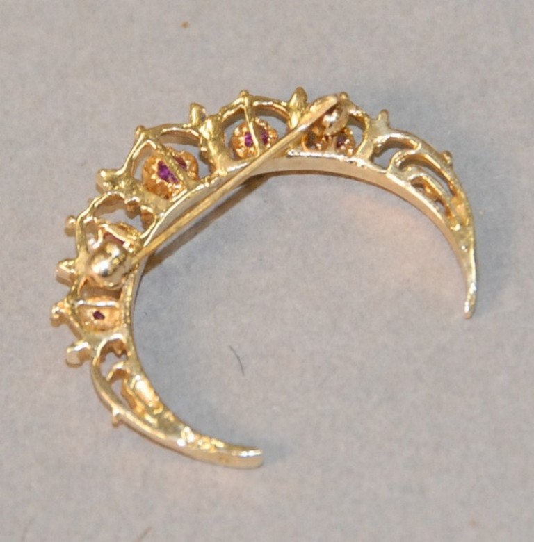 Lot 33: 14kt gold crescent pin set with five red stones.