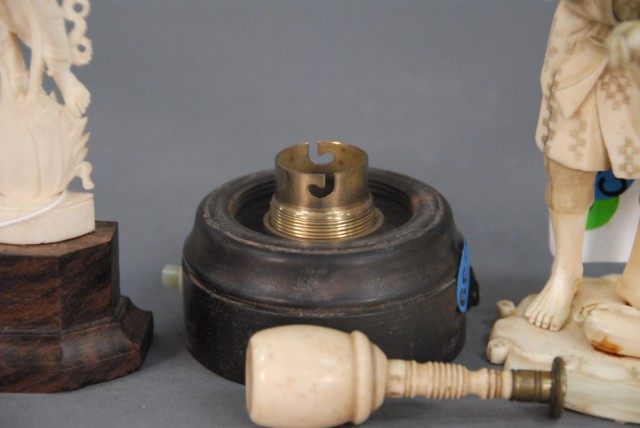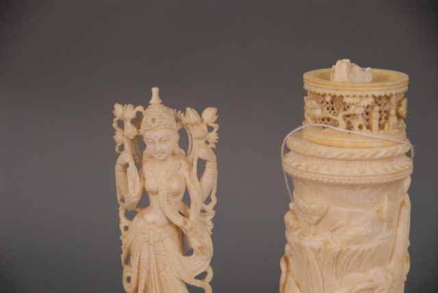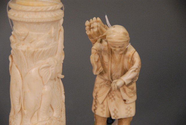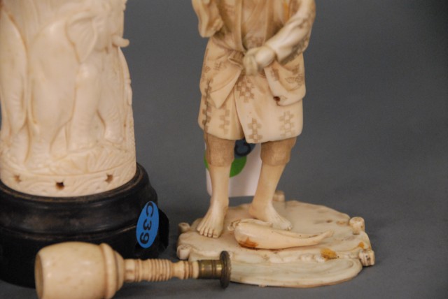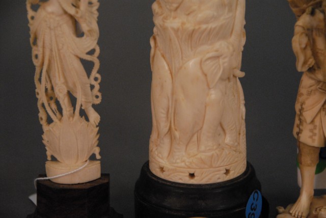 3 carved ivory pieces as is, carved figure of a man collecting food, carved GuanYin figure and a carved elephant lamp