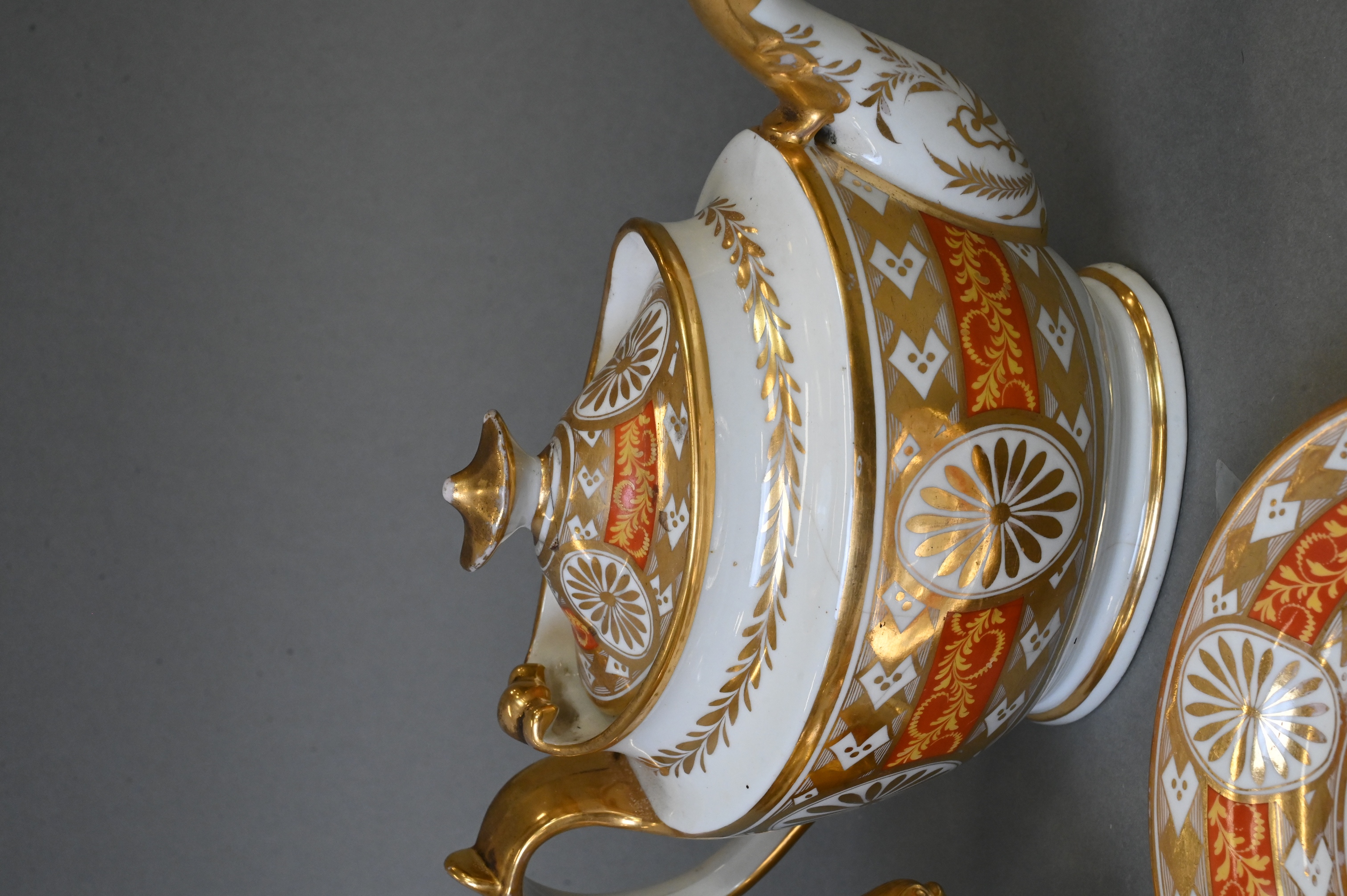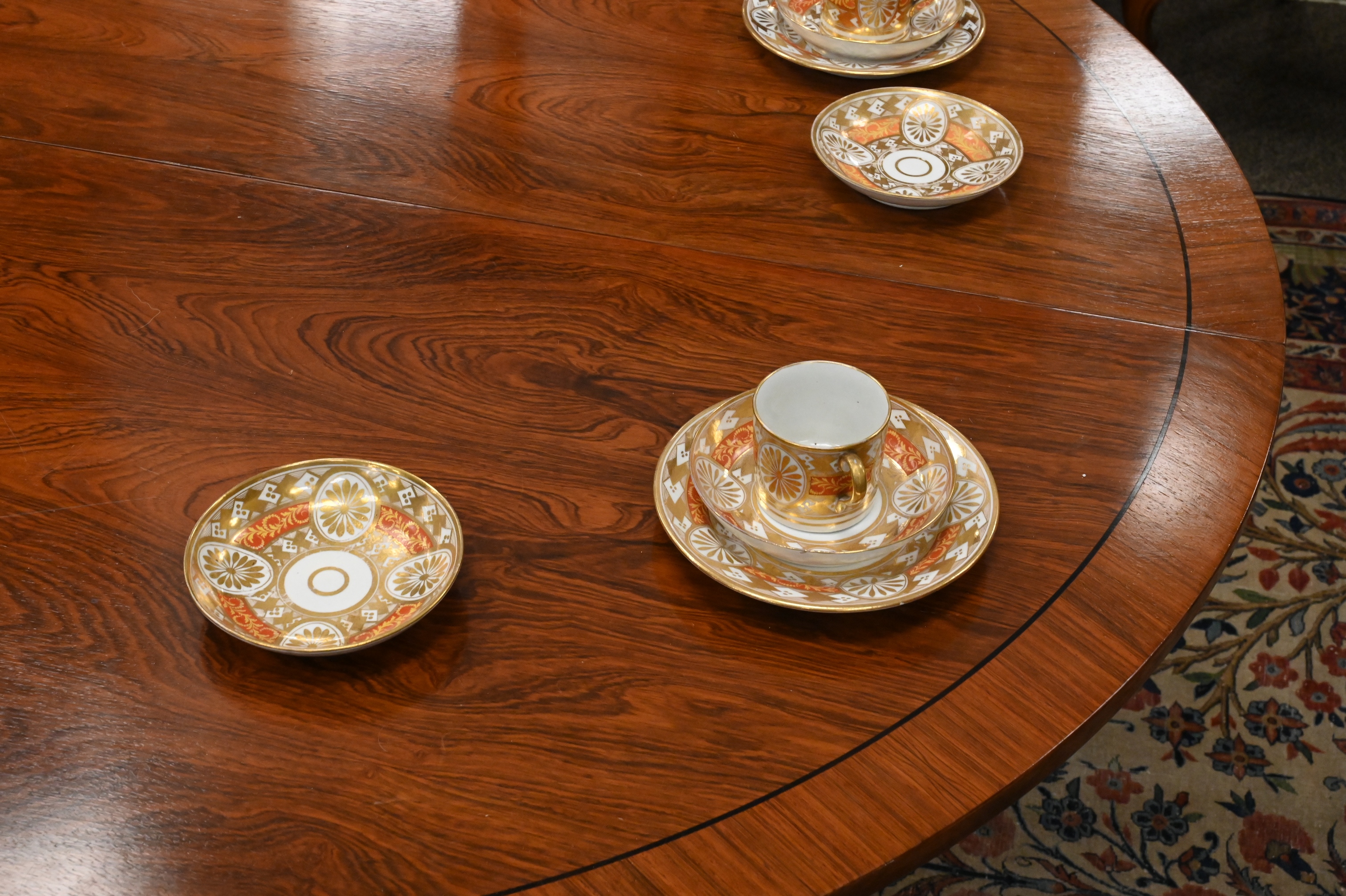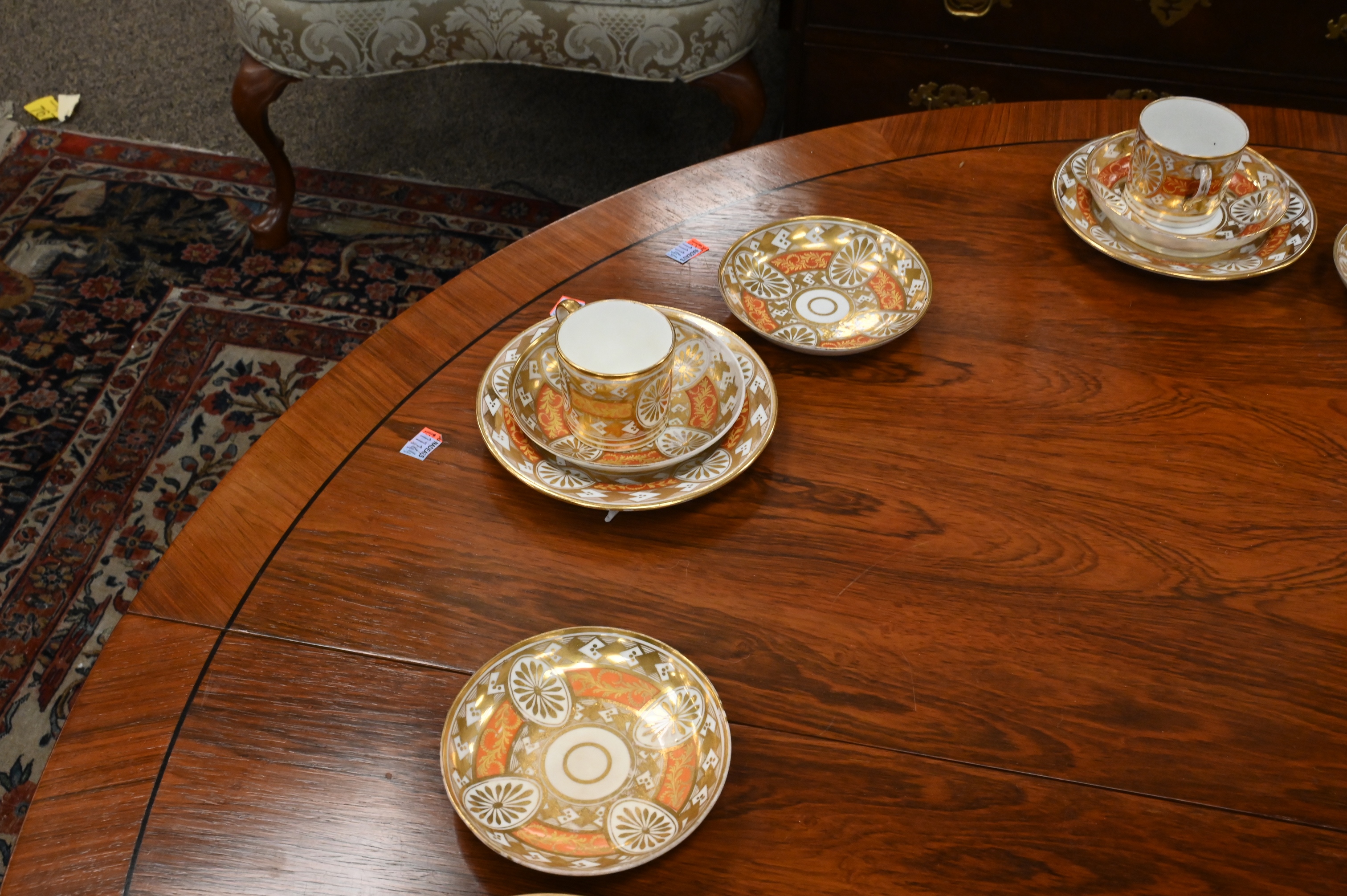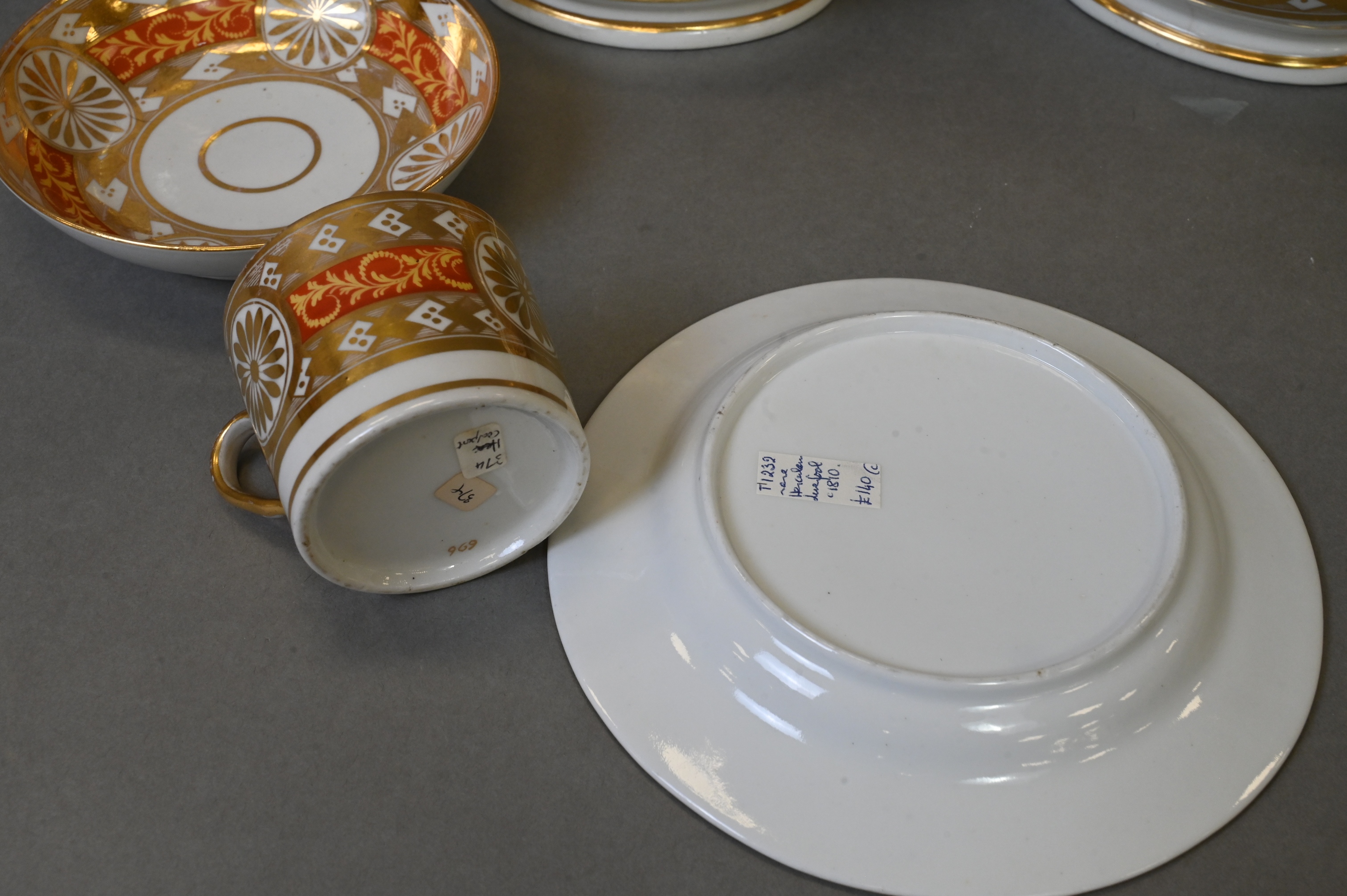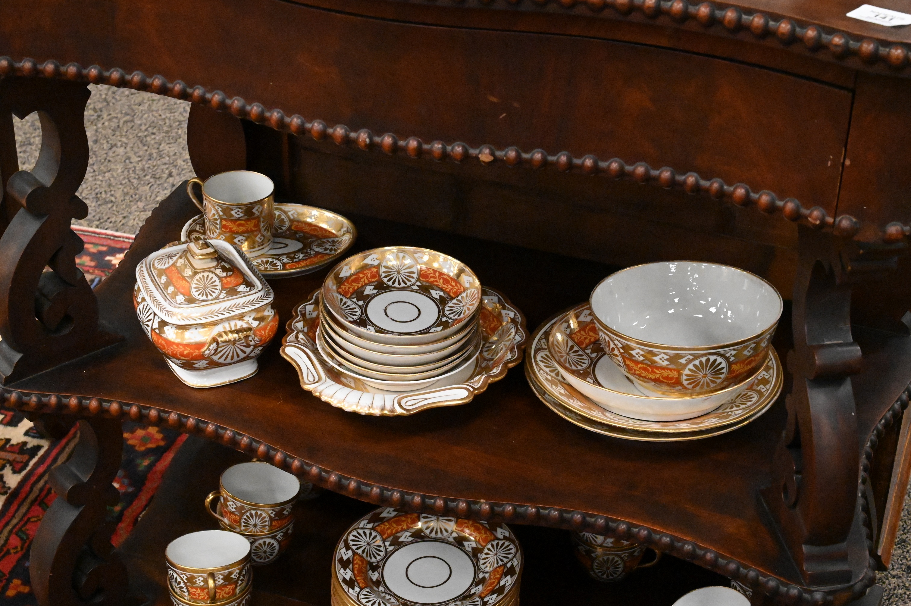 decorated with gilt oval pattern and reserved on a broad border of overlapping gilt diamonds and an orange band, comprising a teapot, creamer, 2 covered sugars, bowl and underplate, 16 teacups and 18 saucers, 18 underplates, 7 coffee cups, 2 shell dishes, along with 3 additional plates