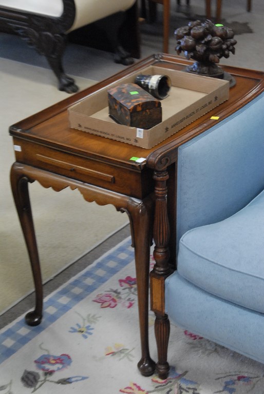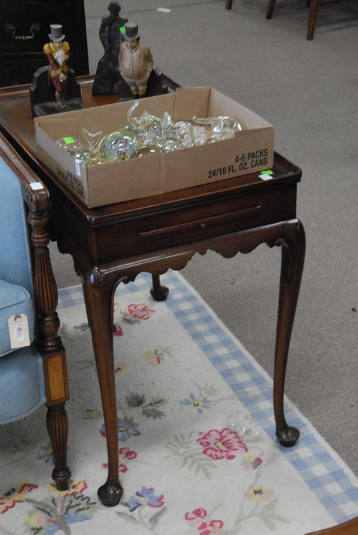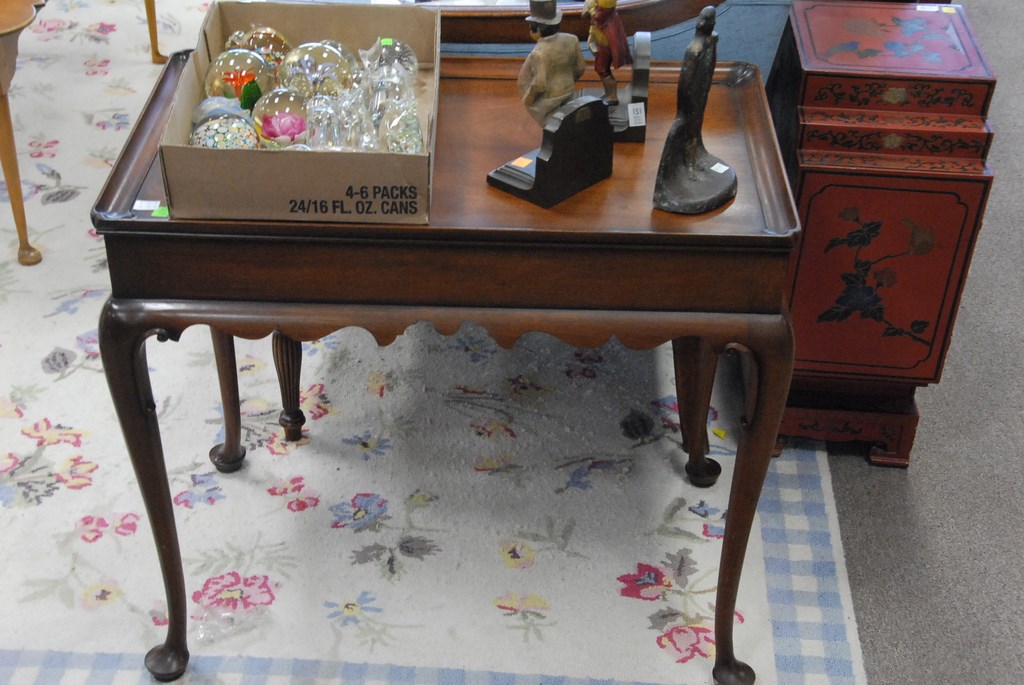 Lot 33: Colonial Williamsburg pair of Queen Anne style tea tables with dished tops and candle slides, signed, ht. 26 in. lg. 29 in.