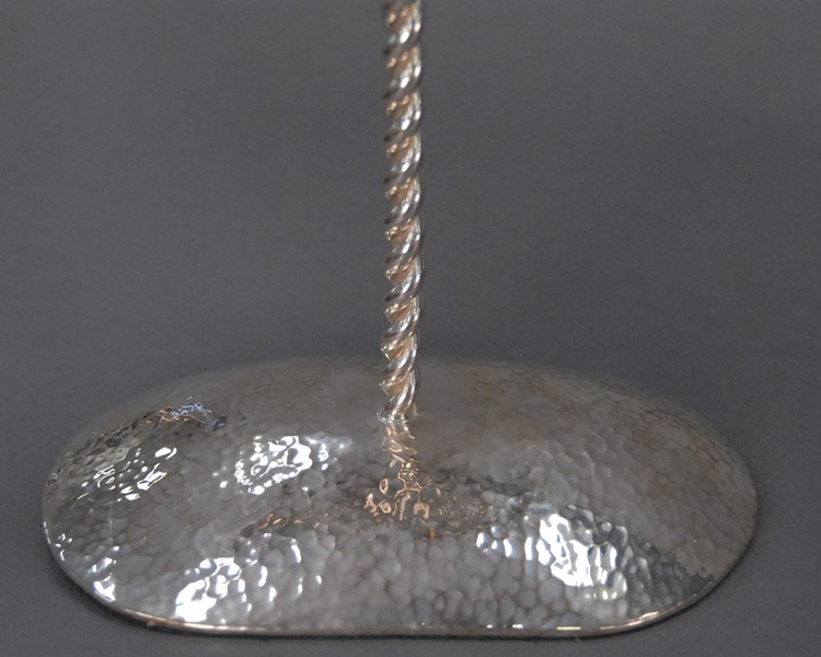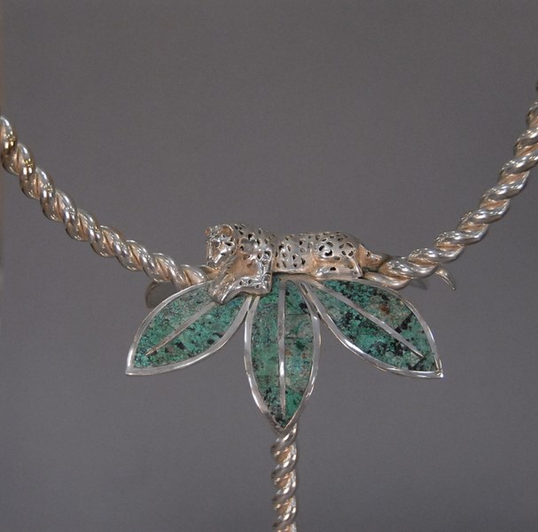 Lot 33: Emilia Castillo silverplate candelabra with leopard and inlaid stone.