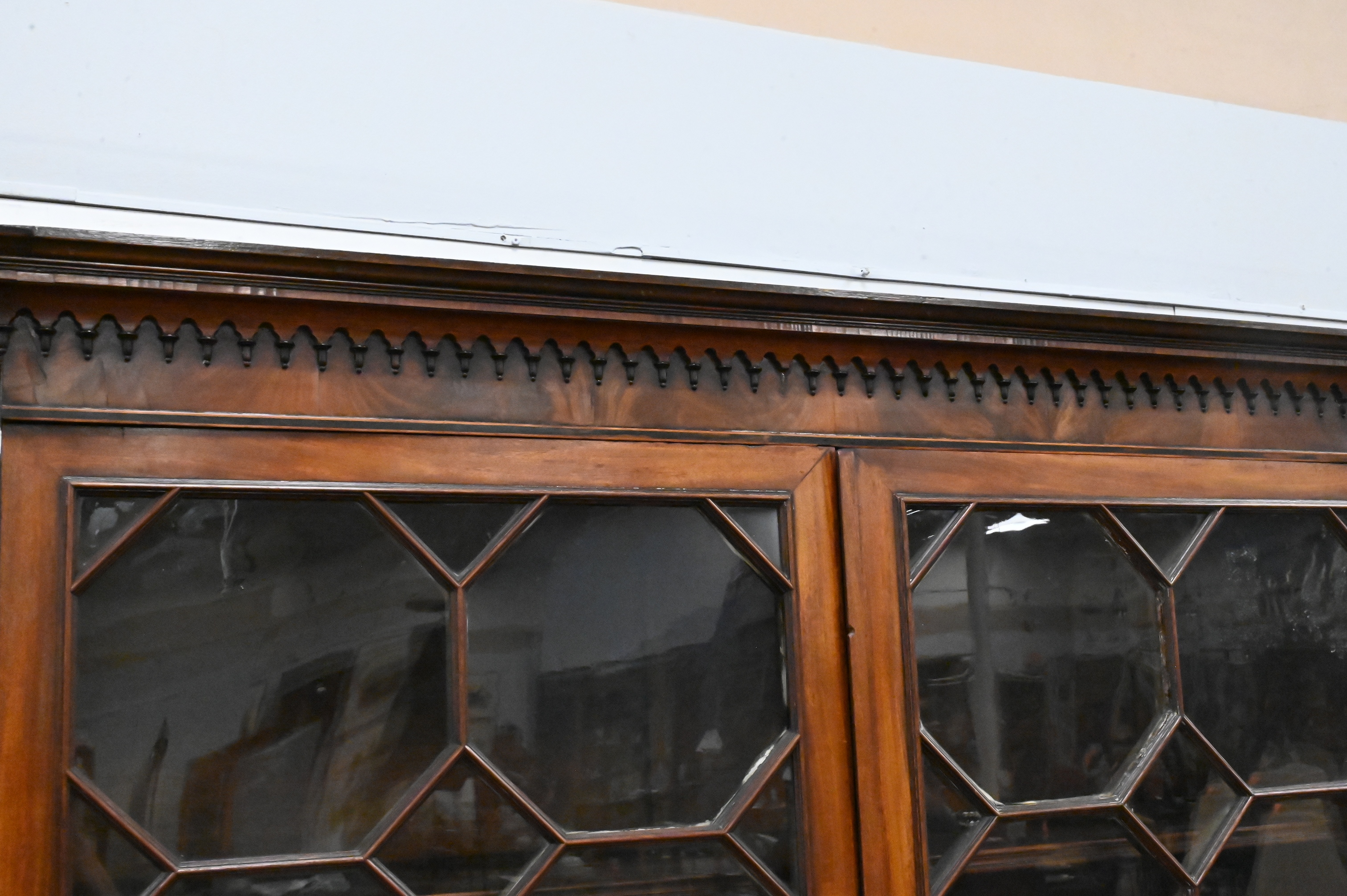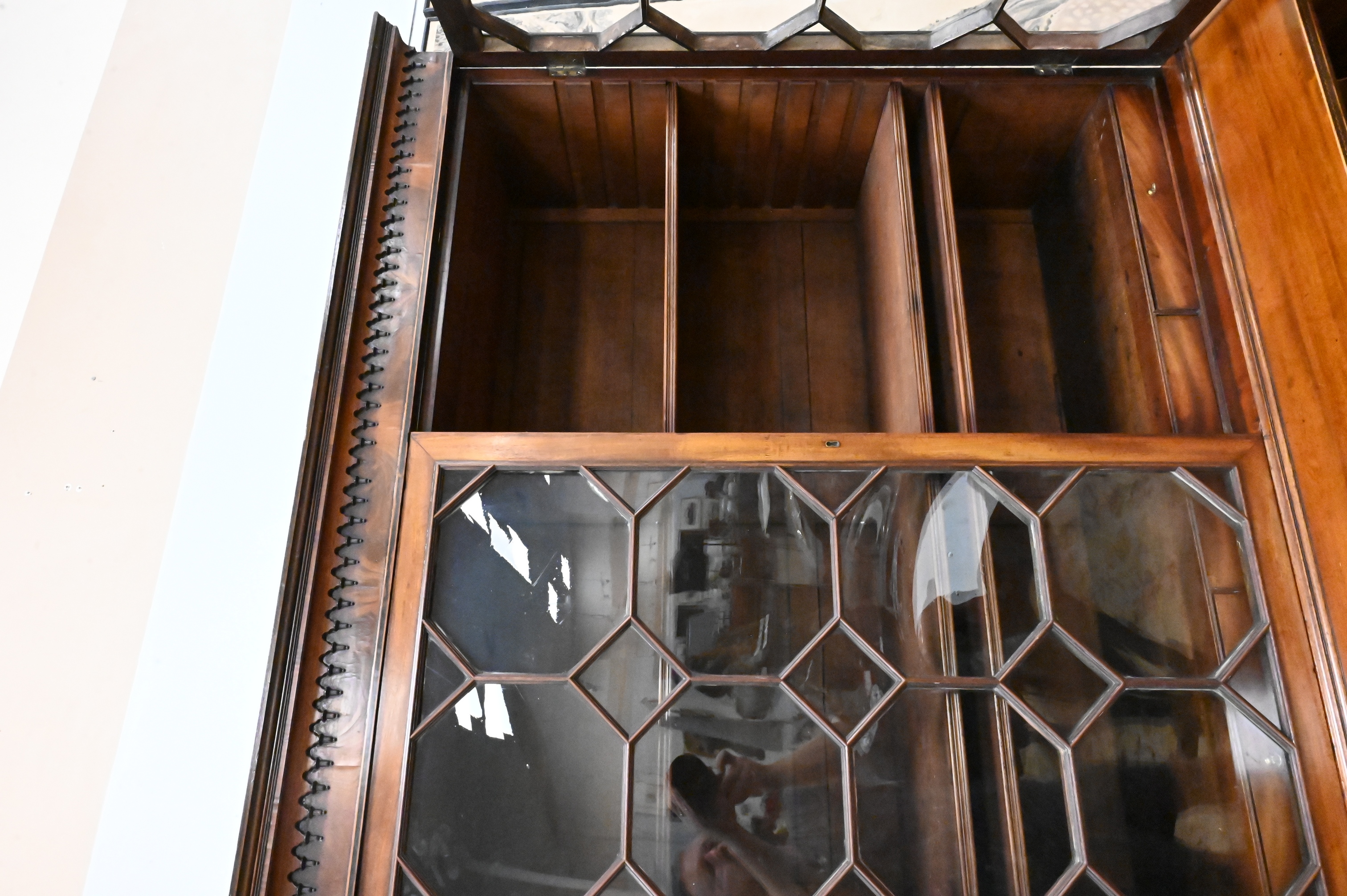 A fine English mahogany secretary bookcase, the upper section with molded cornice above a dentil-carved frieze and a pair of astragal-glazed doors opening to shelves. The lower section fitted with a fall-front secretary drawer opening to a fitted interior, above a pair of cabinet doors with bold circular bookmatched veneer panels, raised on shaped bracket feet.