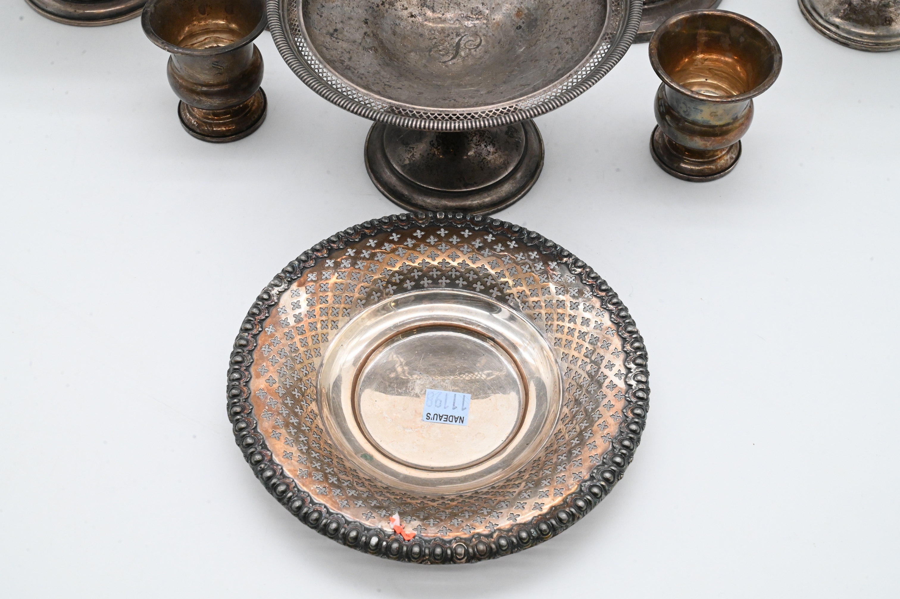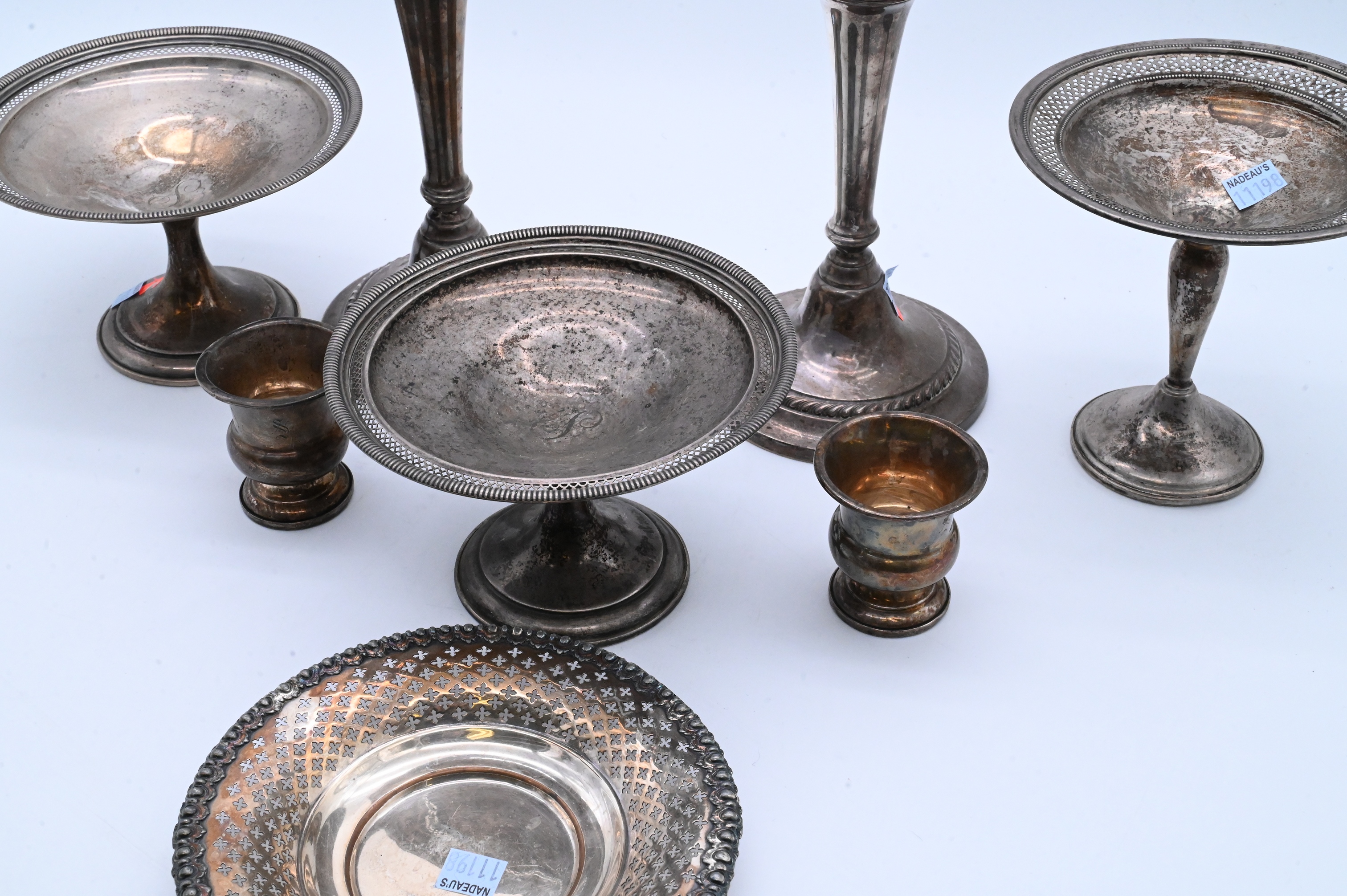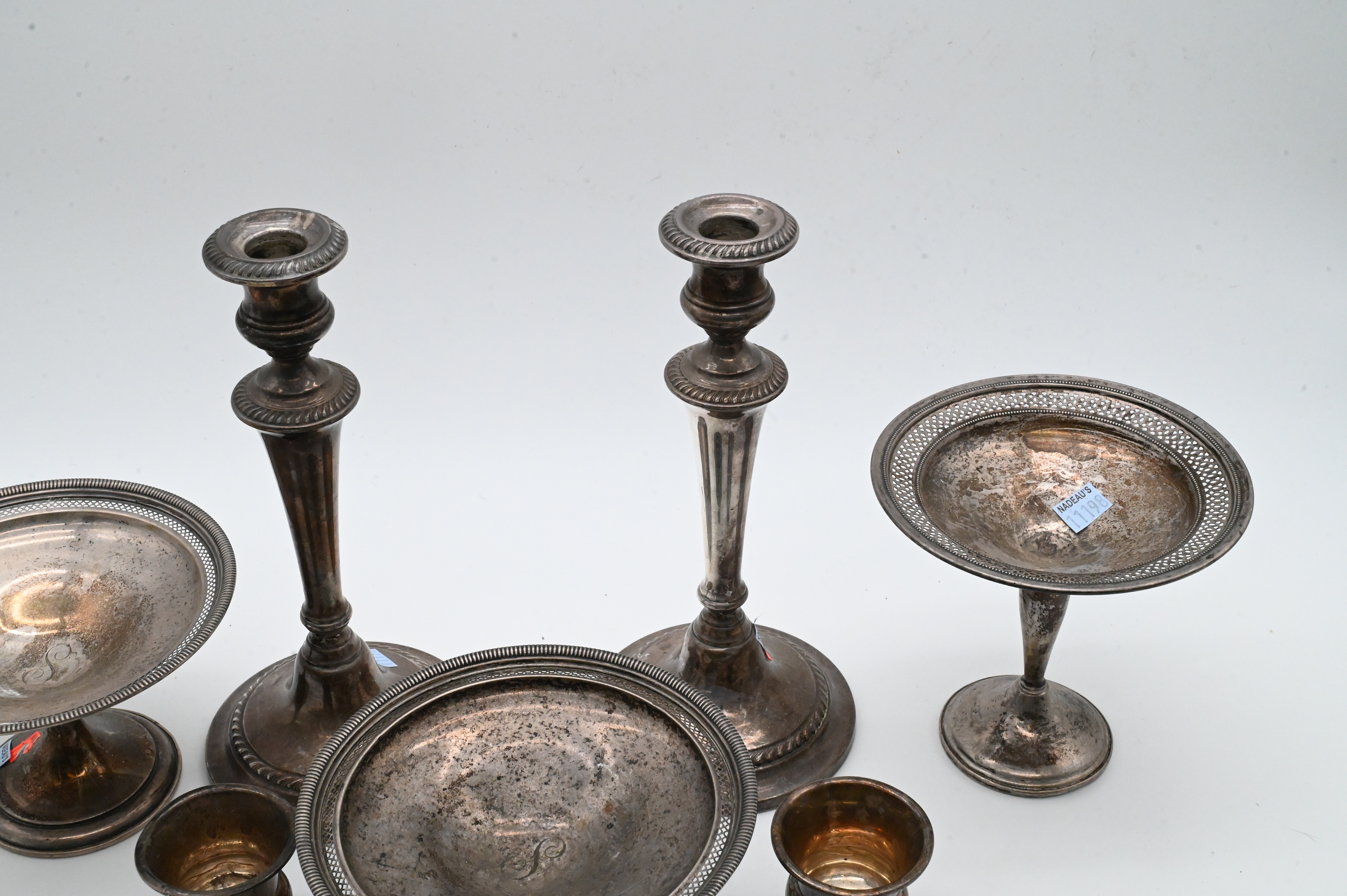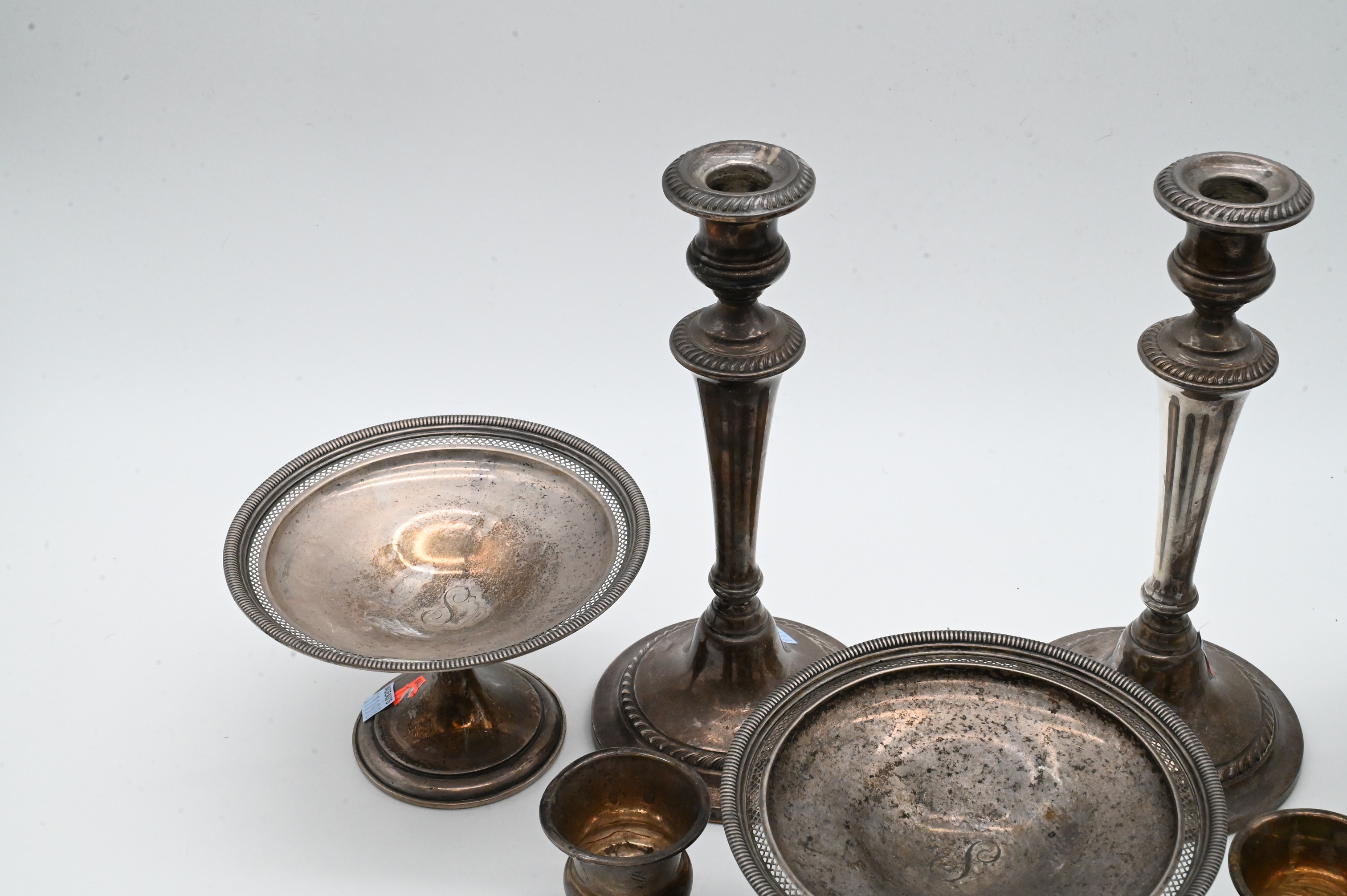 to include a pair of Gorham candlesticks, three compotes, and a pair of cups along with a circular silver plate tray
