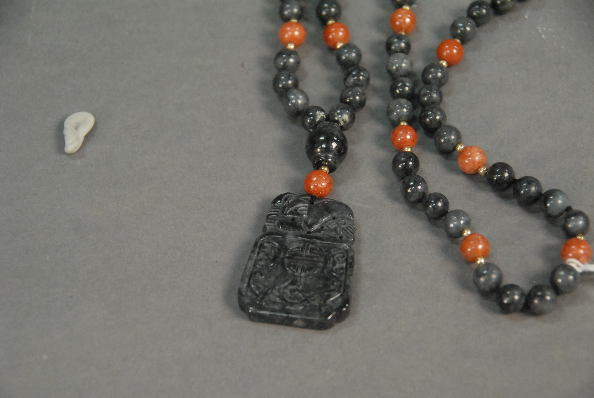 Lot 33: Jade necklace made of grey and gold beads with salmon color beads and carved grey jade pendent.