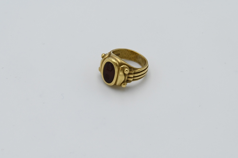 Lot 33: Kieselstein-Cord 18 Karat Gold Ring, set with oval red stone with sun and moon, size 4 3/4, 16 grams.