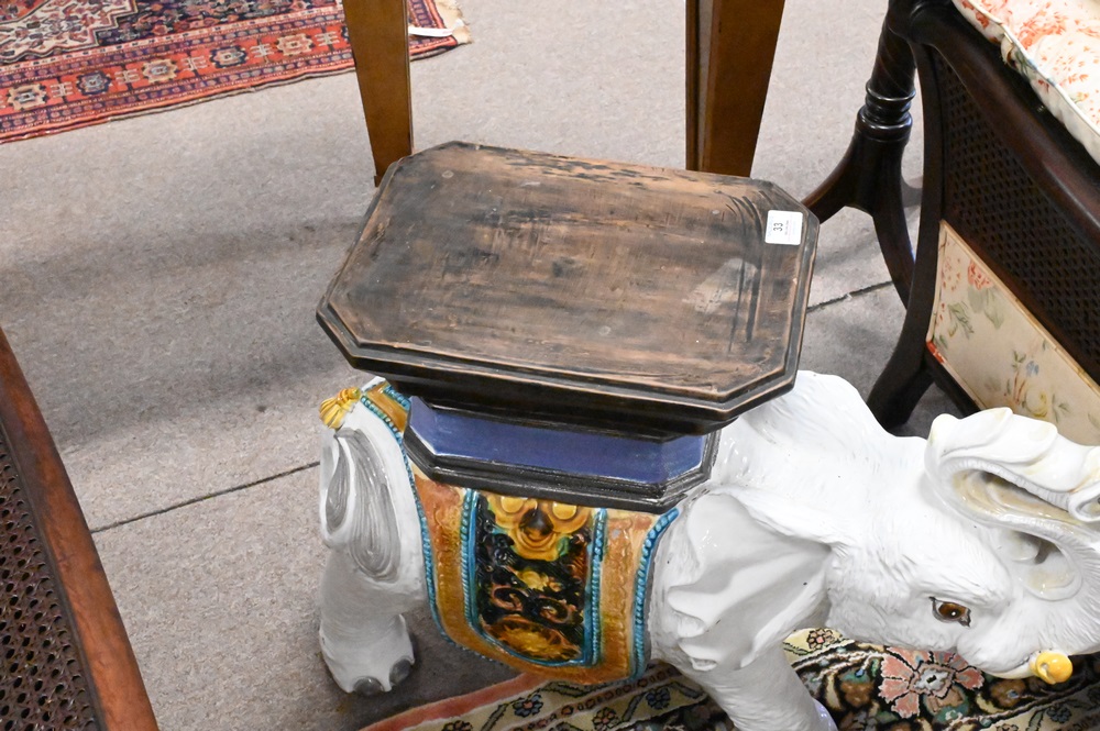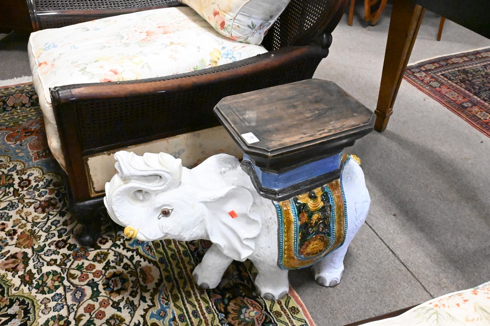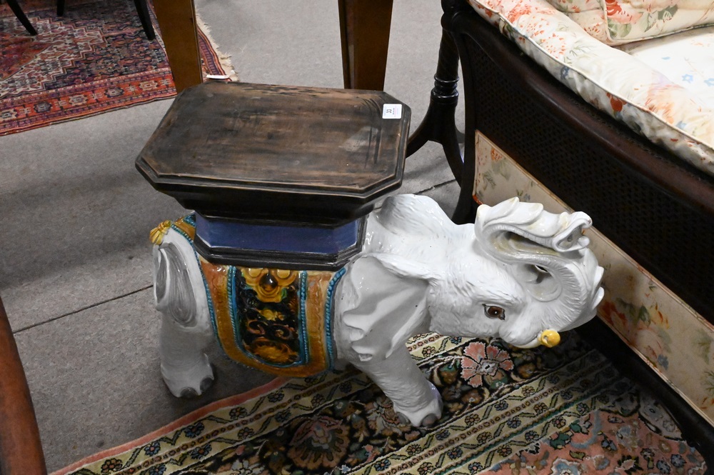 Majolica/Earthenware Elephant Garden Seat, height 21 1/2 inches, length 28 inches.