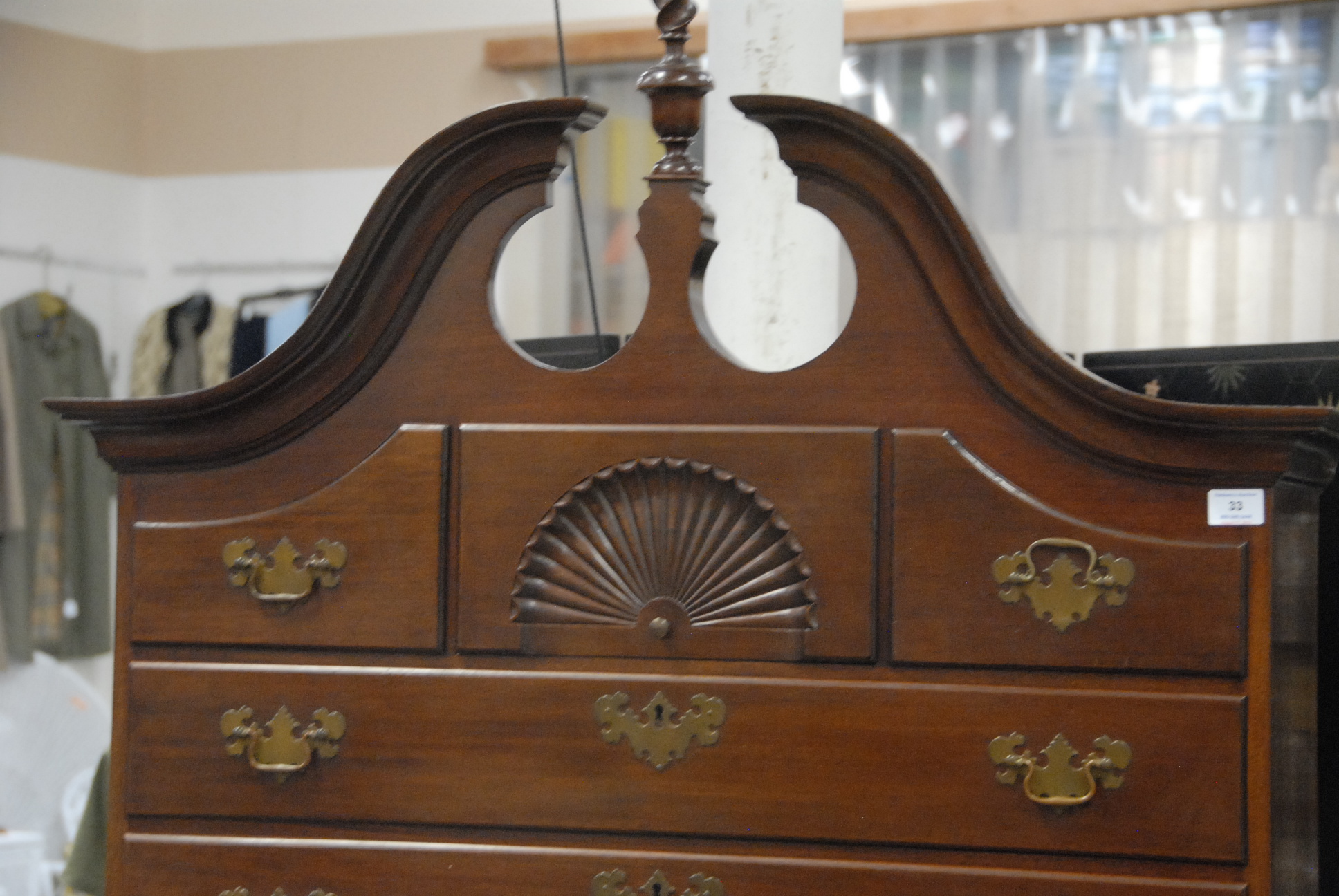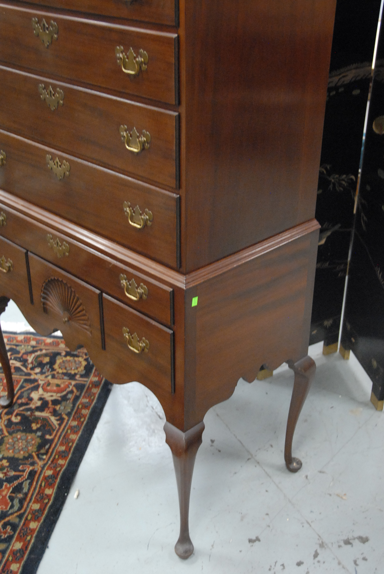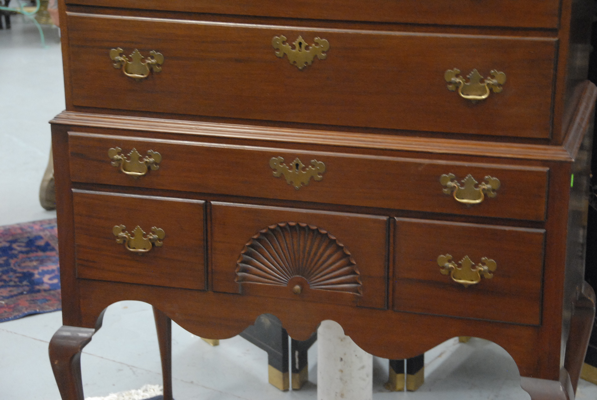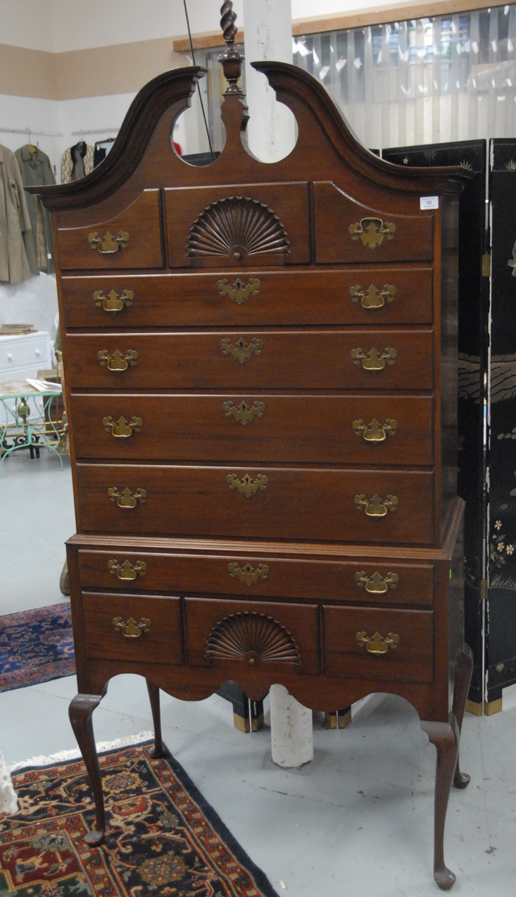 Margolis mahogany highboy with broken arch top with Queen Anne legs and pad feet.
