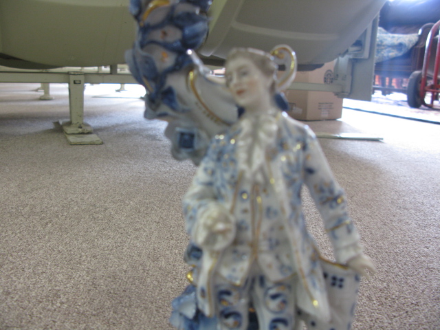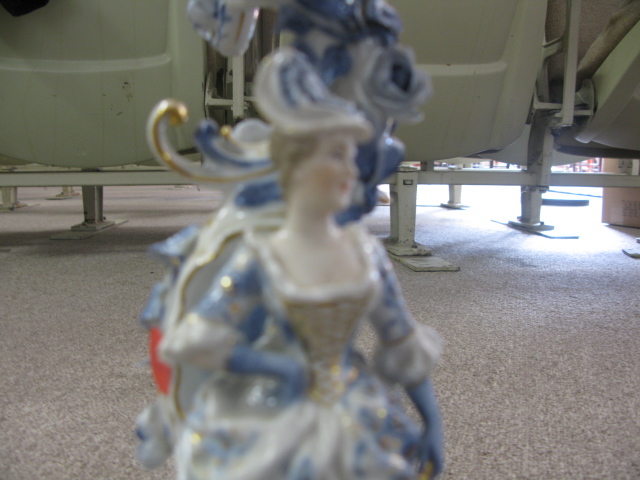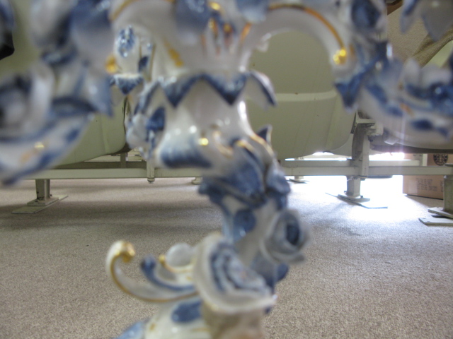 Pair of blue and white German porcelain candle holders with figural bases, minor damage