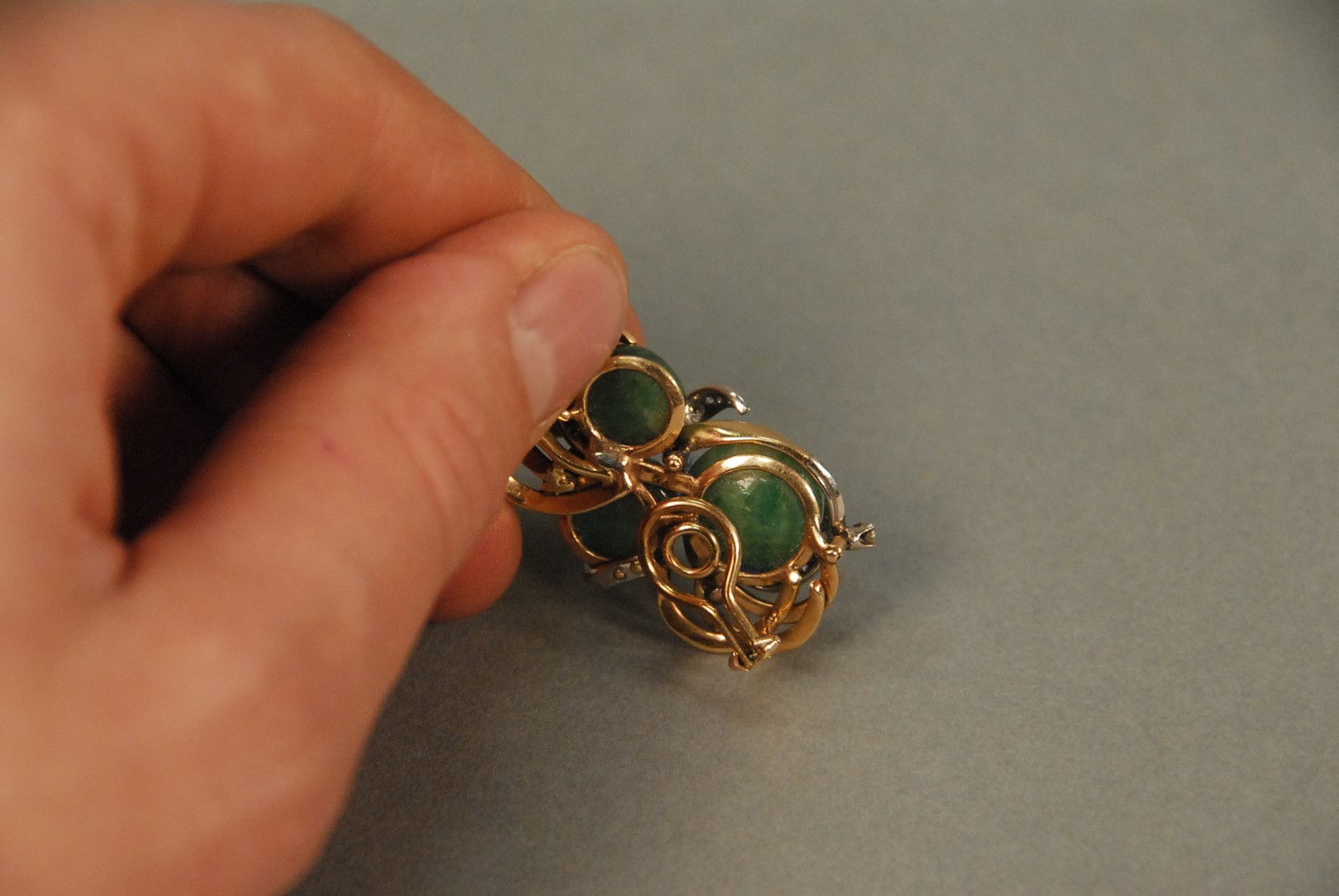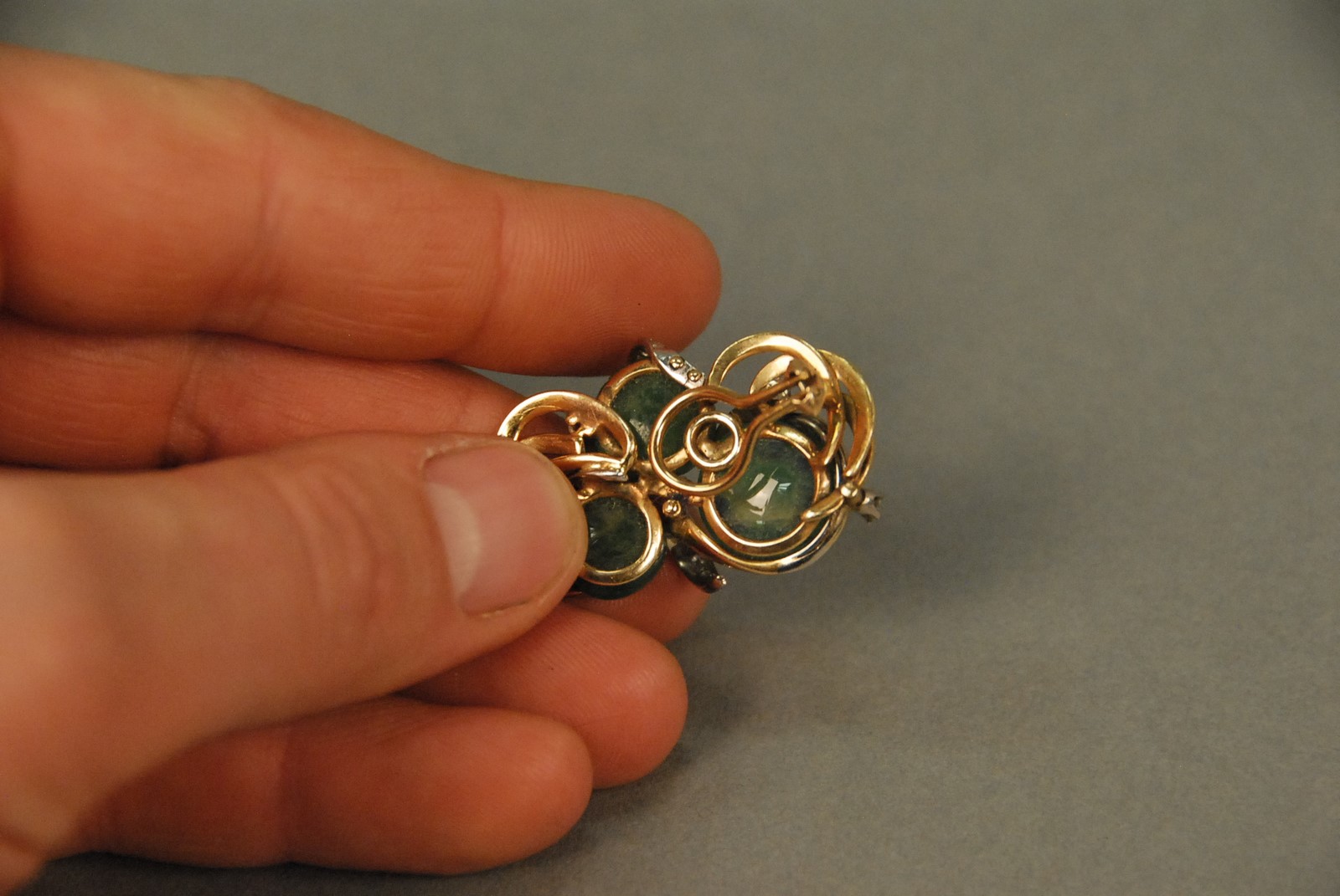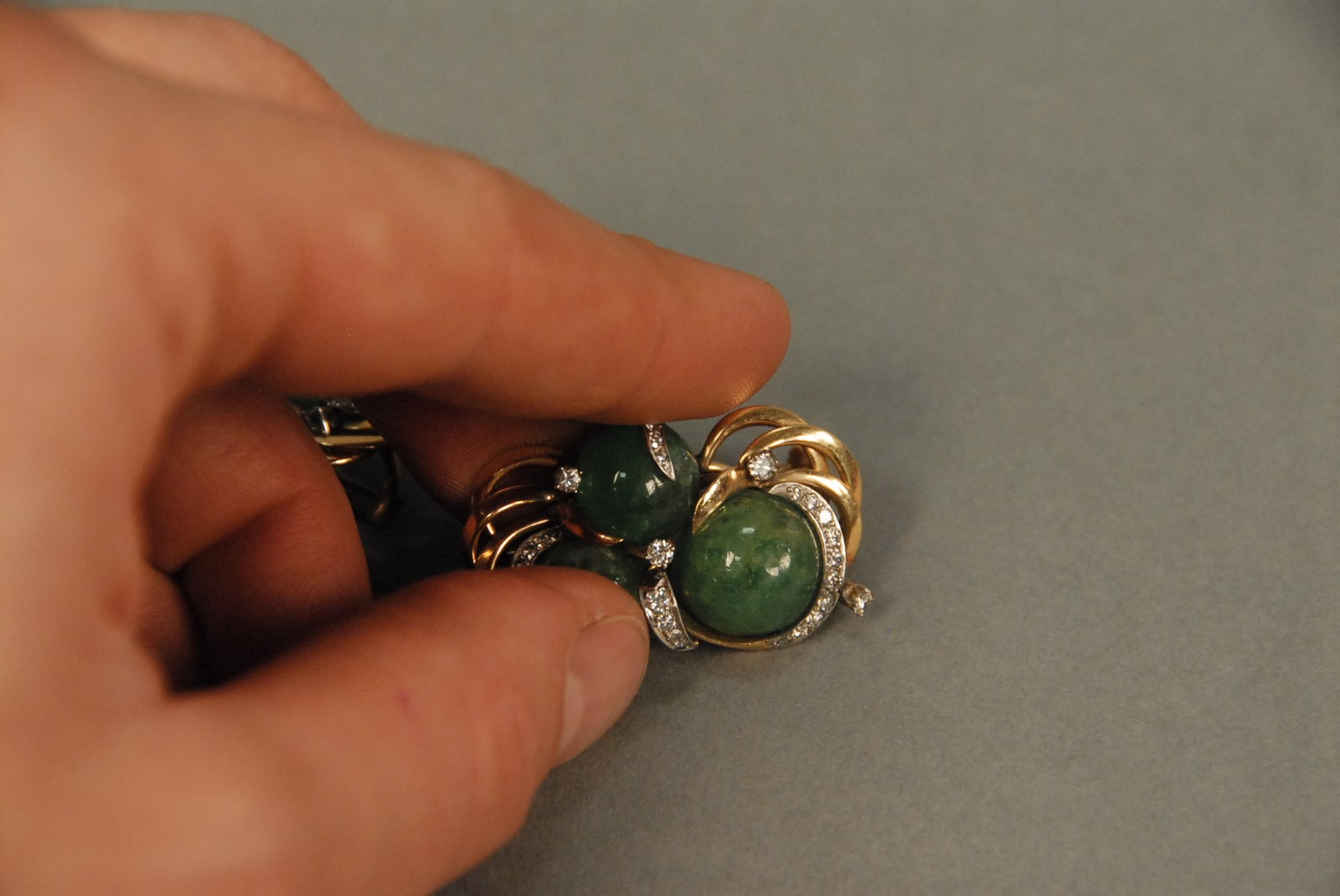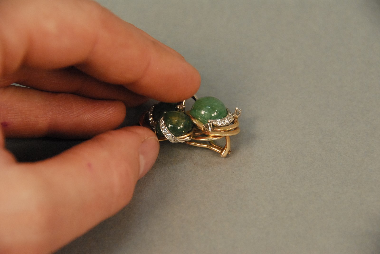 Lot 33: Pair of gold earrings with clip fittings, each set with three cabochon cut emeralds and small diamonds. lg. 1 1/2 in. Provenance: Property from a Private Collection Sold for the Benefit of the Virginia Historical Society.