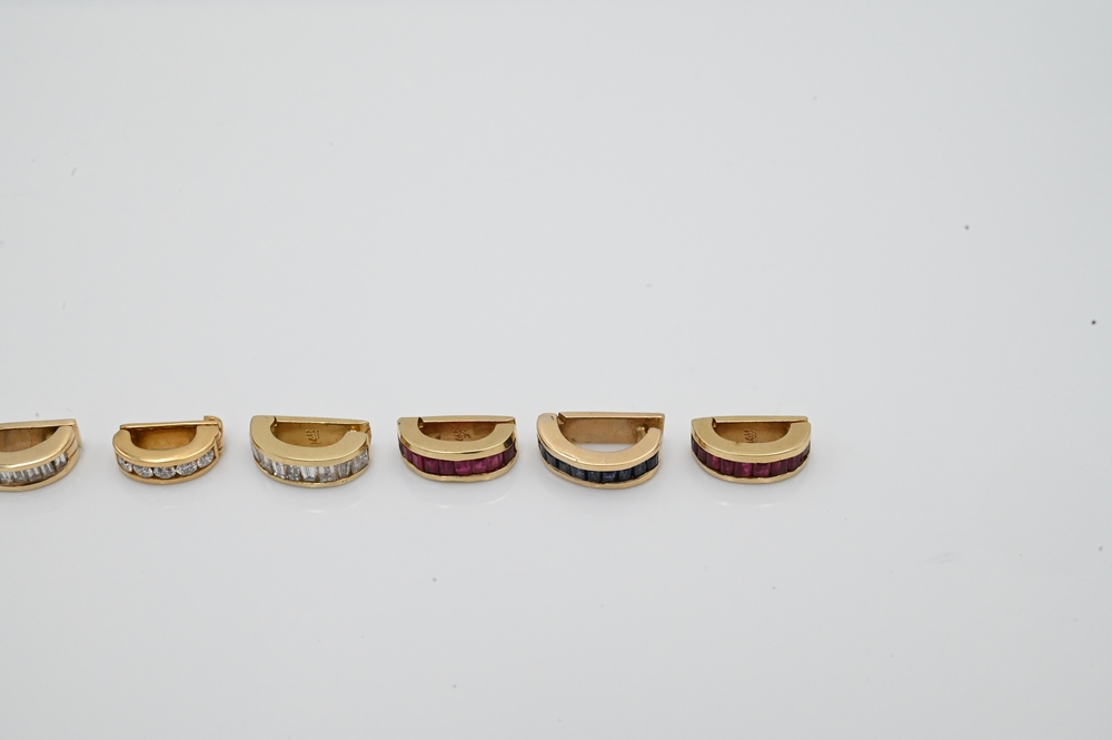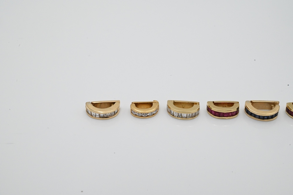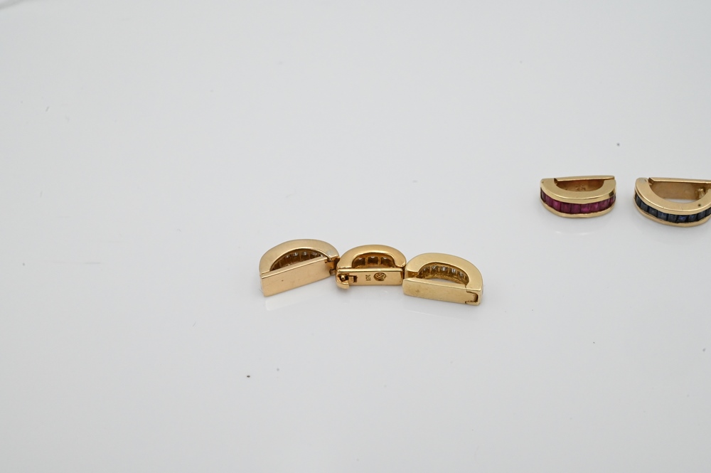 Three pairs of Small Earclips, one set with diamonds, one with blue stones, one with pink stones, 9.4 grams.