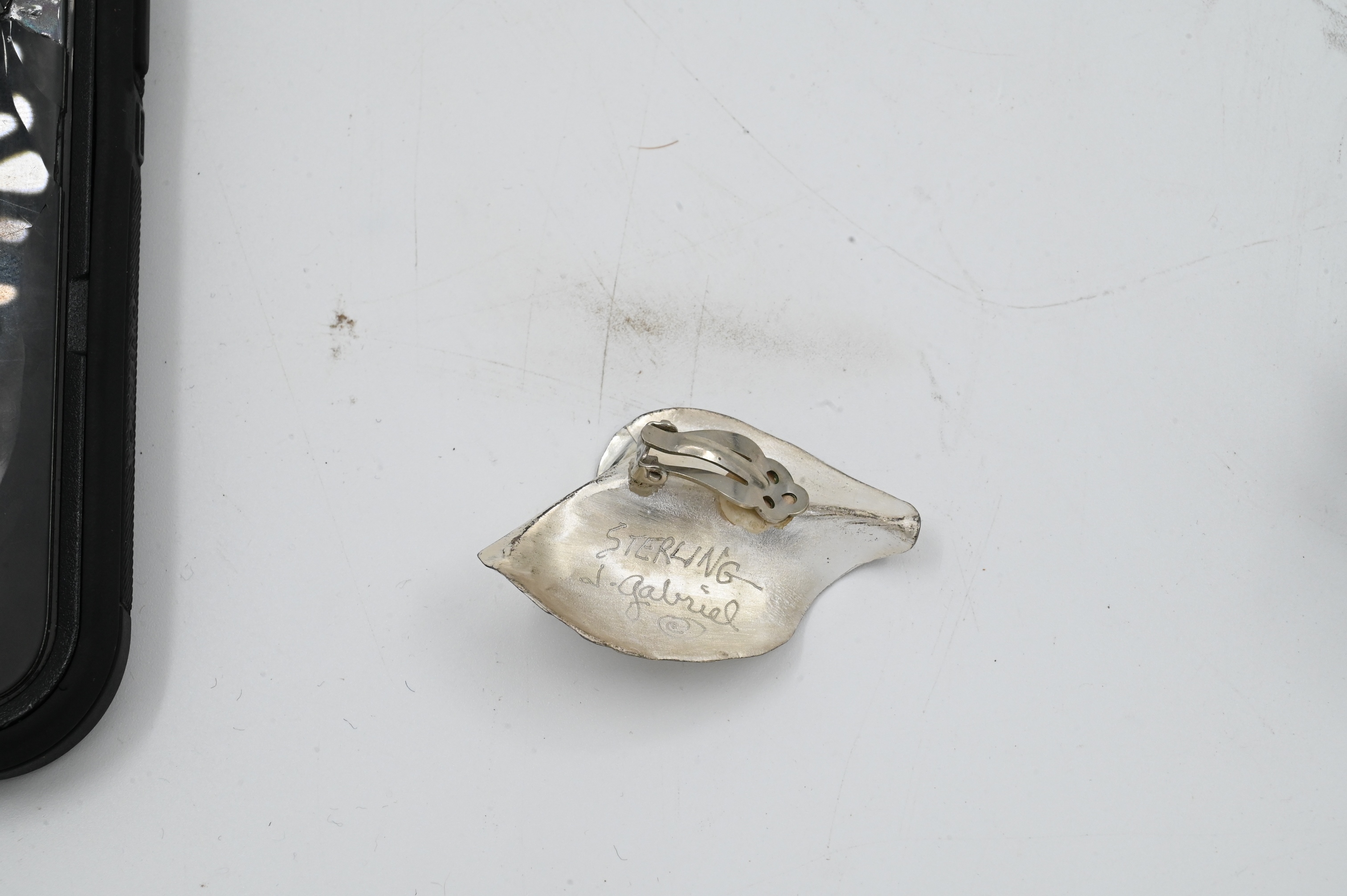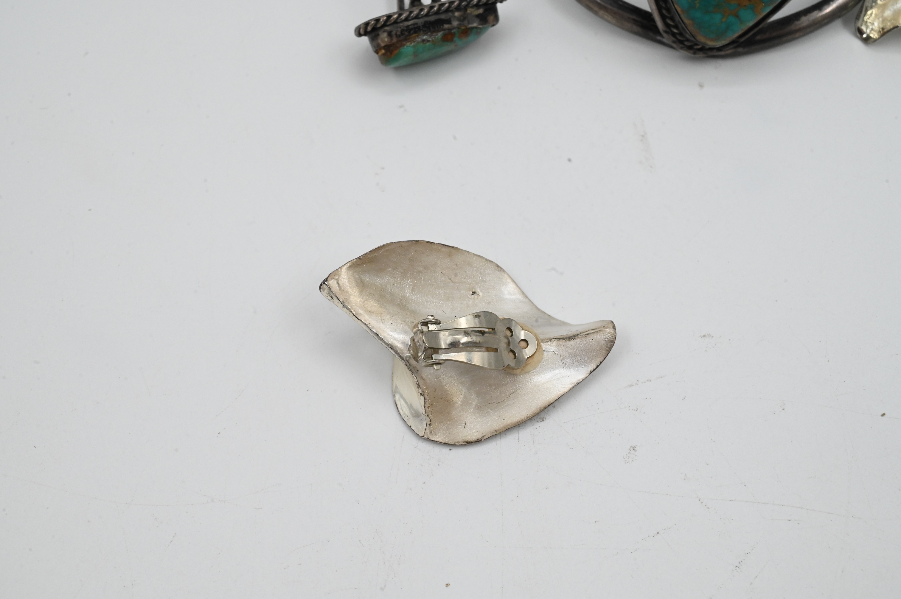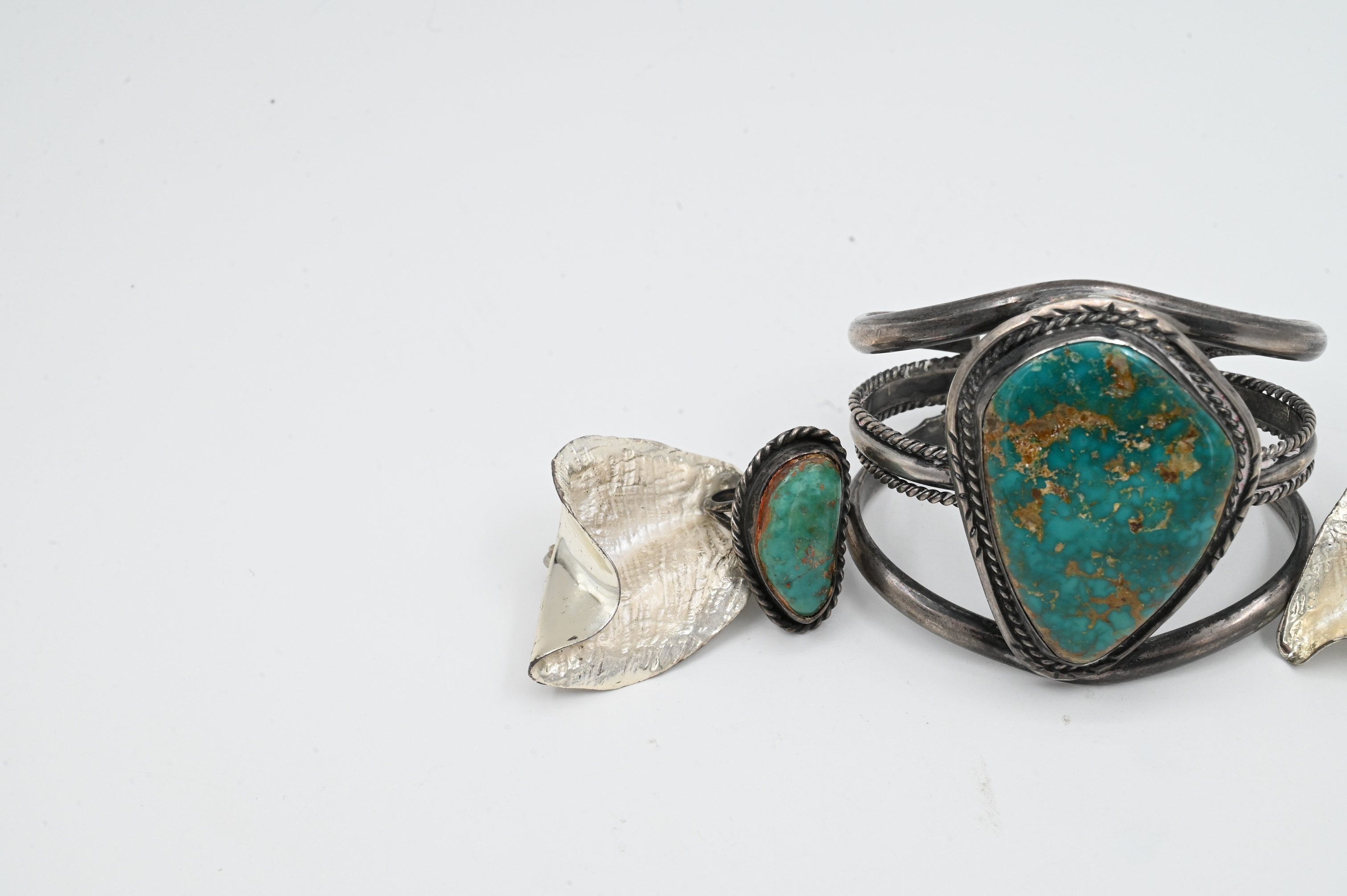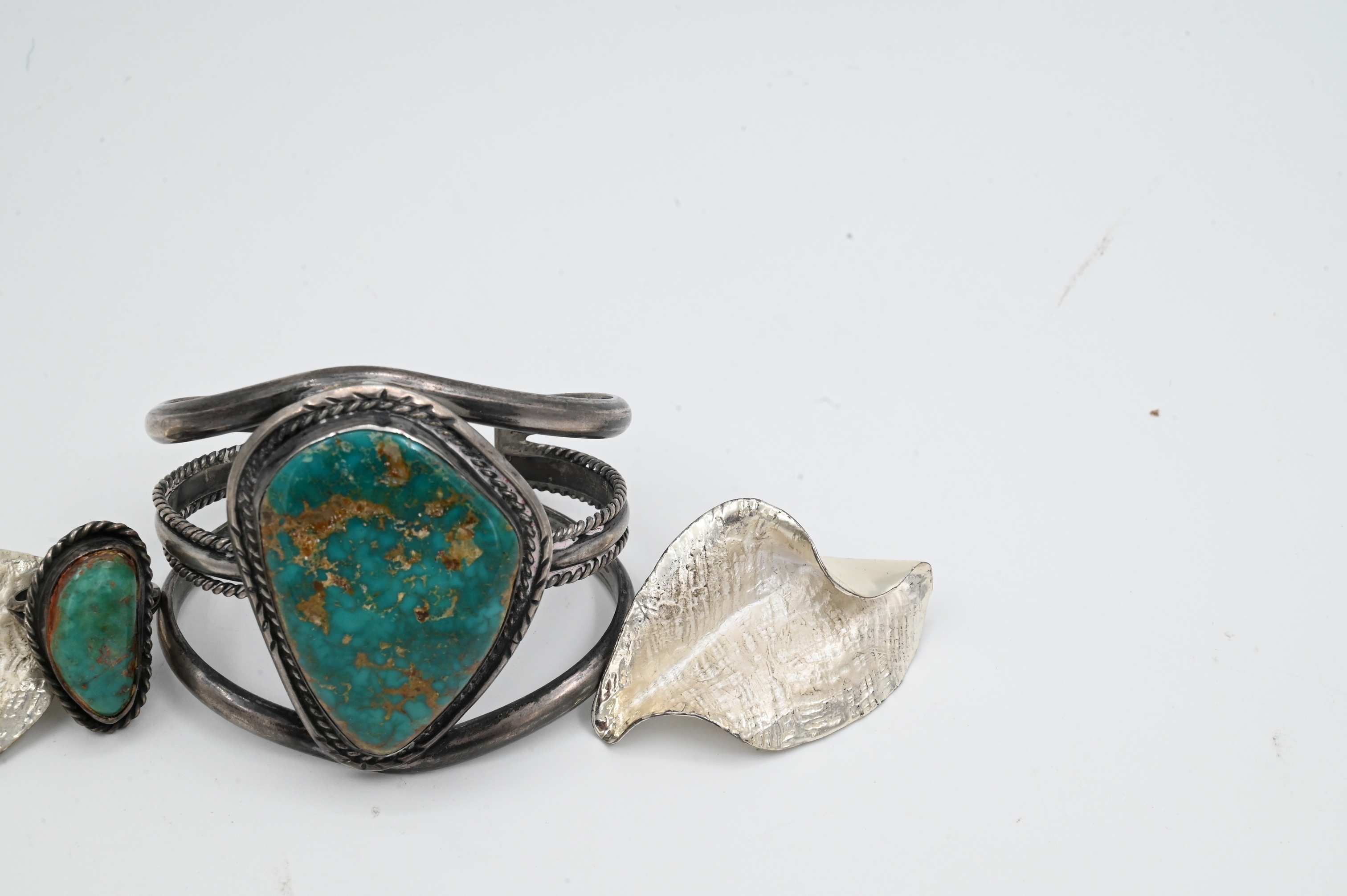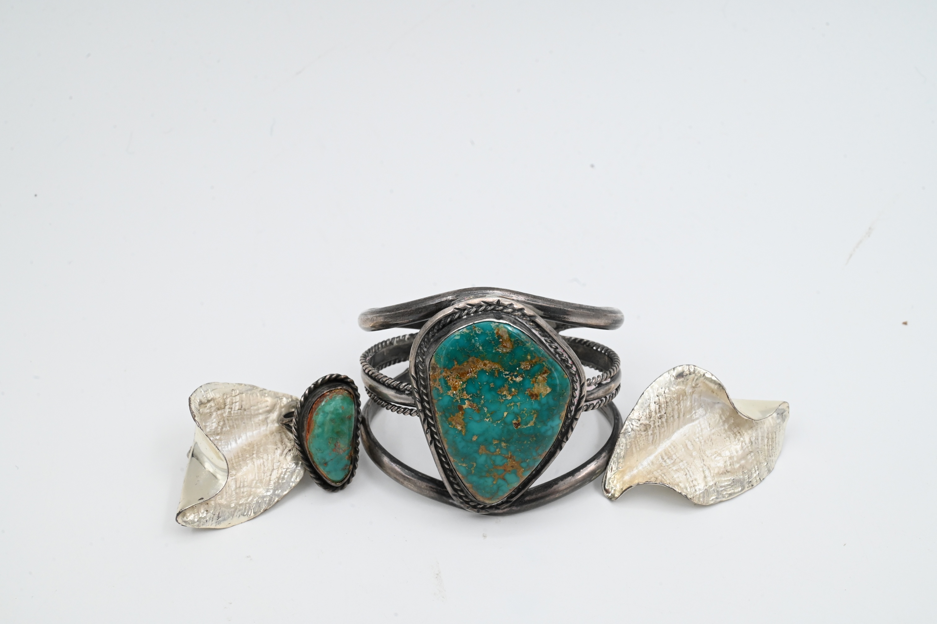 Sterling Silver and Turquoise Bracelet and Ring, J. Gabriel Pair of Sterling Silver Clip Earrings