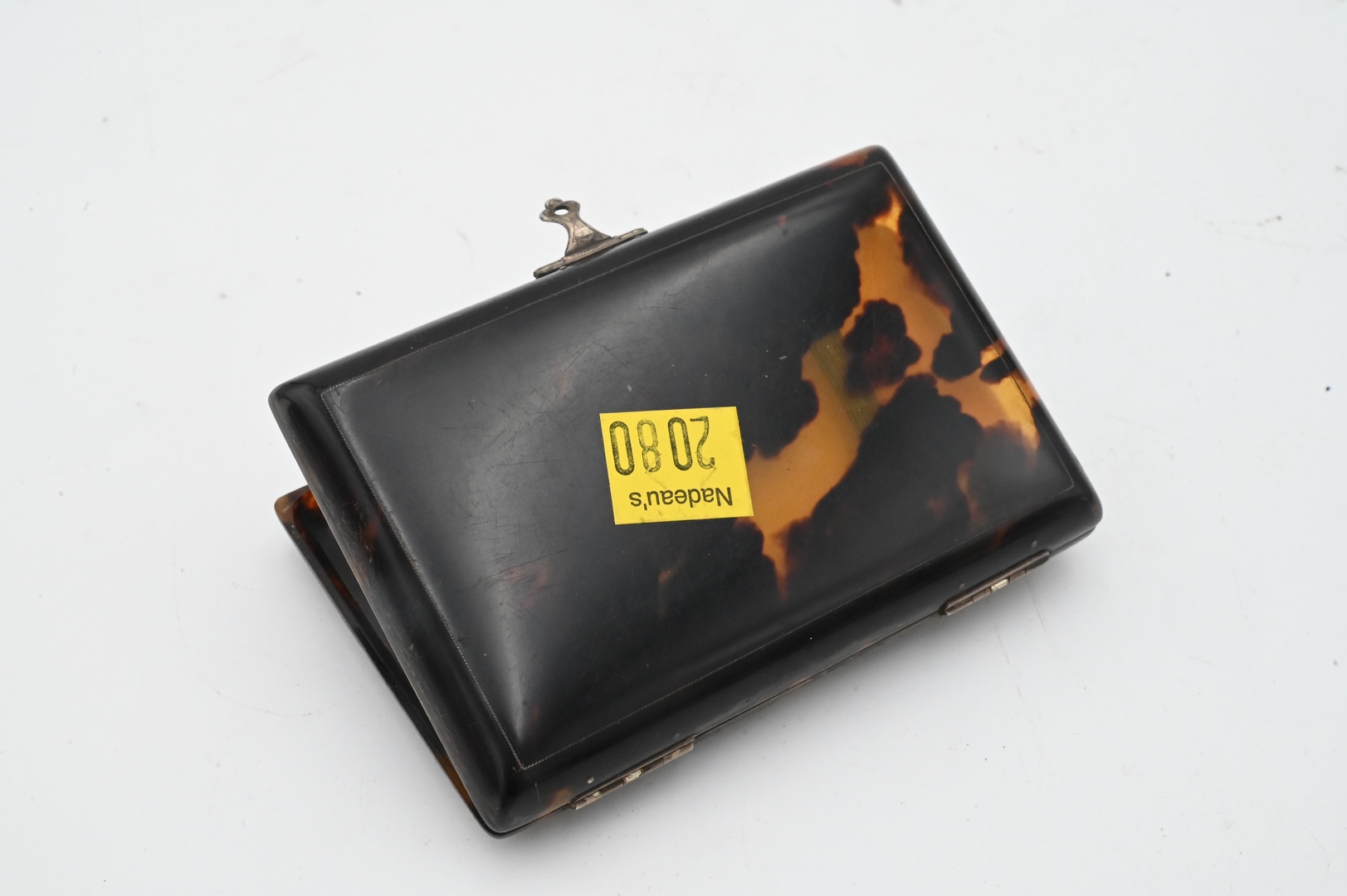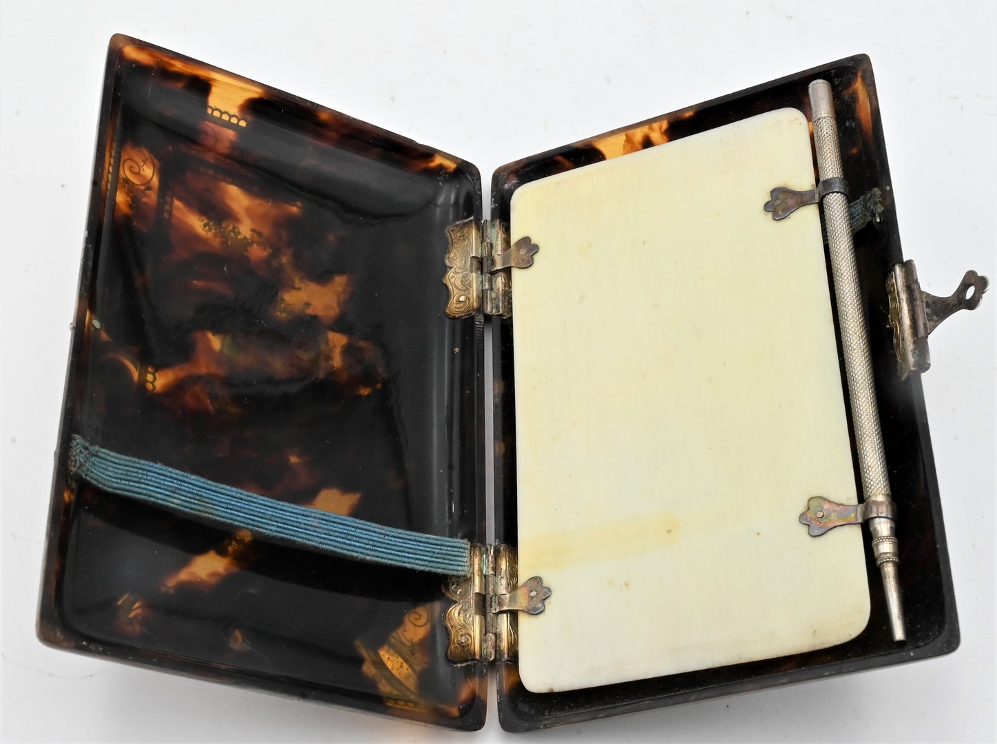 Tortoise Shell Box, inlaid with gold and tablet inside, along with silver pencil, 19th century, 2 3/4″ x 4 1/8″. (This item cannot be purchased or shipped by bidders residing outside of the United States or California, Hawaii, Nevada, New Jersey, New York, Washington, Oregon, or District of Columbia. If this item is purchased by a bidder in one of the above mentioned locations or attempts to ship to one of the above mentioned locations, bidder will forfeit the item and be responsible for any incurred fees such as a restocking fee.)