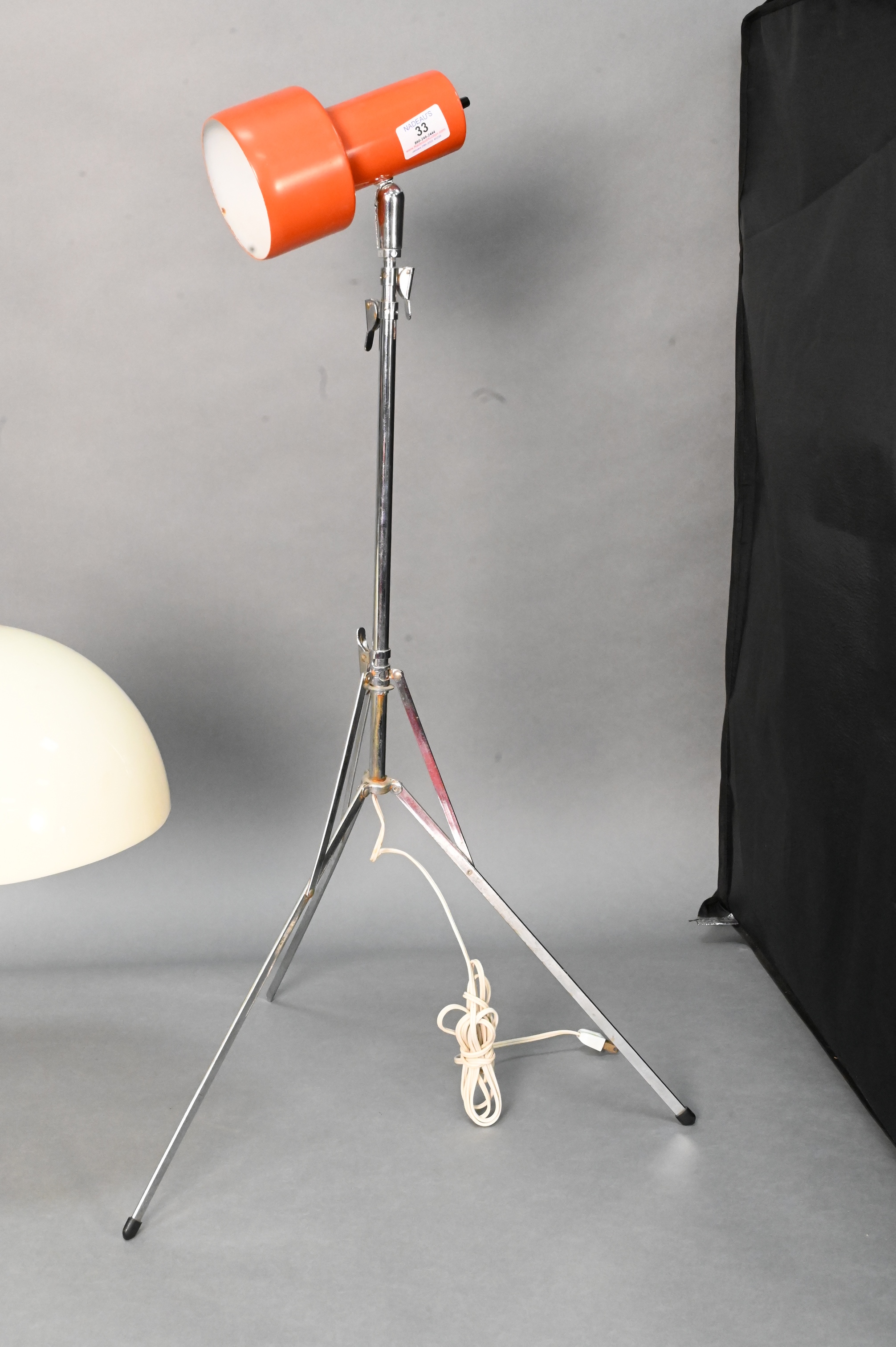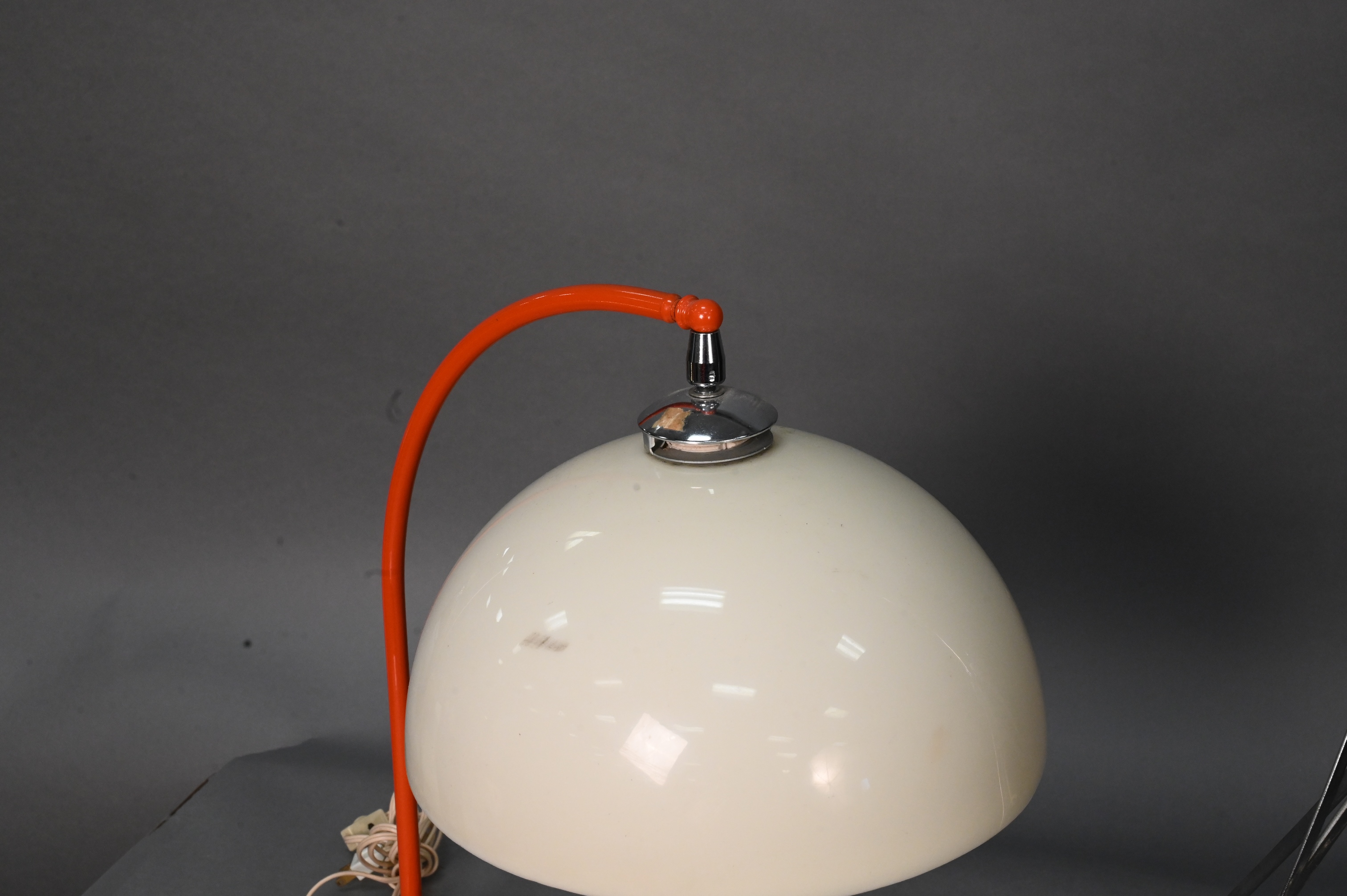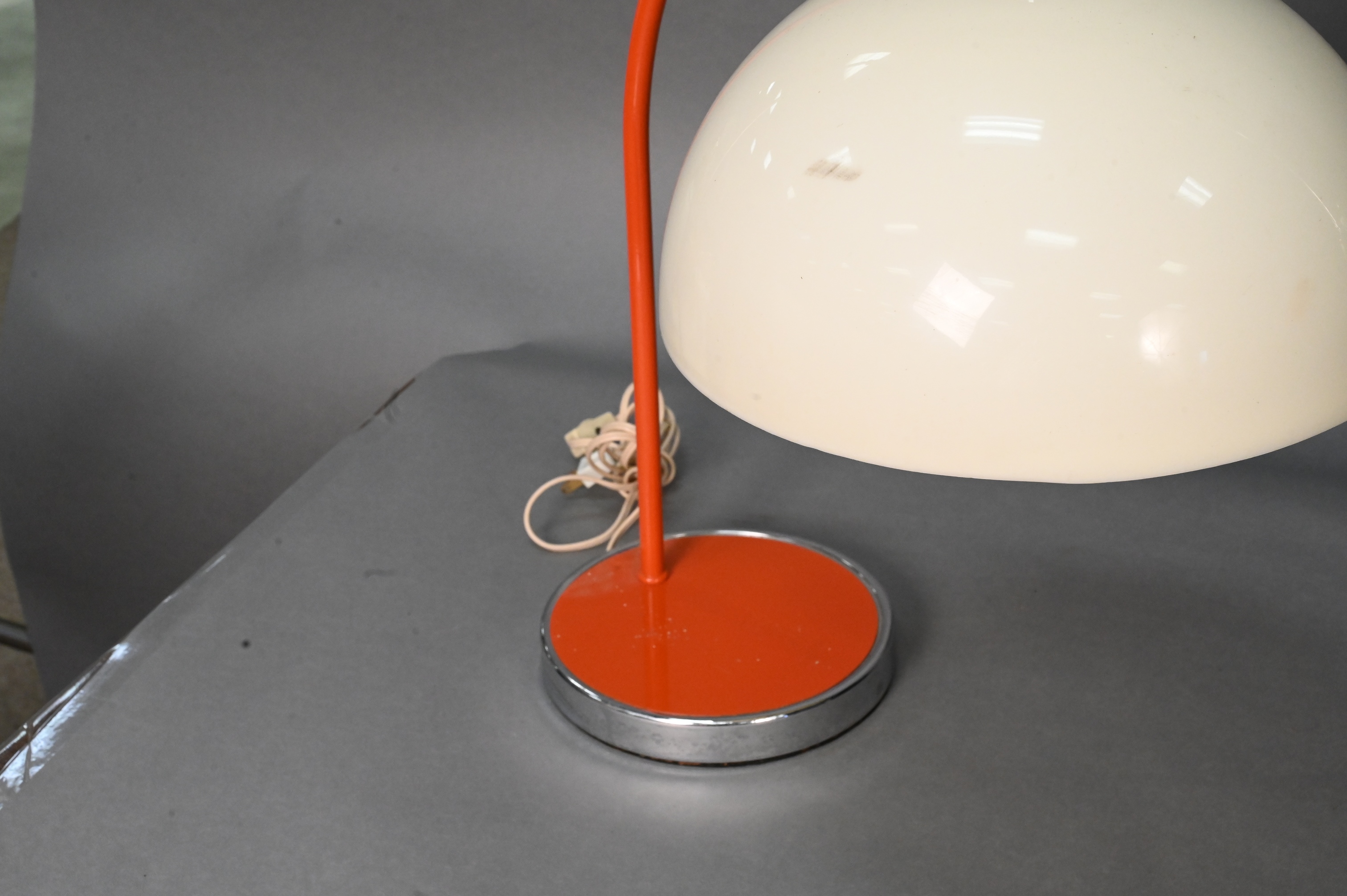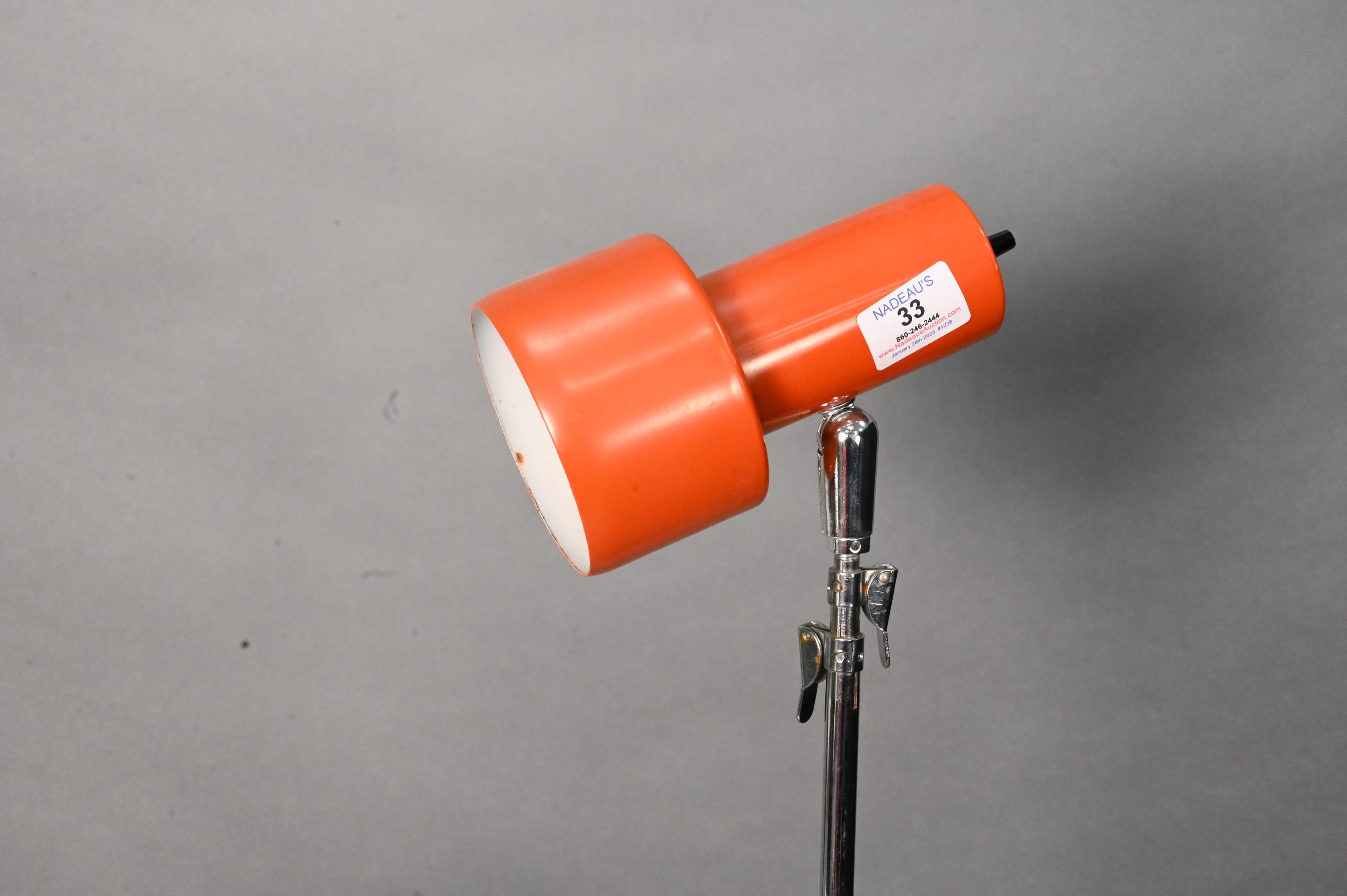 Two Mid Century Modern Table Lamps, to include one having adjustable chrome and orange floor spotlights, with easel base; along with orange desk light with flower pot shade, in the manner of Verner Paton, height 32 inches.