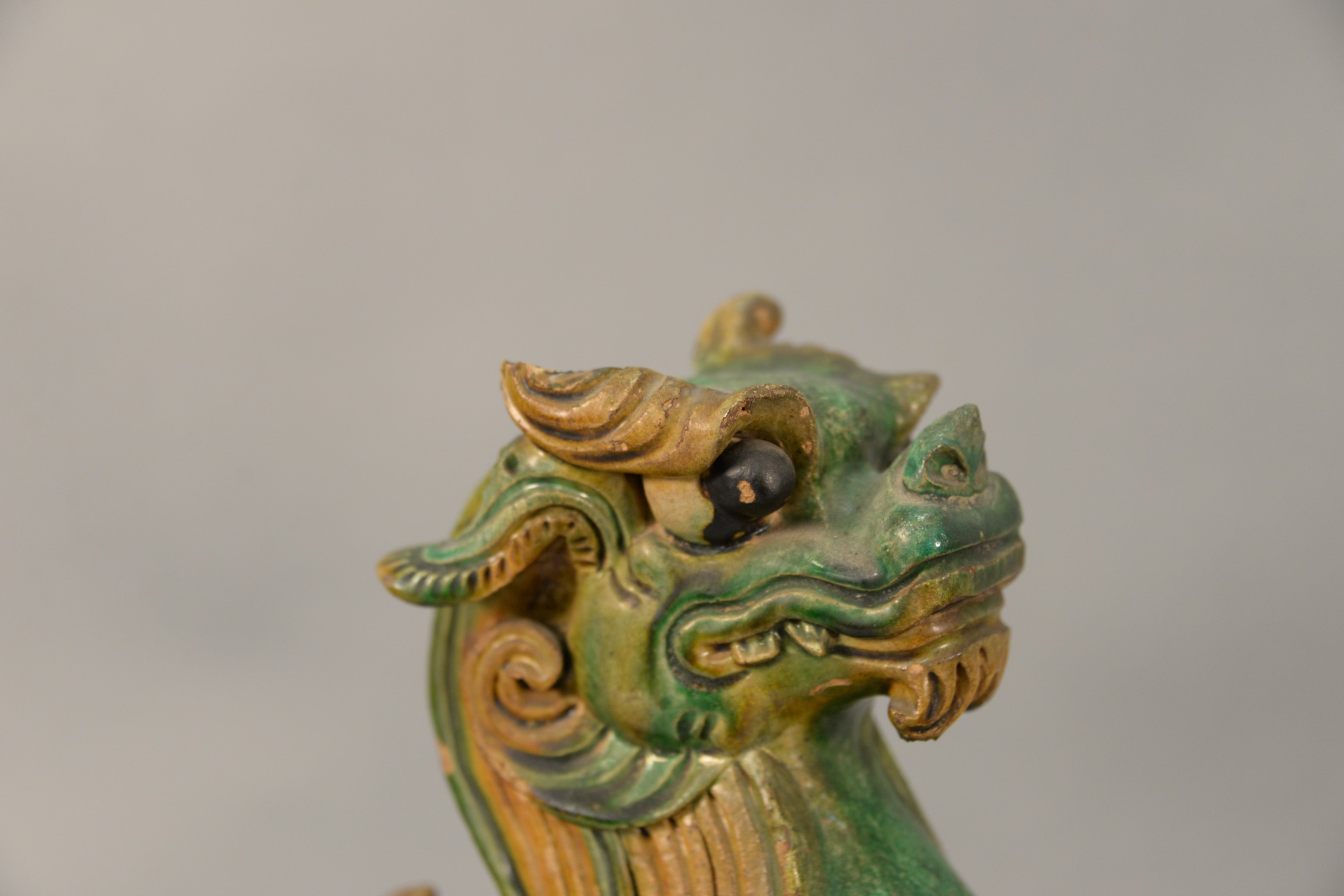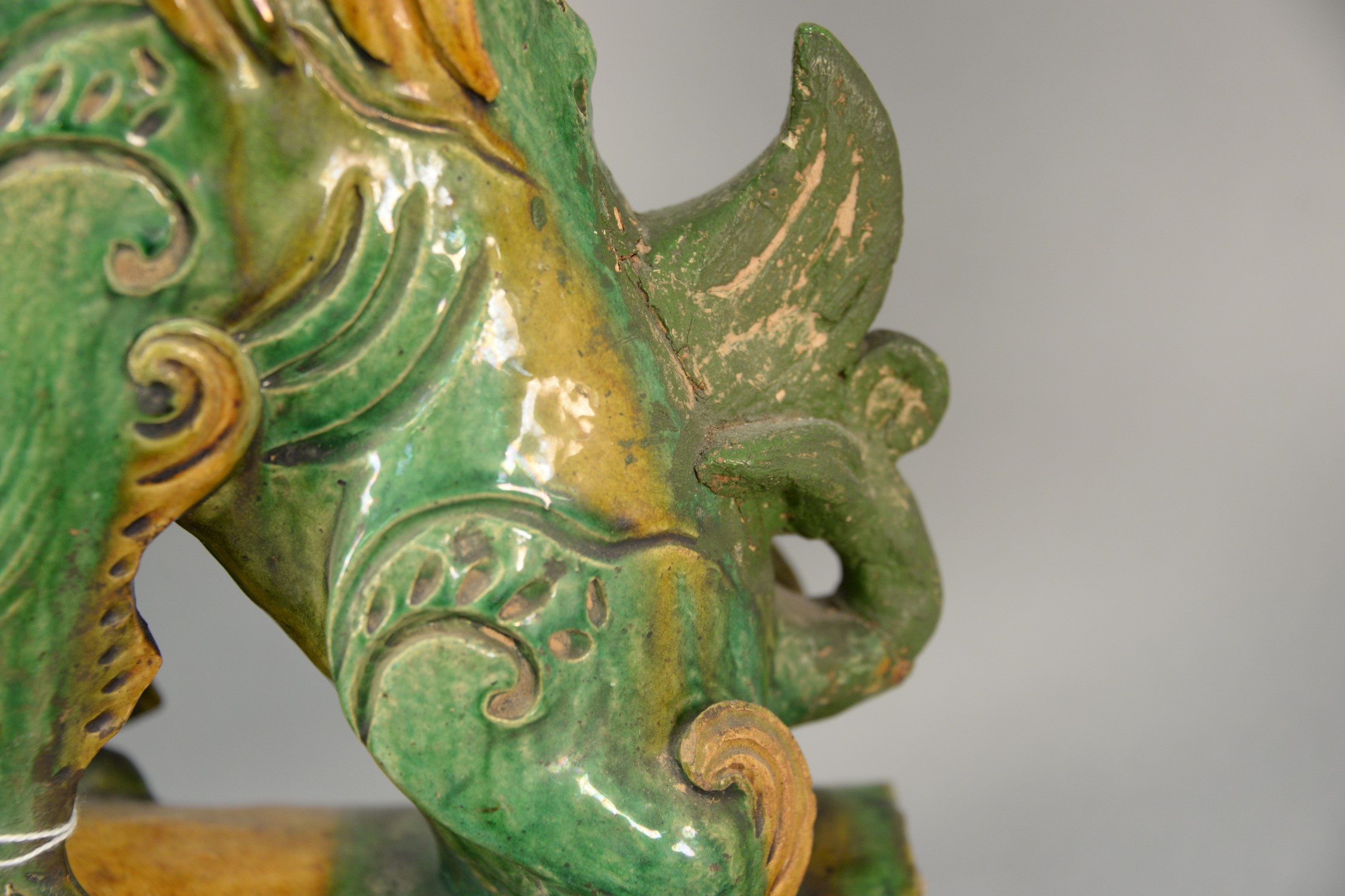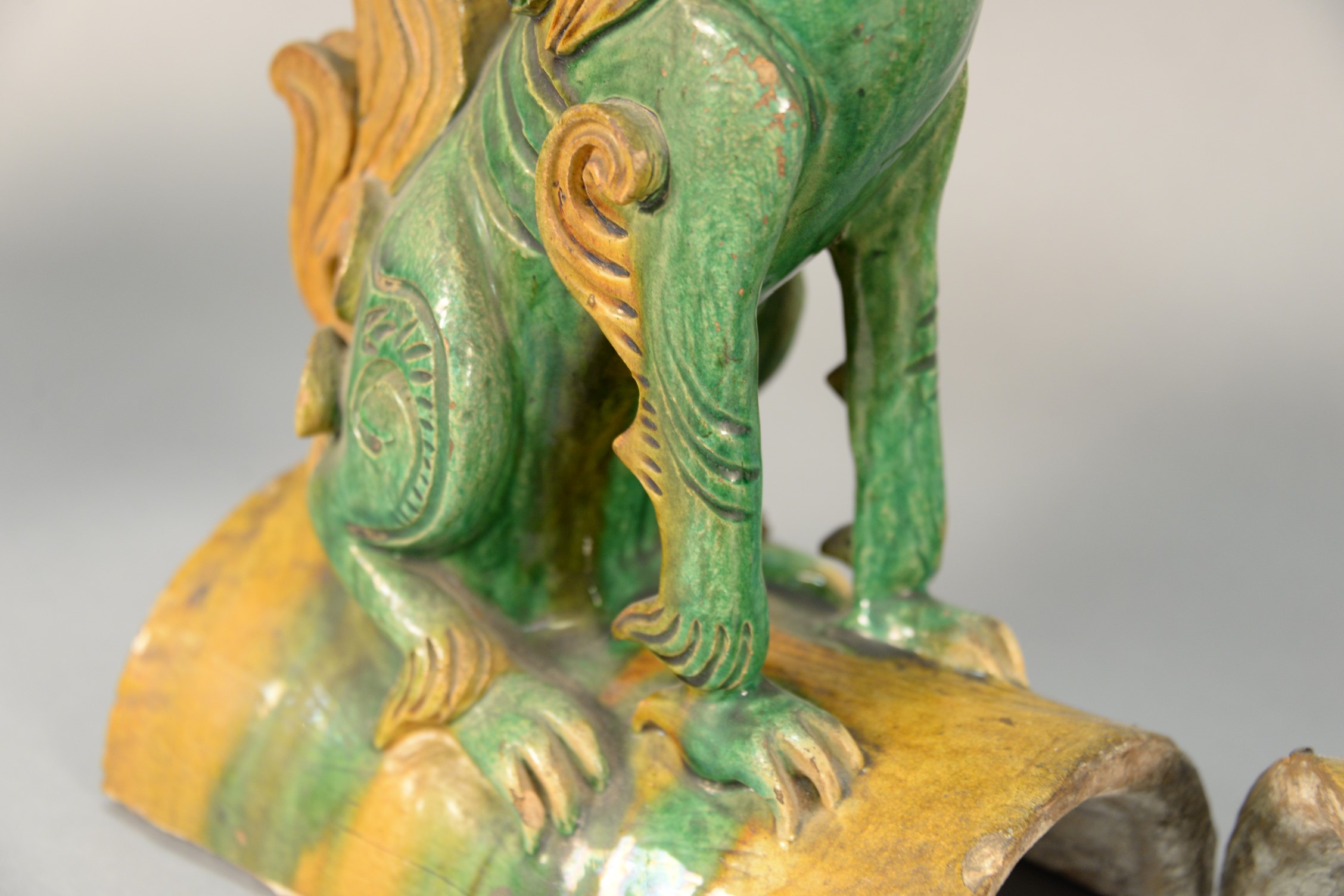 Two pottery roof tiles, each in the form of foo lions seated on convex tile, both in green and yellow glaze, 19th century tail as is, several chips and breaks. ht. 14 in. lg. 9 in. Provenance: The Estate of Natalie Rafferty