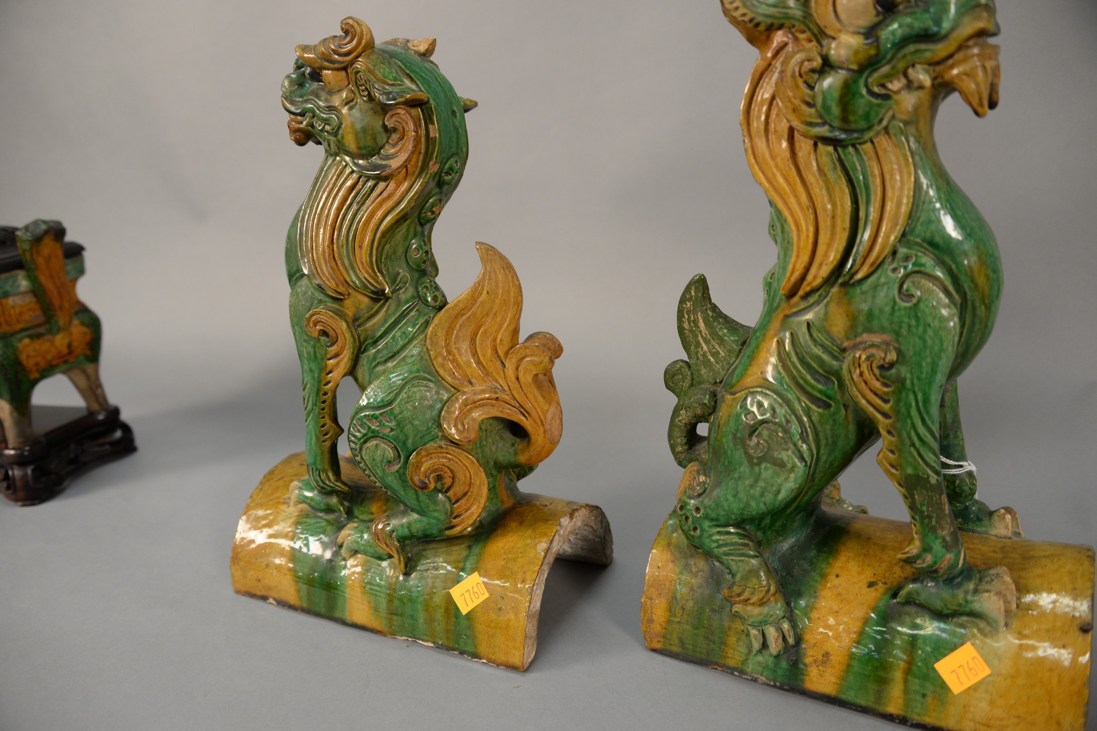 Lot 33: Two pottery roof tiles, each in the form of foo lions seated on convex tile, both in green and yellow glaze, 19th century tail as i…