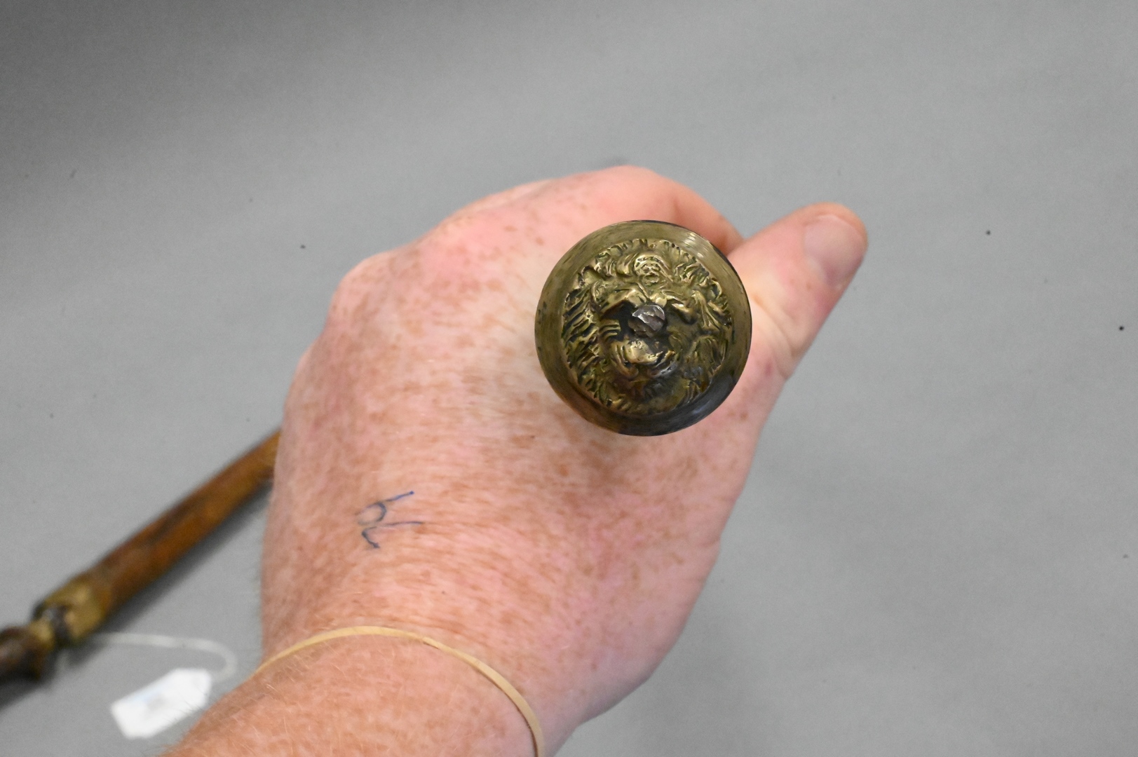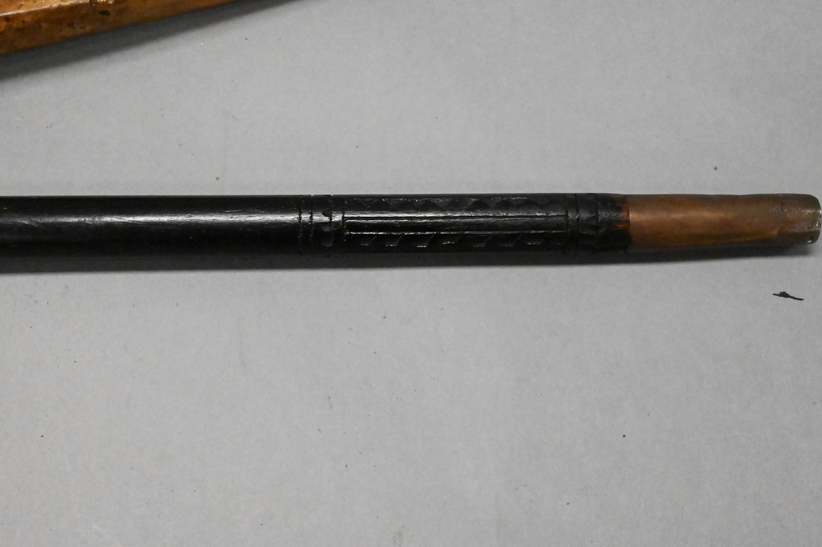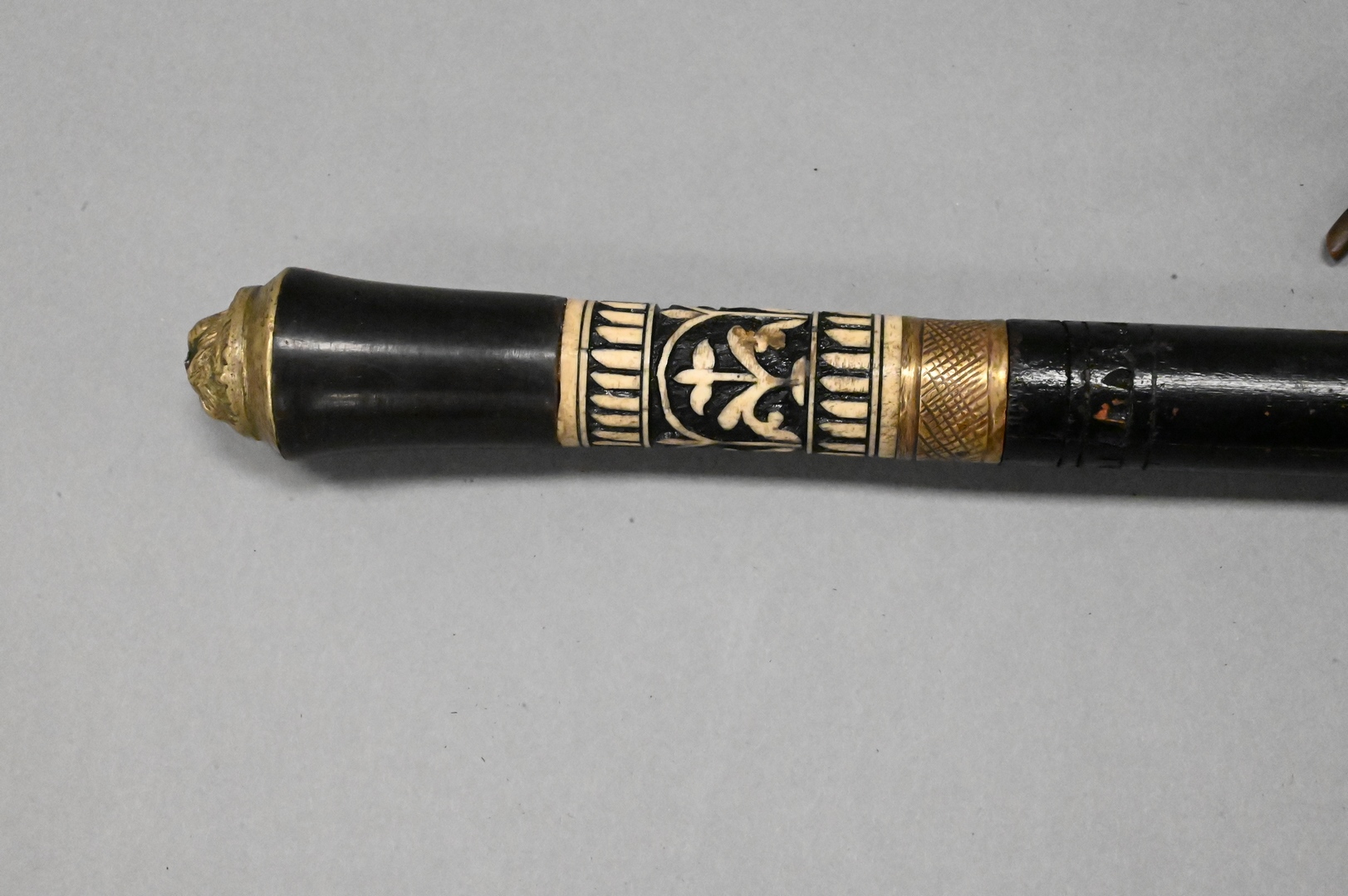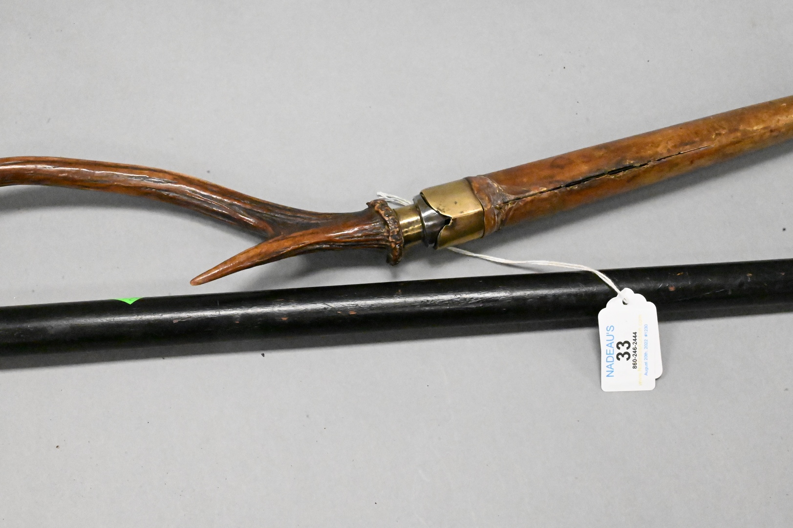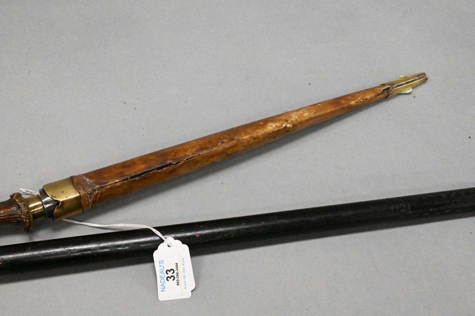 Two Swords, to include an Austrian antler handle sword having leather scabbard and brass fittings, length 24 inches; along with a carved sword cane, inlaid handle with brass lion head cap, length 36 inches. Provenance: Estate of Peter Tillou, Litchfield, Connecticut.