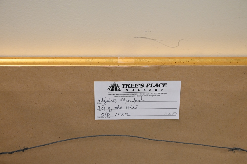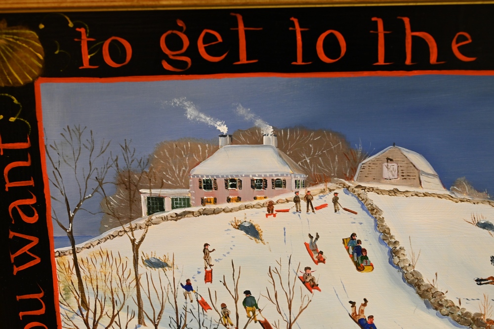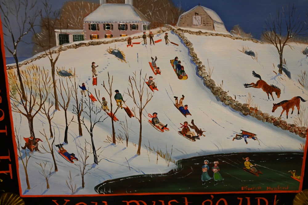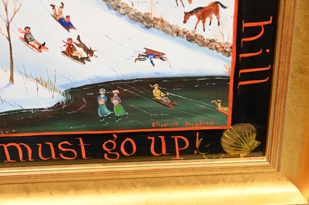 Lot 330: Elizabeth Mumford (1950 – 2020), winter landscape, sledding, oil on board, “If you want to get to the top of the hill you must go up.”, 9 1/2 x 11 1/2 inches.