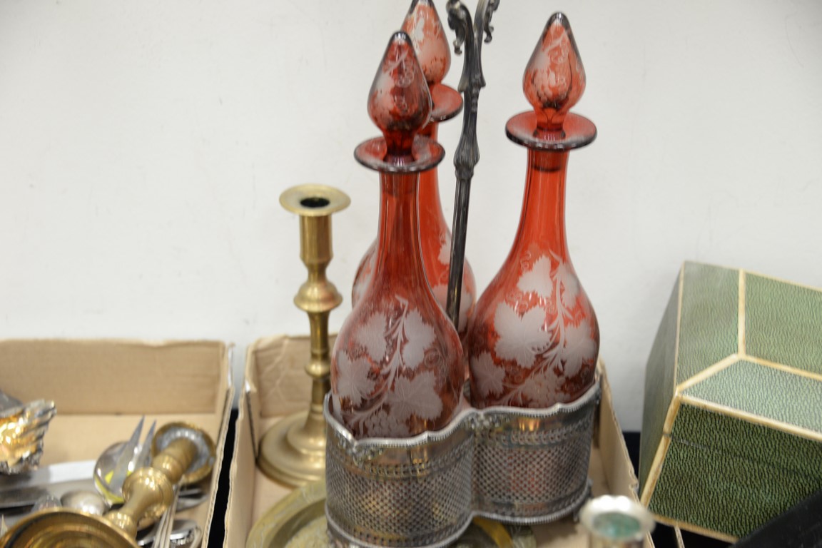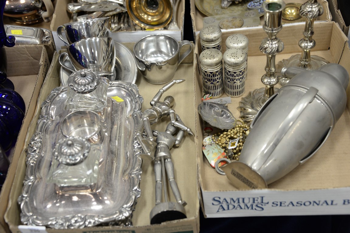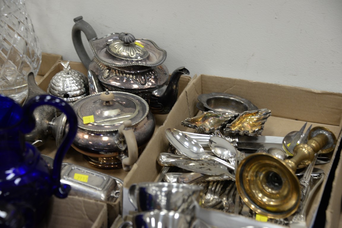 Lot 330: Five box lots of silverplate and brass to include ink set, teapots, flatware, penguin shaker, etc.