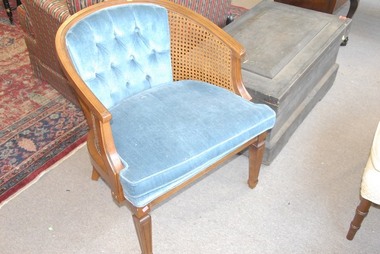 Four piece lot cane side chair, rocker, stool, and armchair.