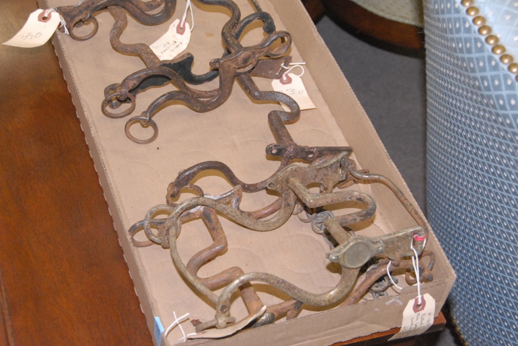Group of five early iron horse bits, iron and plated.