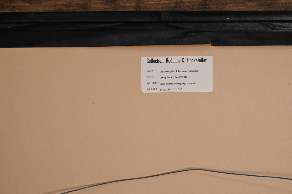 John James Audubon (1785 – 1851), Dusky Duck, hand colored engraving and aquatint, plate 302, “The Birds of America”, published by Robert Havell, 18 1/2″ x 23″ inches. Provenance: Collection of Rodman C. Rockefeller; sold at Sotheby’s Thomas 5680, lot 725.