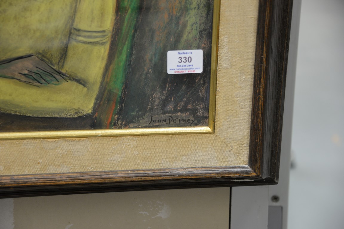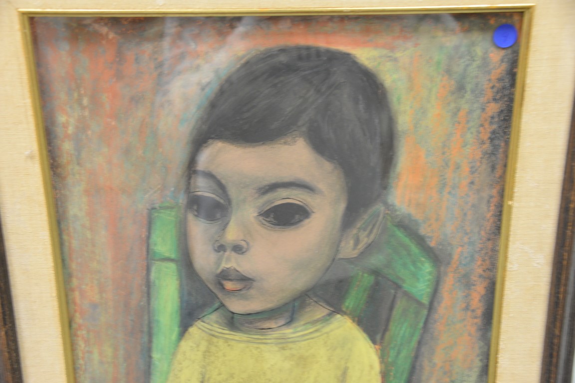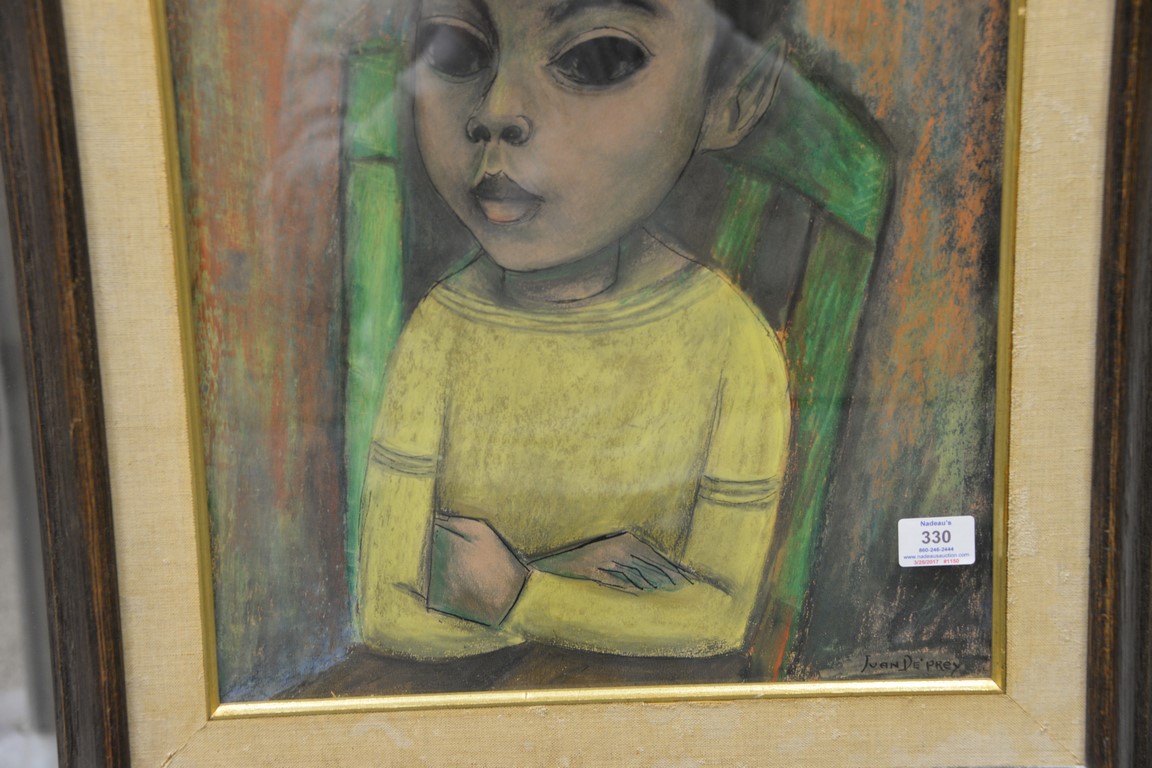 Lot 330: Juan Deprey 1904-1962 ink and pastel on board Portrait of Boy in Yellow signed lower right: Juan De’ Prey 20 x 16