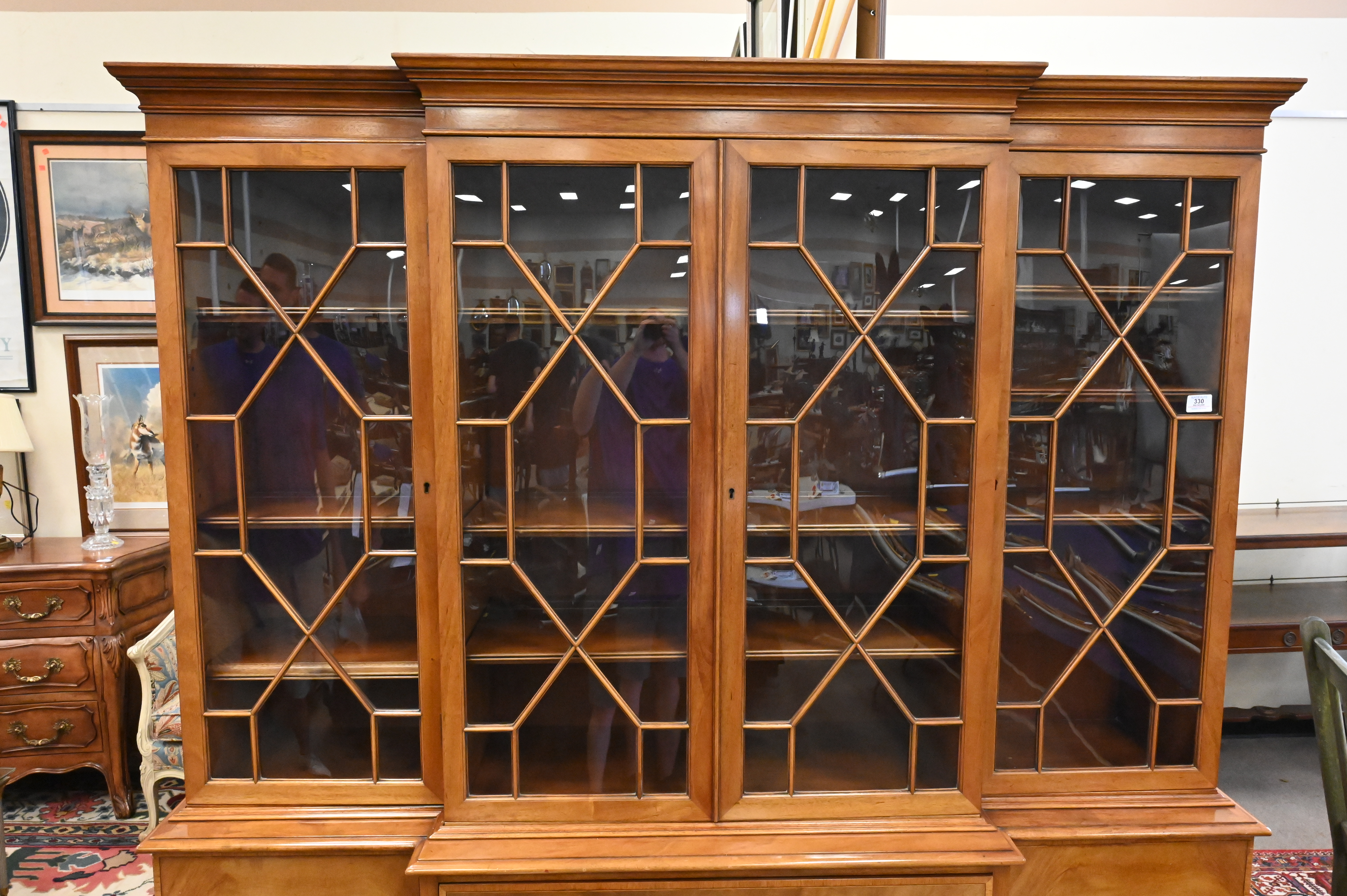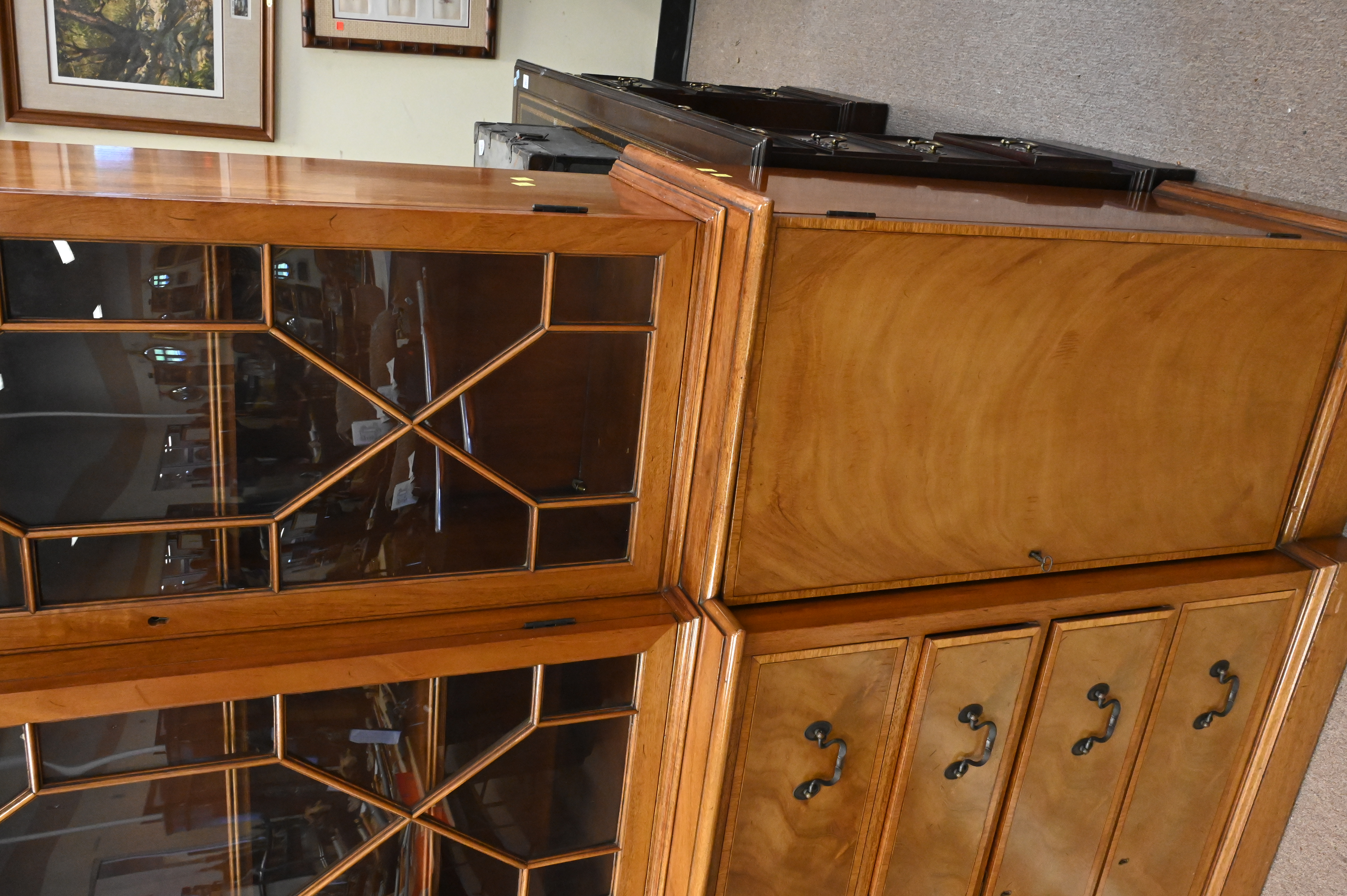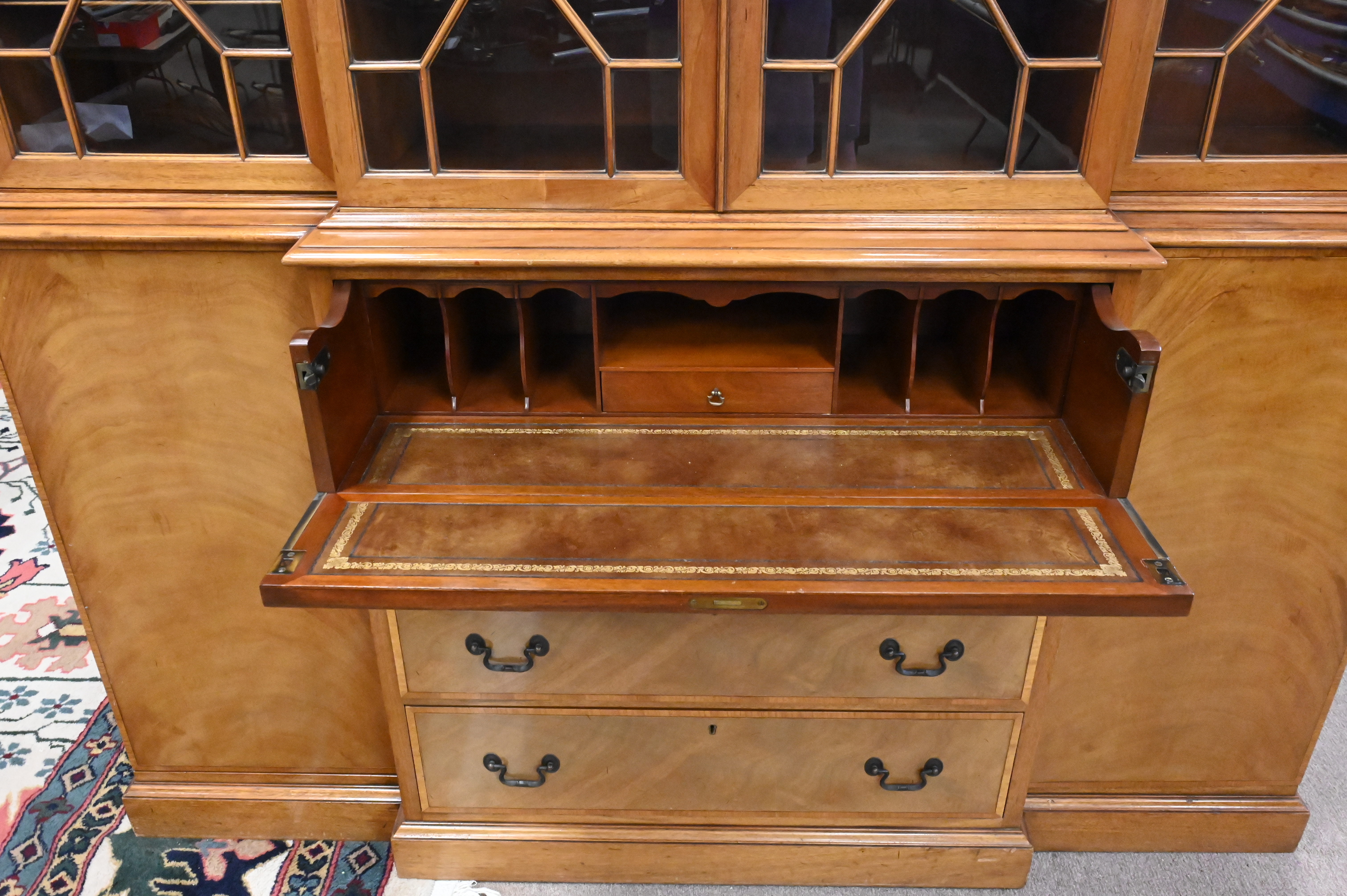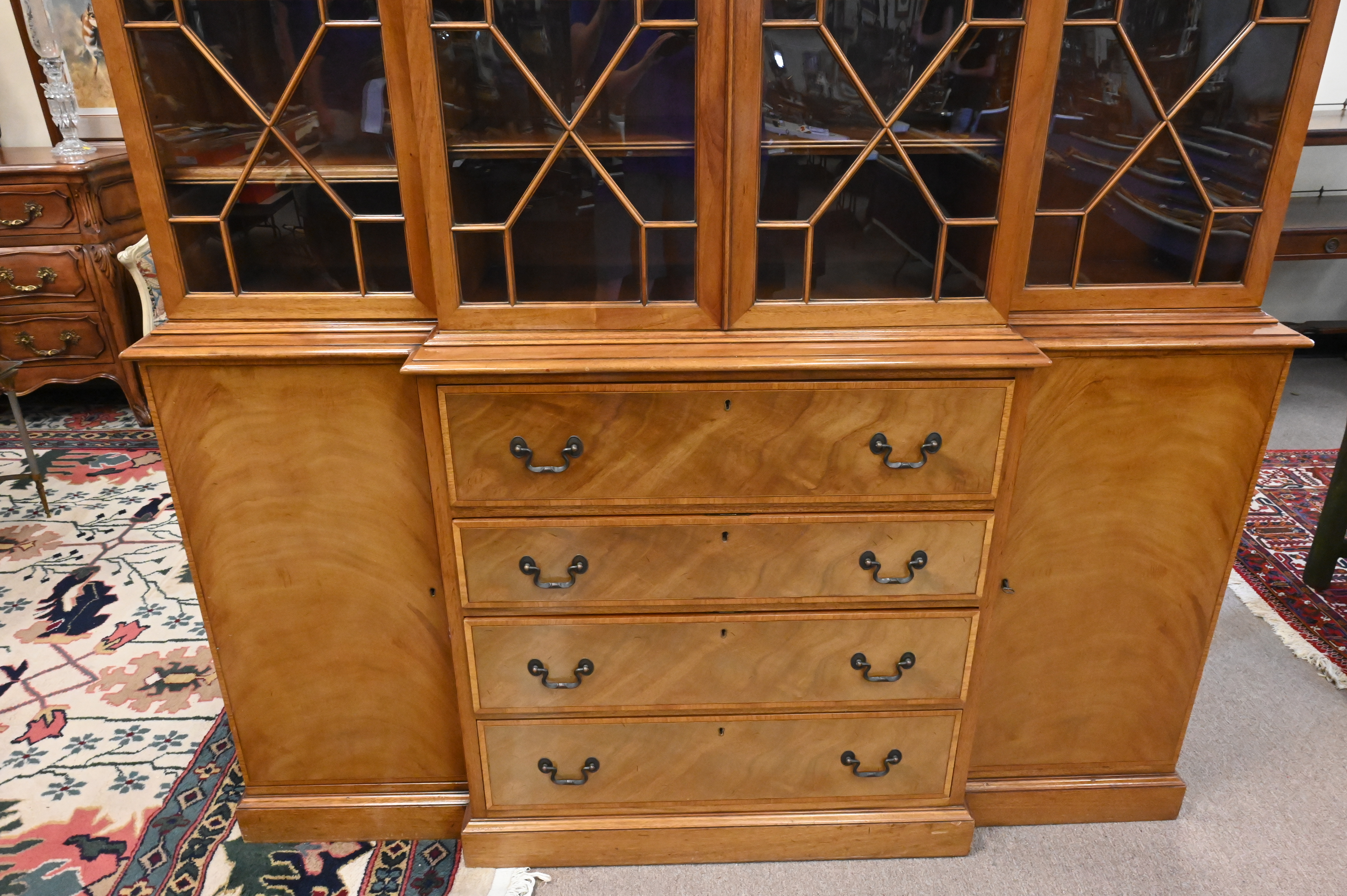 Mahogany Breakfront, in two parts with a pull out desk compartment, has shelves, sun faded, height 79 inches, width 66 inches.