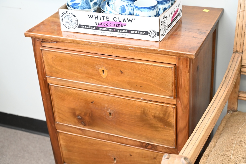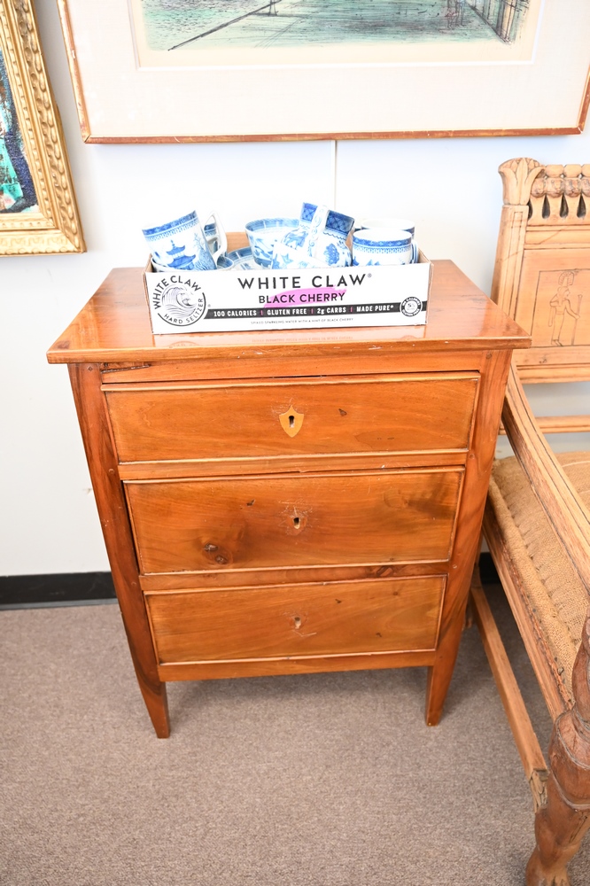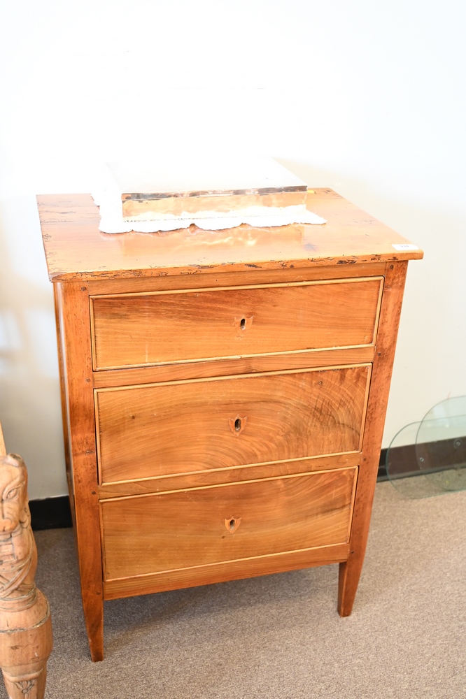 Lot 330: Pair of Continental Three Drawer Diminutive Chests, height 33 1/2 inches, top 16″ x 23 1/4″.
