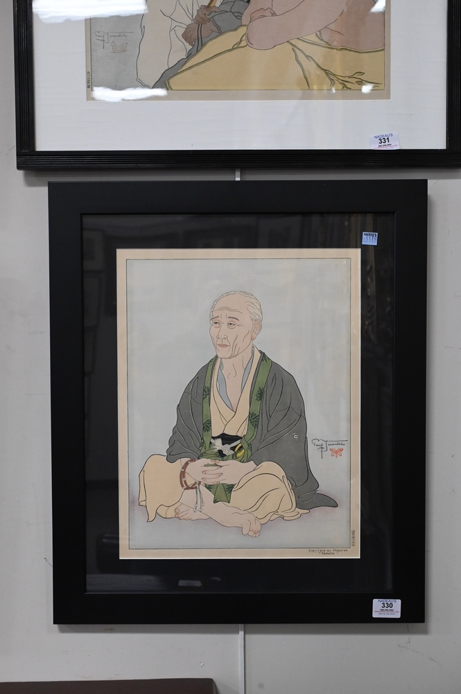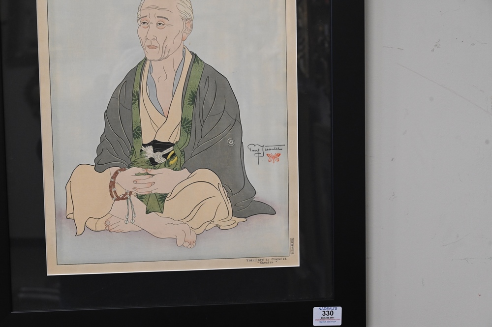 Lot 330: Paul Jacoulet (1902 – 1960) Woodblock, Vieillard au Chapelet “Kawadzu”, pencil signed lower right, sight size 16 1/2″ x 13″.