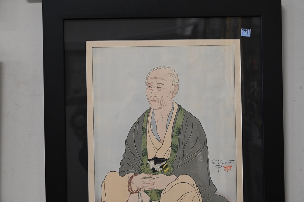 Paul Jacoulet (1902 – 1960) Woodblock, Vieillard au Chapelet “Kawadzu”, pencil signed lower right, sight size 16 1/2″ x 13″.