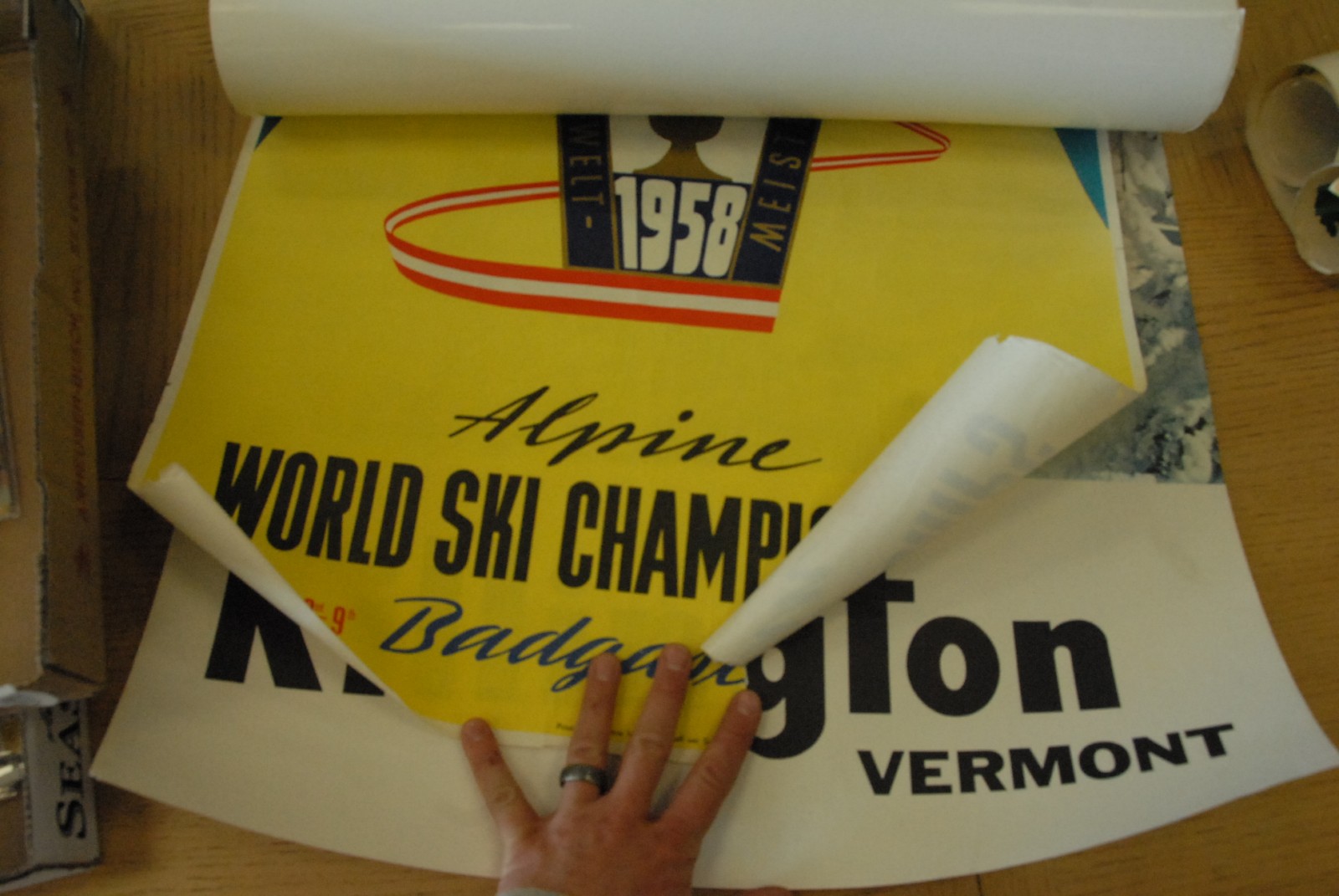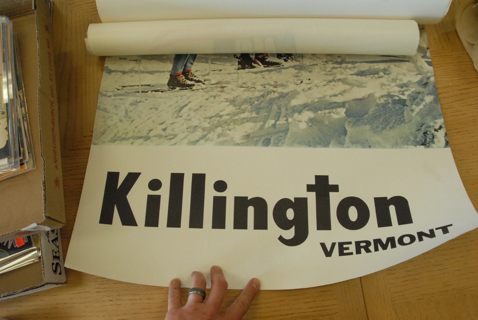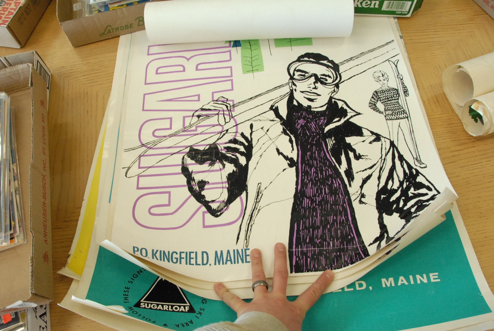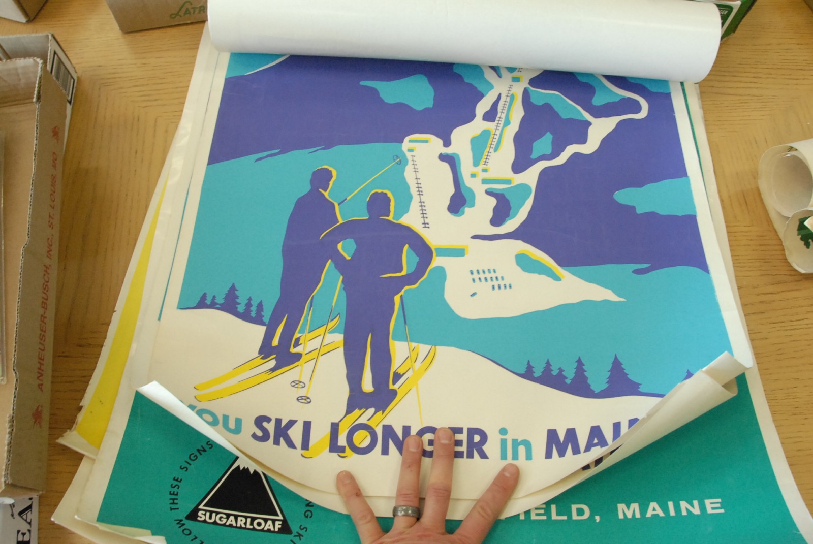 Seven ski posters including Sugarloaf, Killington, Austria, Ski longer in Maine, Ski Vermont ,mid to late 20th century