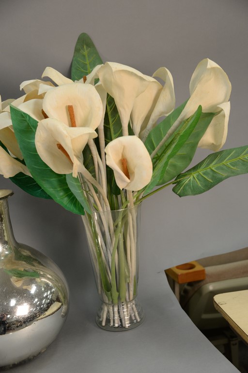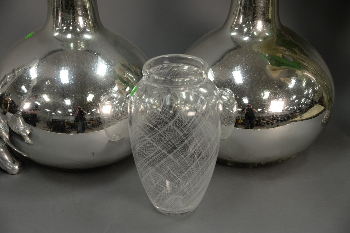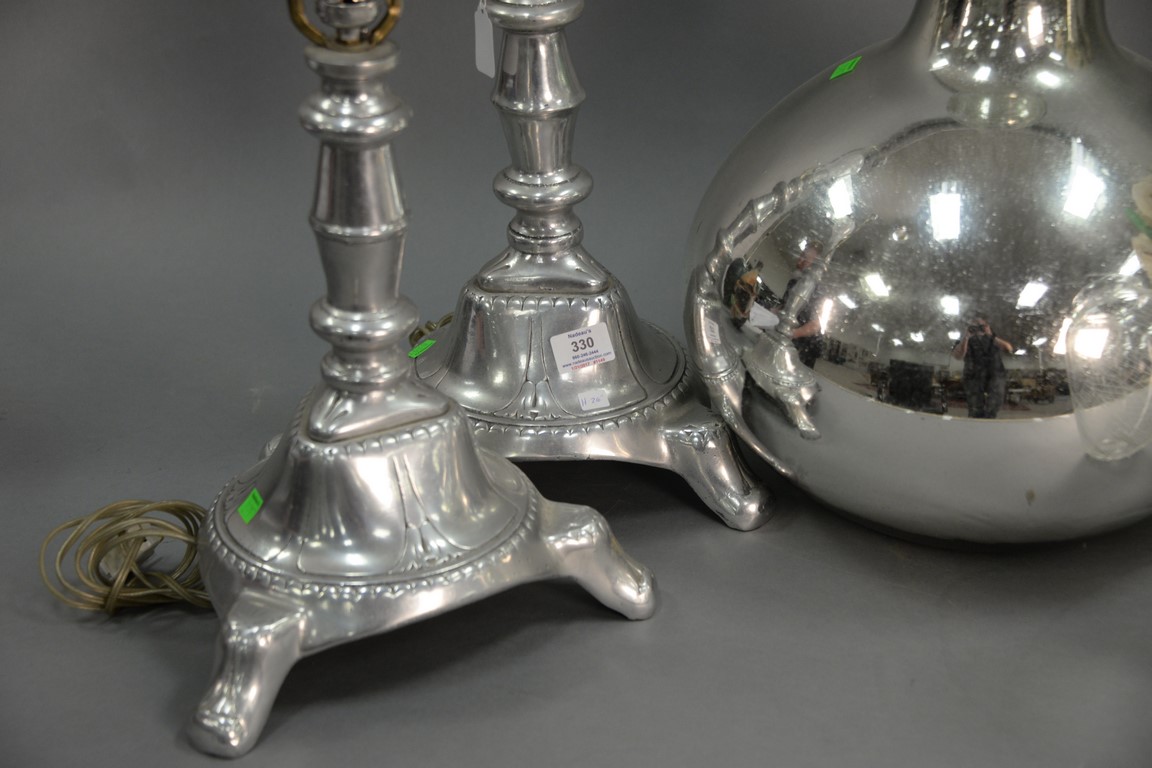 Lot 330: Six piece lot to include pair of mercury glass vases ht. 18in., pair of aluminum table lamps ht. 26in., glass vase of faux flowe…