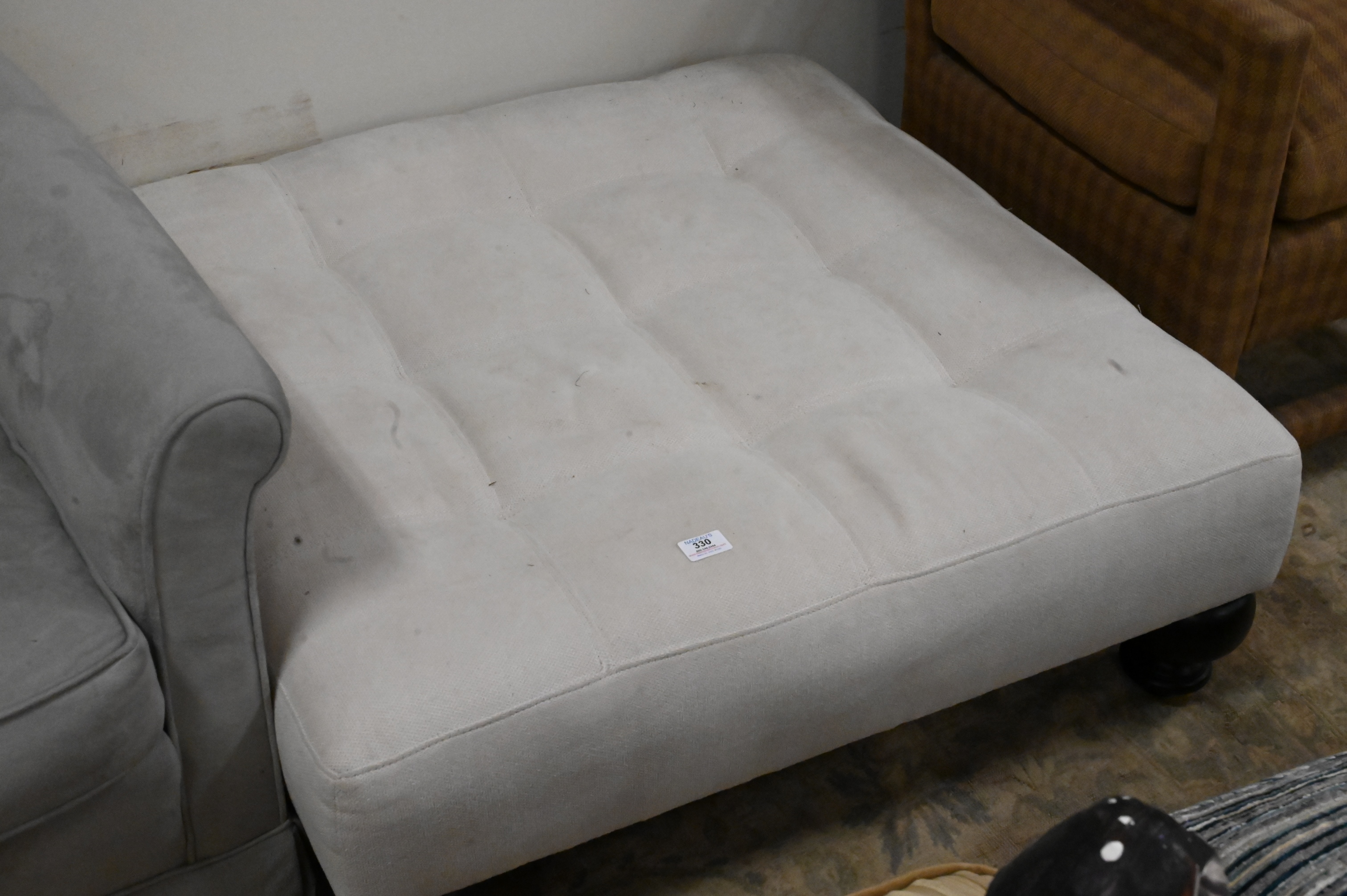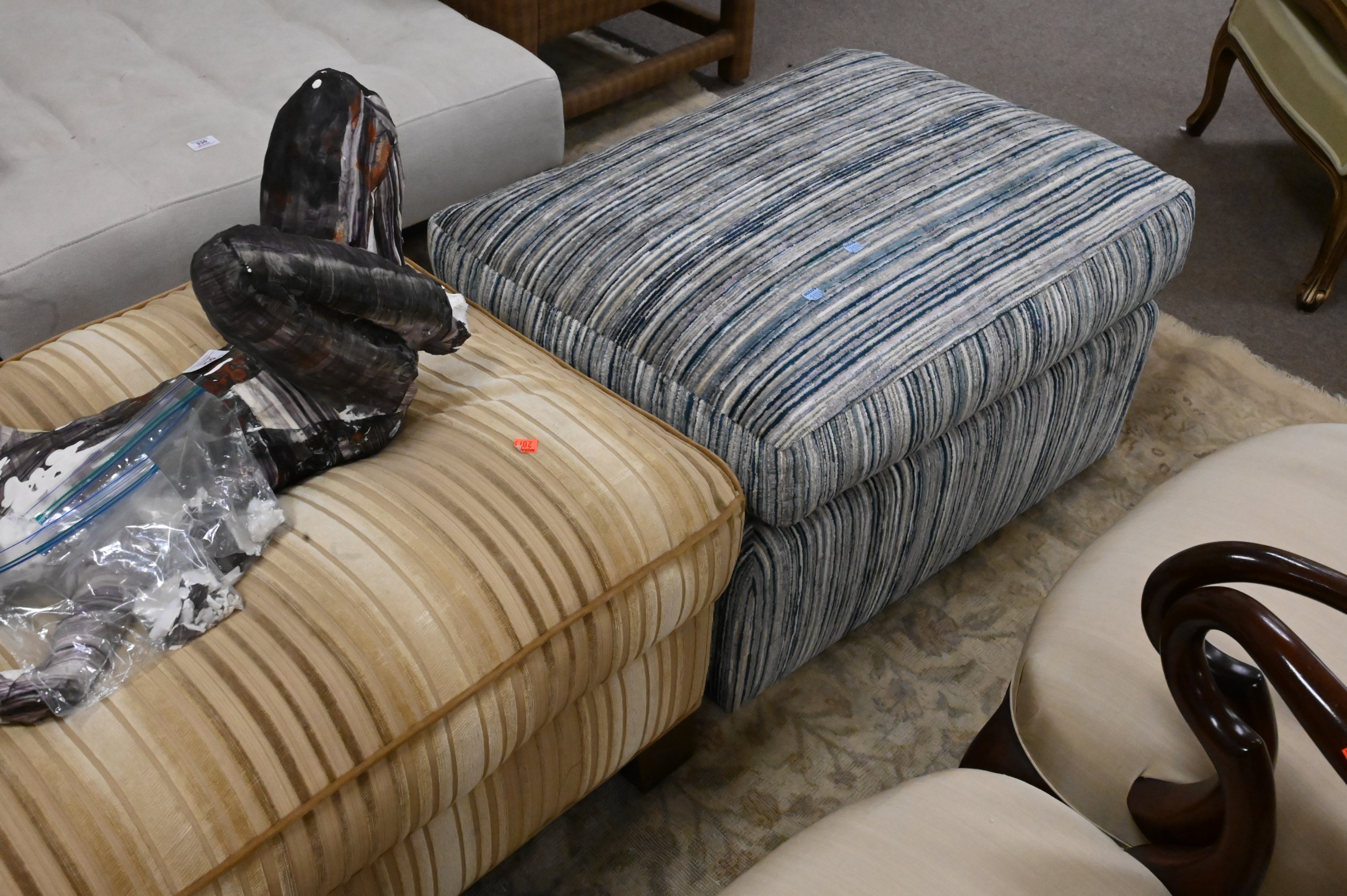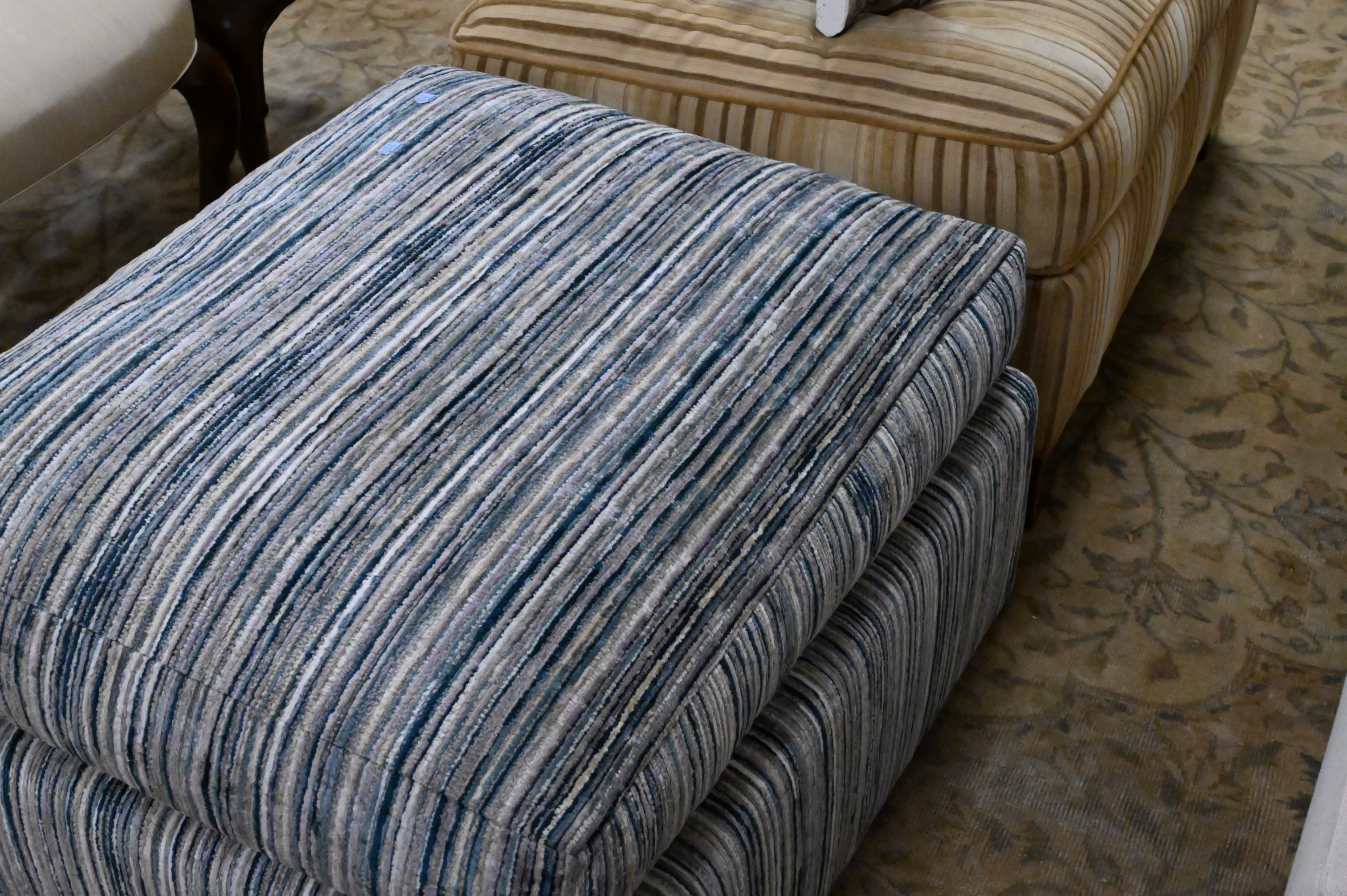 Three Contemporary Upholstered Ottomans, slight soiling, largest height 13 inches, top 36″ x 36″.
