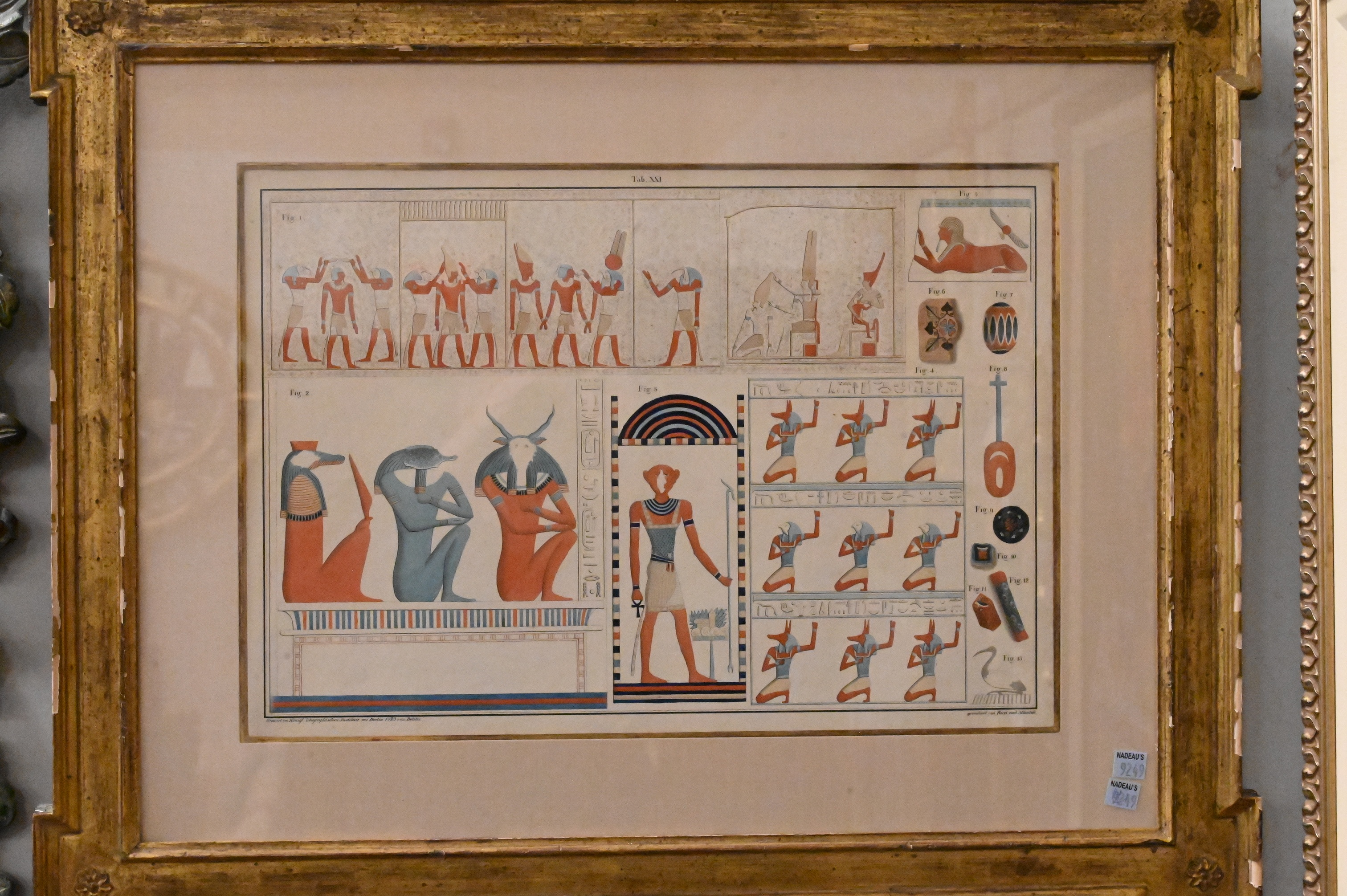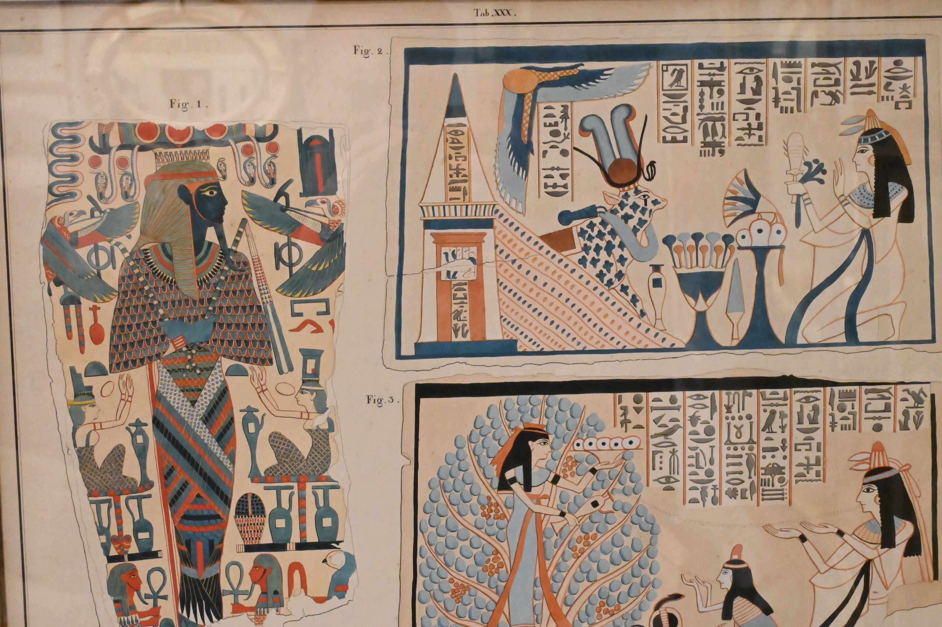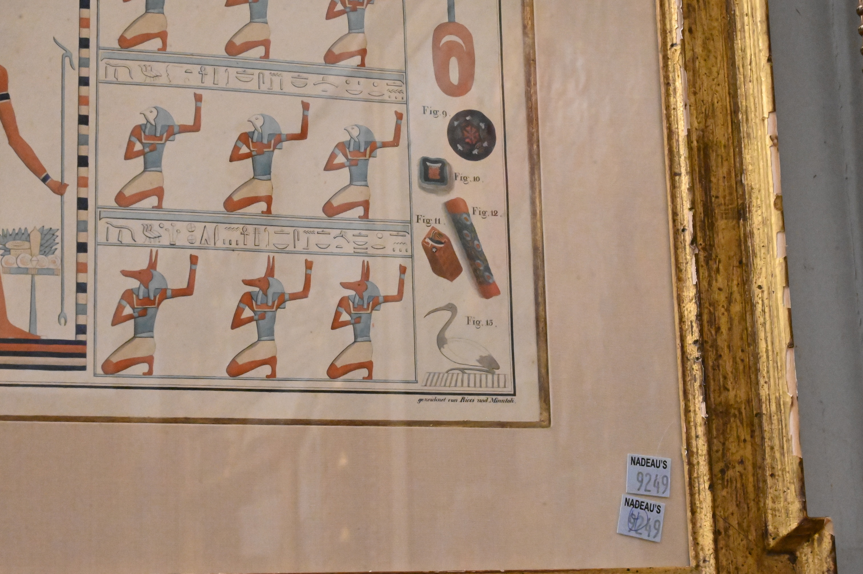 depicting Egyptian figural, animal, and hieroglyphic motifs after ancient wall paintings, including deities, ritual objects, symbolic ornament, and architectural elements. Drawn by Ricci and Heinrich Menu von Minutoli and engraved by Beleke for Minutoli’s early Egyptological publication. Lower margins inscribed: “gezeichnet von Ricci und Minutoli” and “Gravirt im Königl. lithographischen Institute zu Berlin 1823 von Beleke.”
