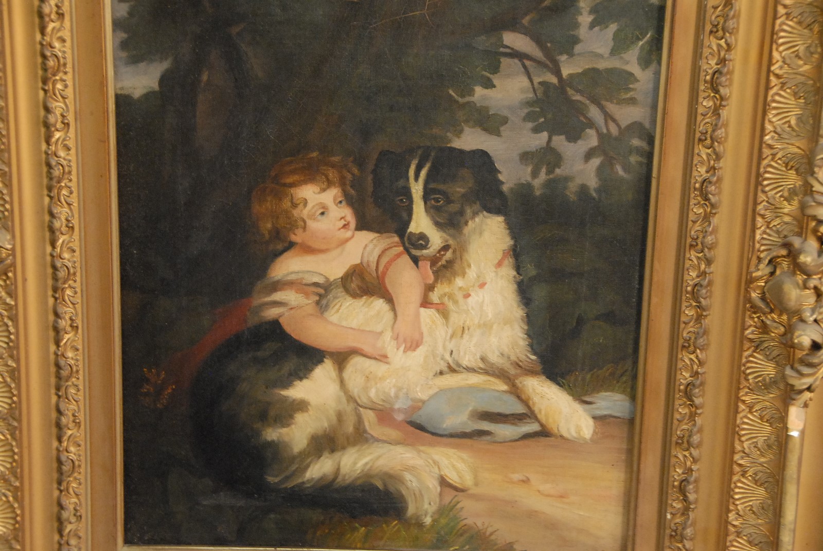 YOUNG GIRL SITTING WITH HER DOG oil on canvas unsigned 18th/19th century 17 x 13