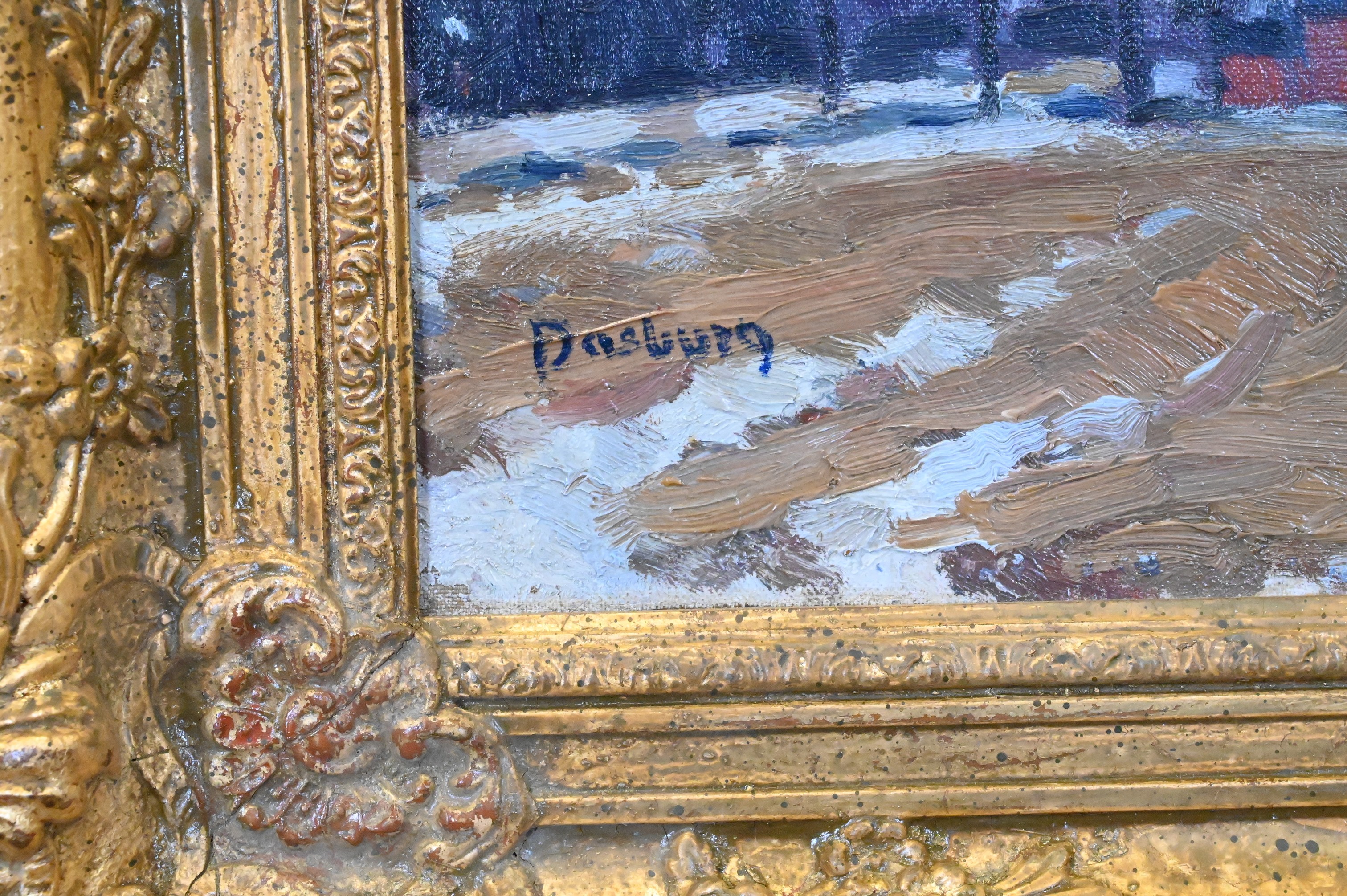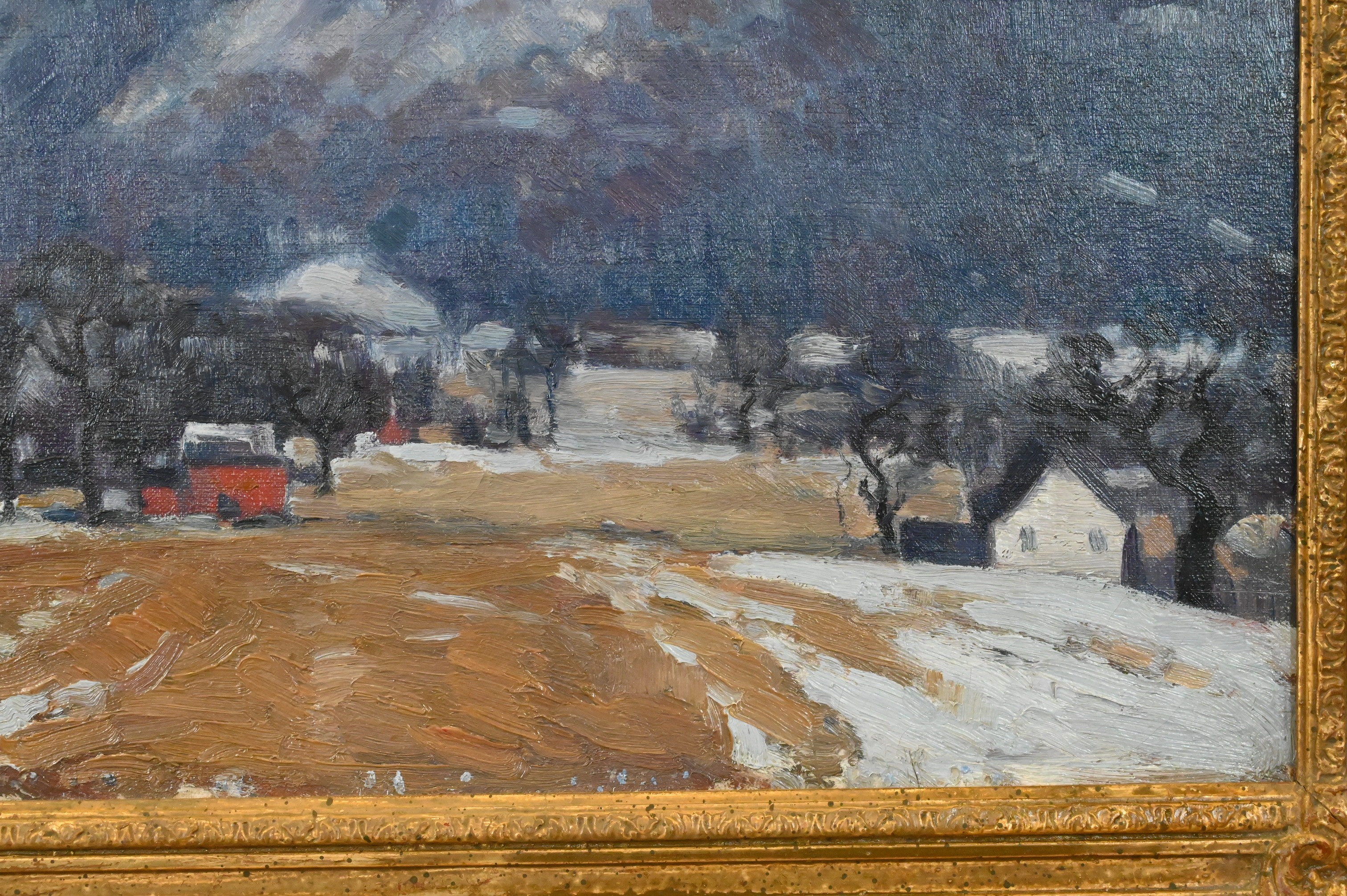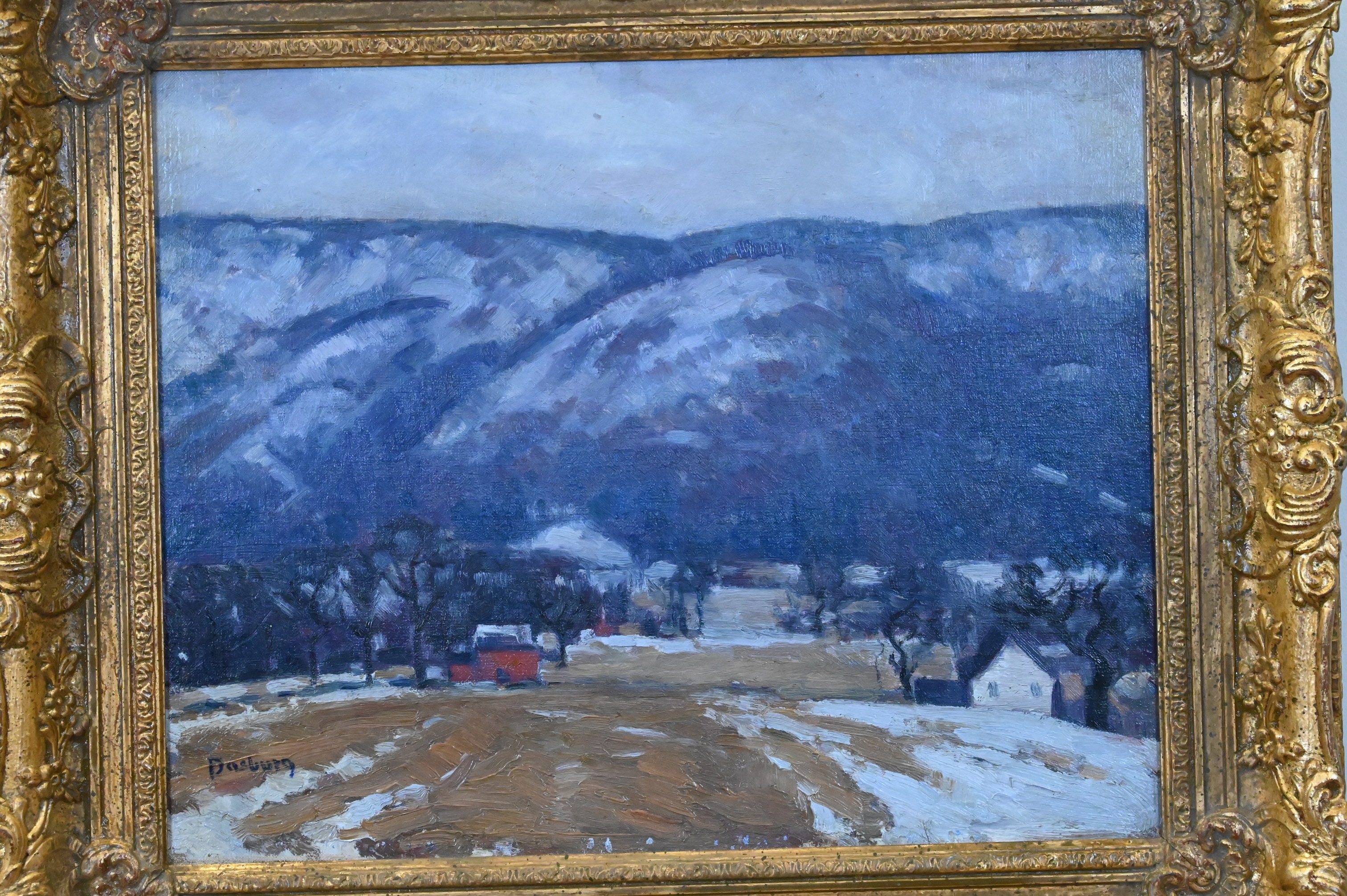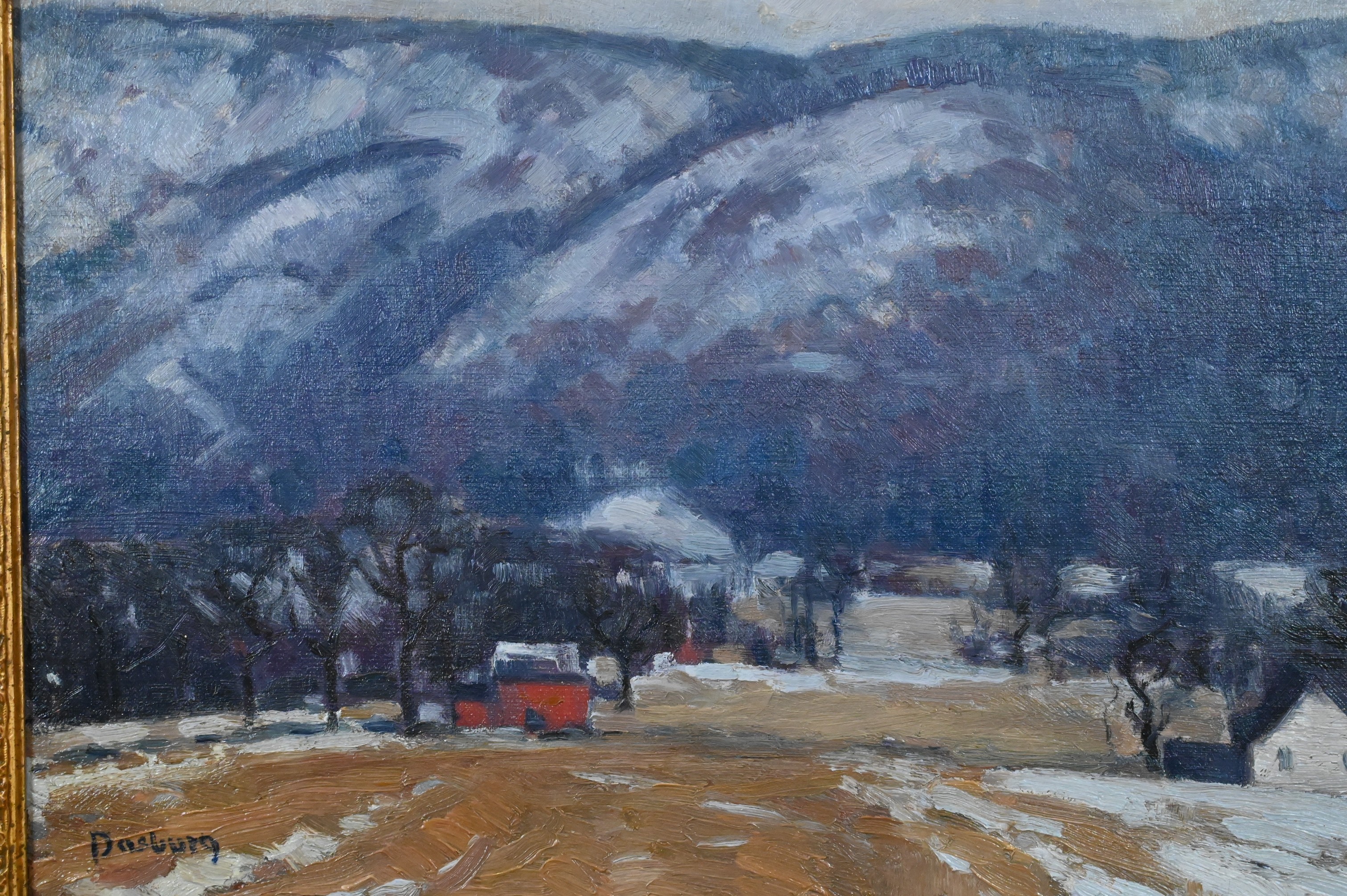 depicting a snow-covered valley with farm buildings nestled beneath a line of rolling, violet-hued mountains; painted with bold, faceted brushwork and a restrained, modernist palette that captures the structural rhythm of the landscape, characteristic of Dasburg early Woodstock period before his move to Taos.