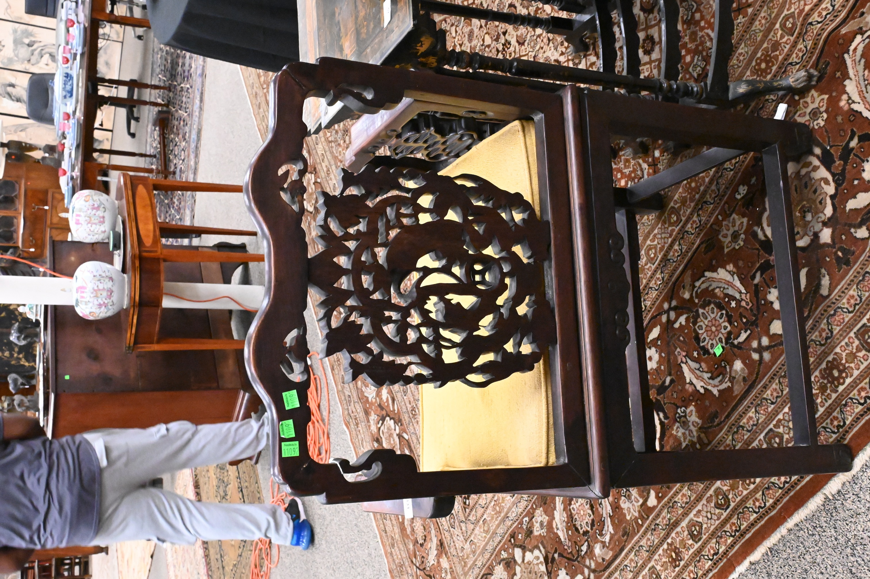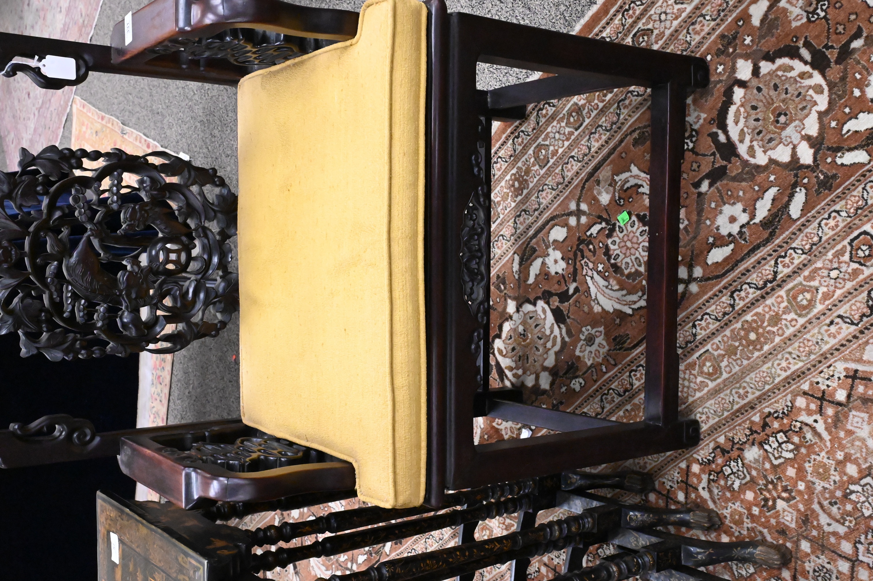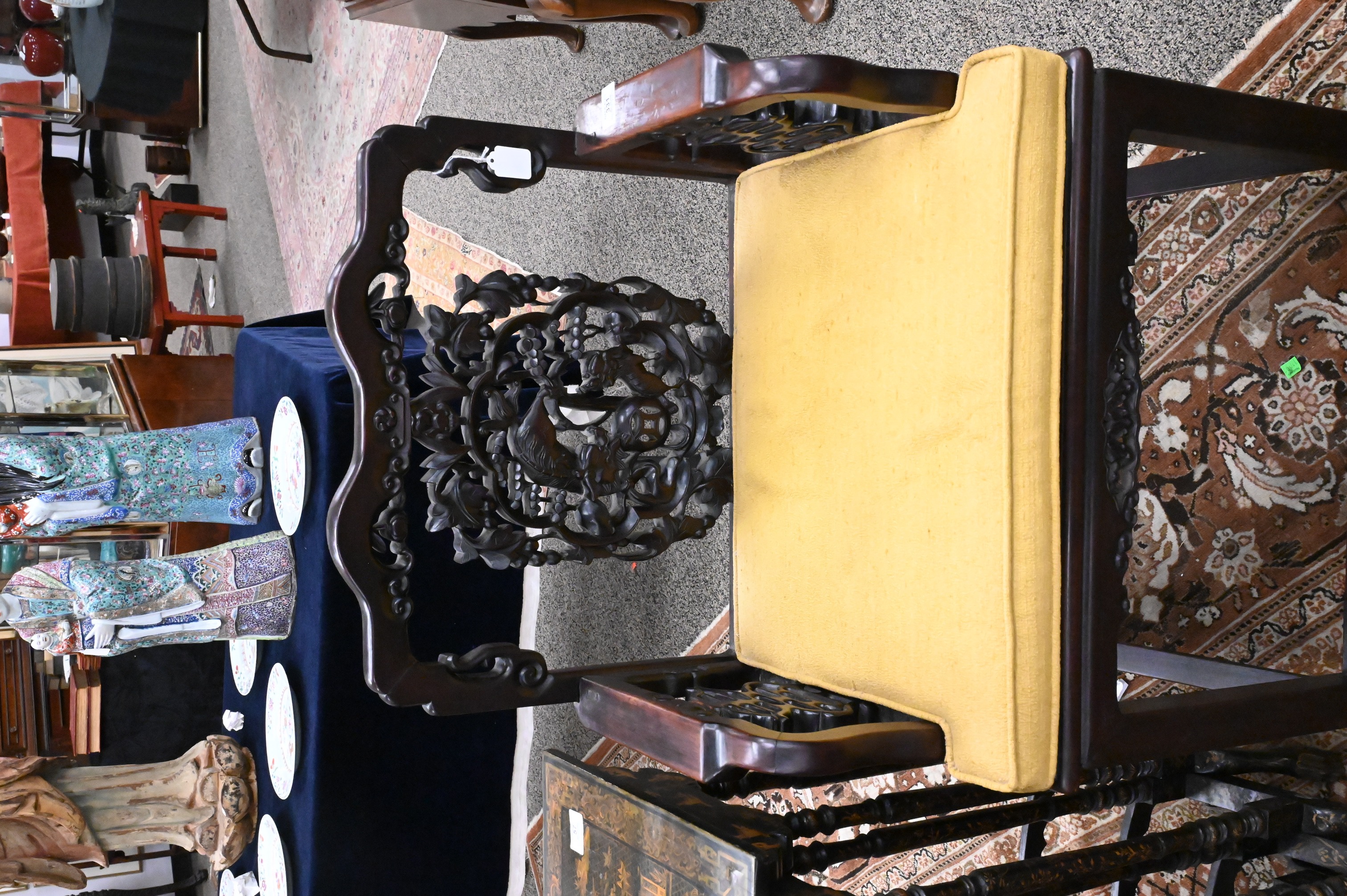 A Chinese carved hardwood armchair, the pierced back splat elaborately carved with a central bird among flowering branches, framed by scrolling foliage, the arms similarly carved with floral designs. Solid seat over an apron with foliate carving, raised on square legs joined by stretchers.