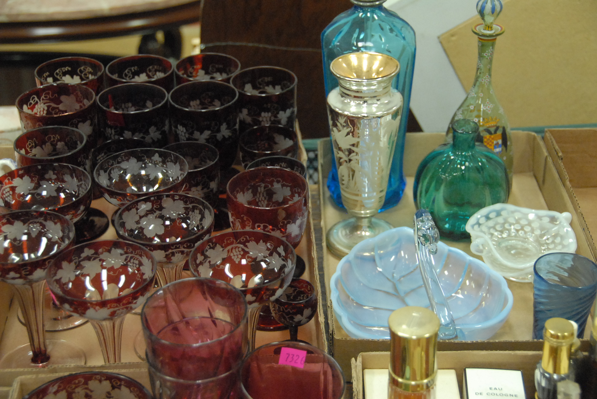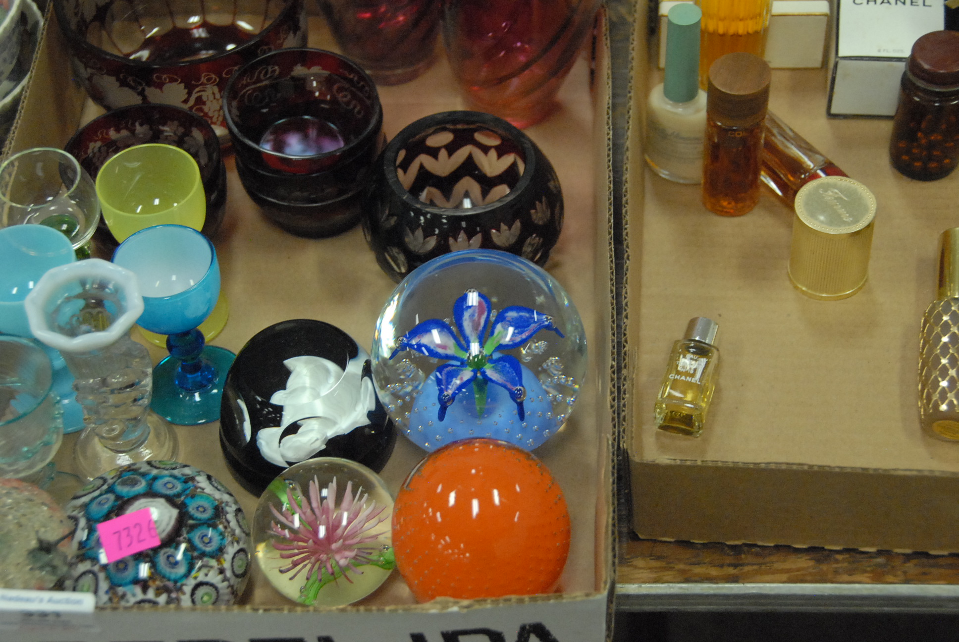 Four box lots to include ruby glass, paperweights, enameled decanter, perfumes, etc.