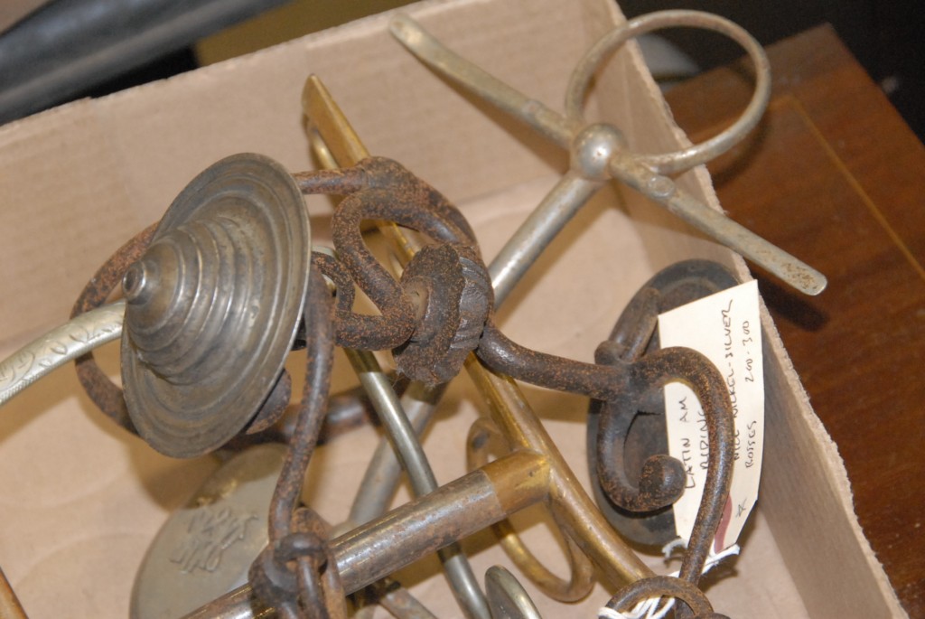 Group of four early horse bits European, Latin, plated.