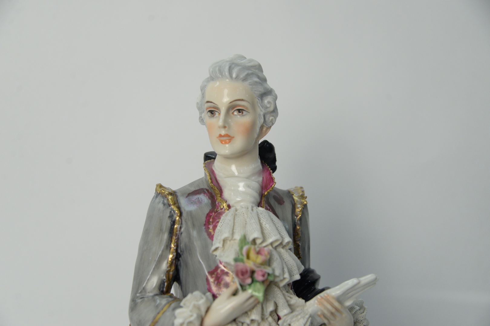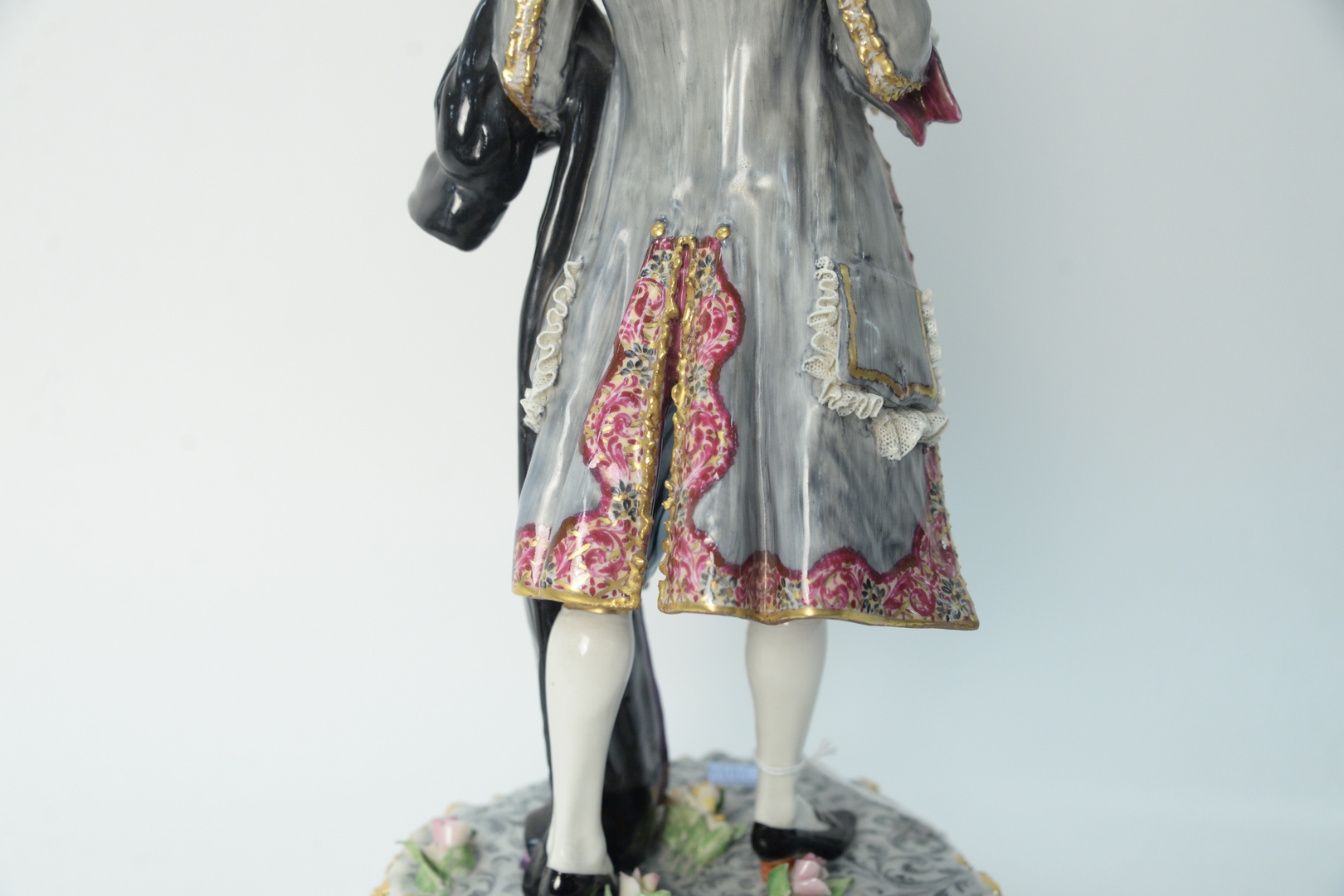 Large Capodimonte Porcelain Figure, of a man holding gloves, stand on a round base with flowers, height 19 inches. Provenance: The Estate of Alina Roisen, Park Avenue, New York.