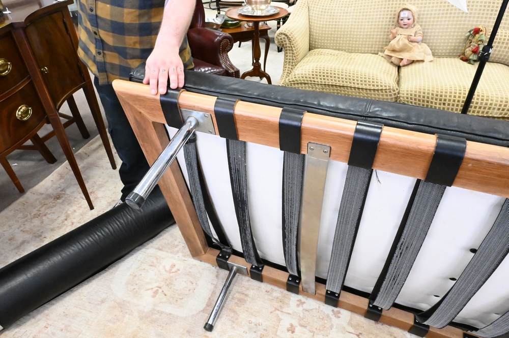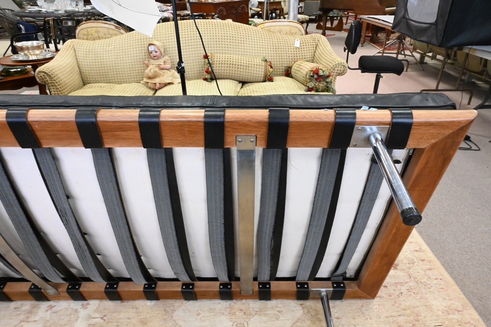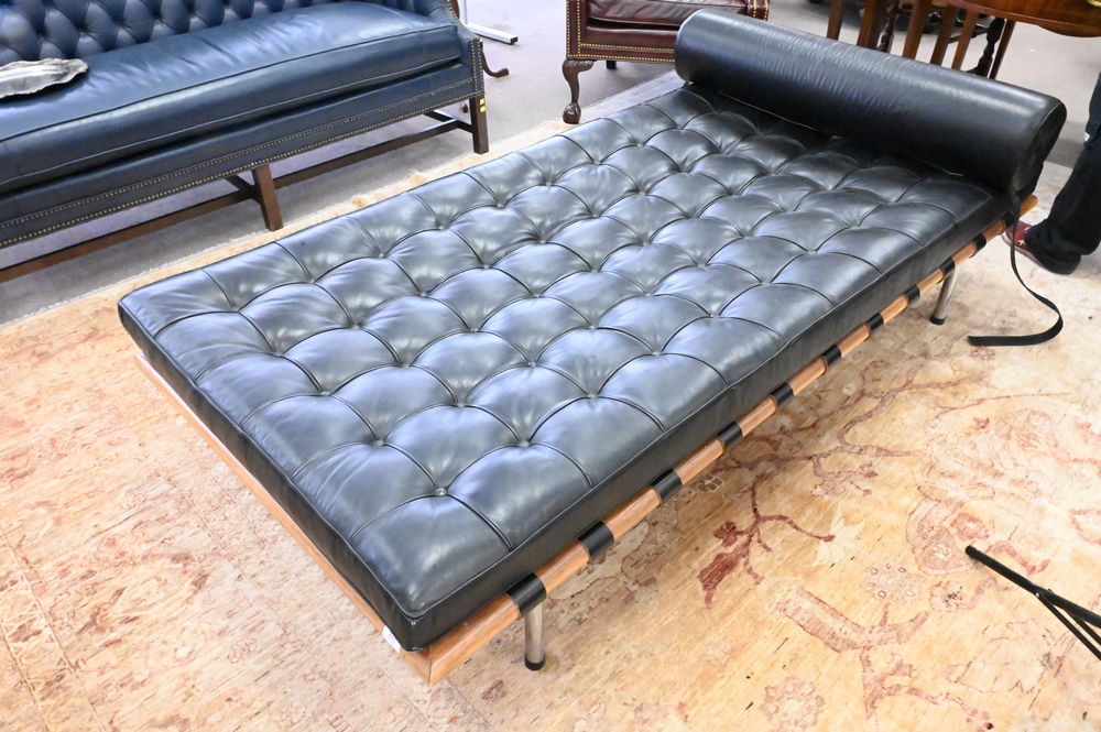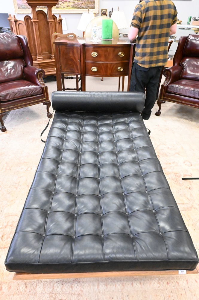 Lot 331: Ludwig Mies Van Der Rohe Barcelona Daybed, having black leather cushion with bolster, on mahogany chrome frame with black leather straps, 38″ x 76″.