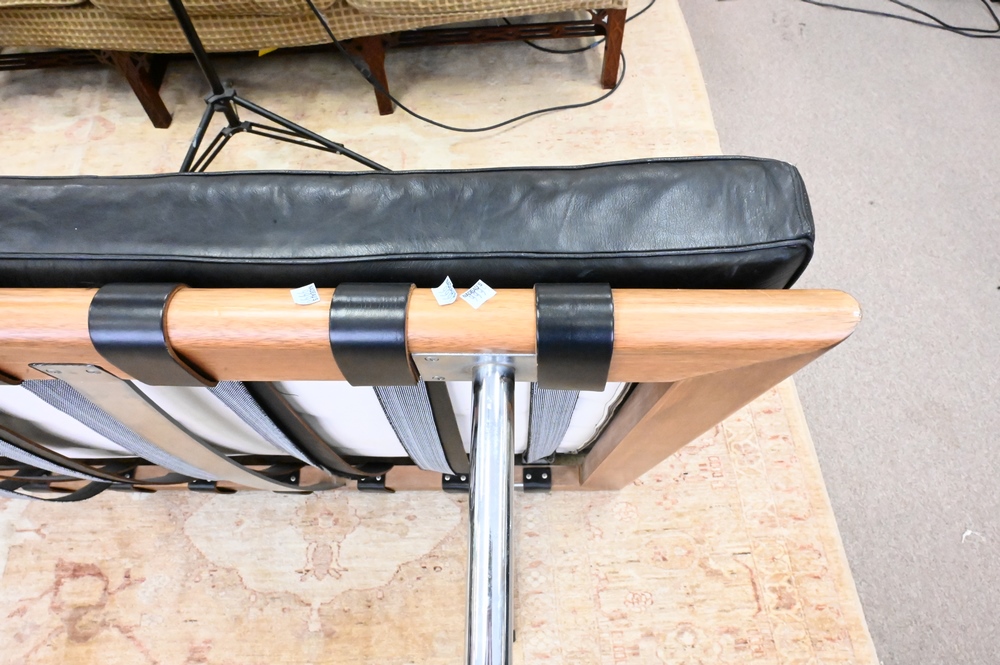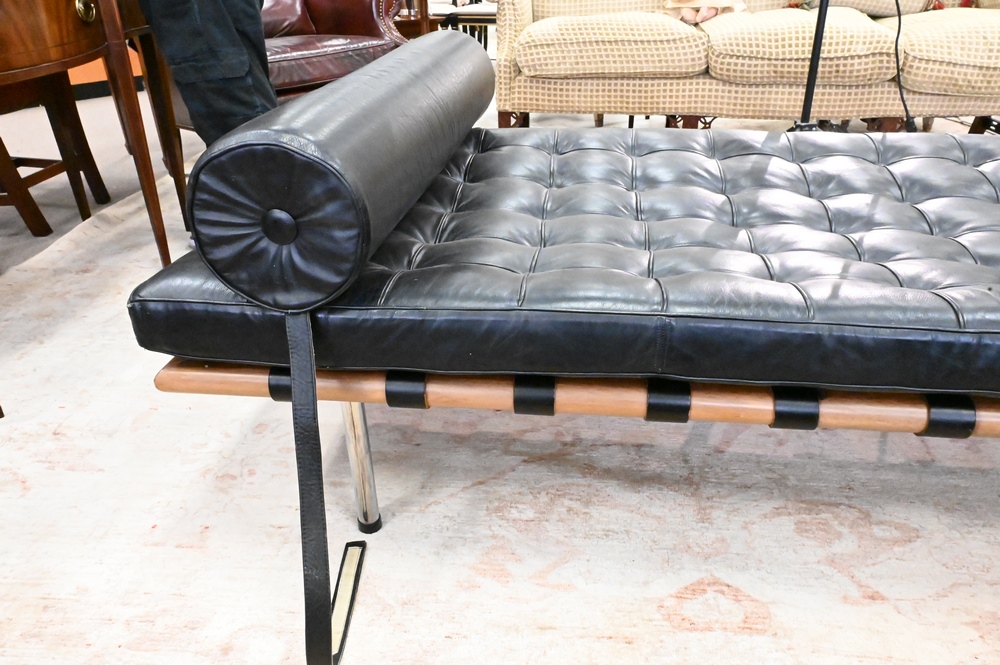Ludwig Mies Van Der Rohe Barcelona Daybed, having black leather cushion with bolster, on mahogany chrome frame with black leather straps, 38″ x 76″.