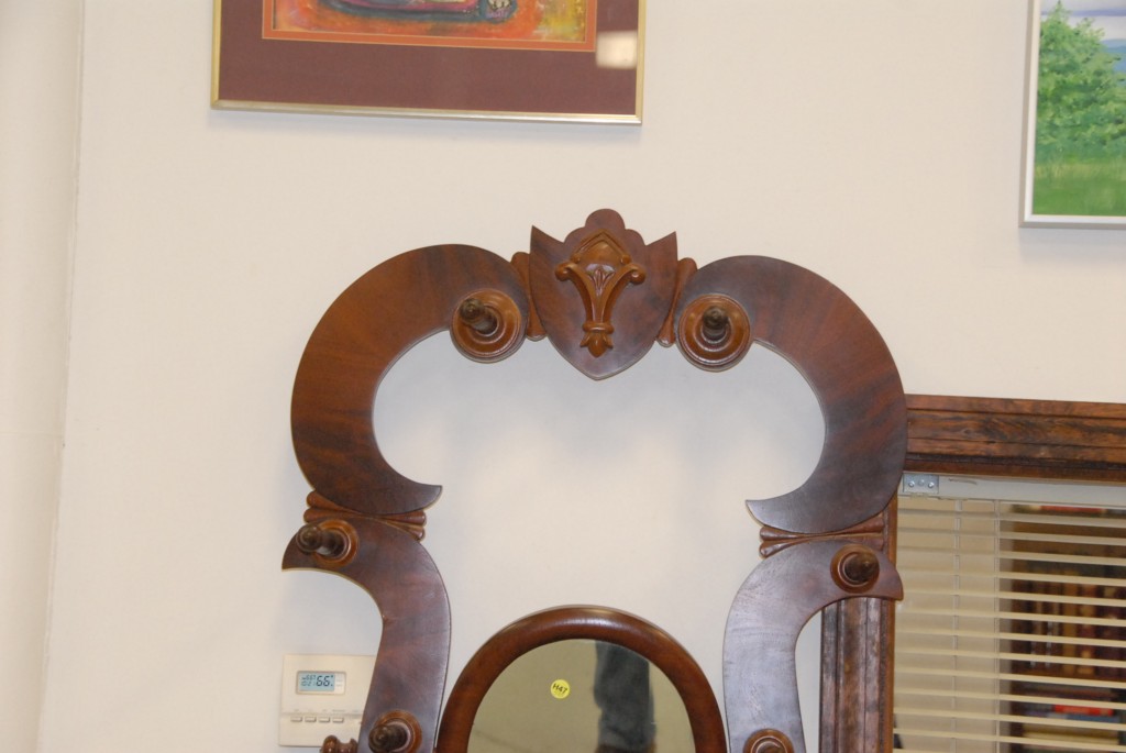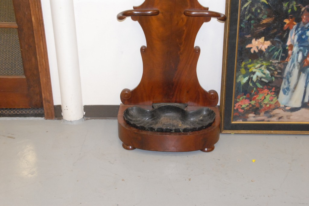 Mahogany hall rack with clam shell style iron pan in bottom.