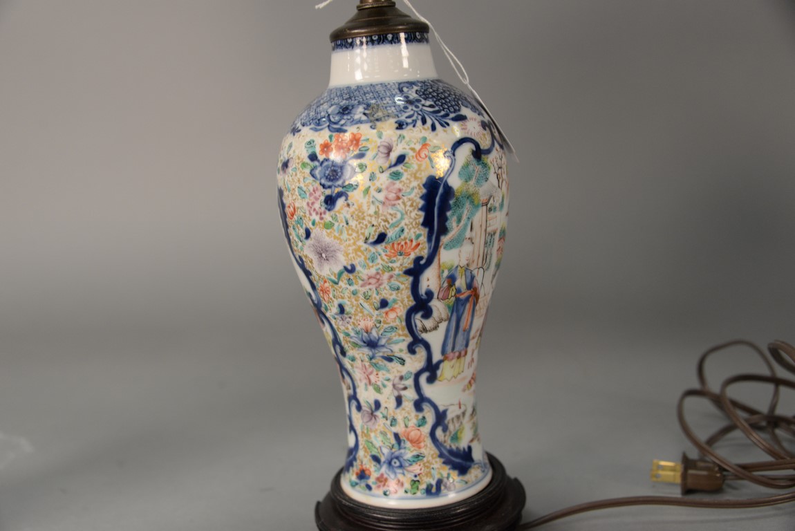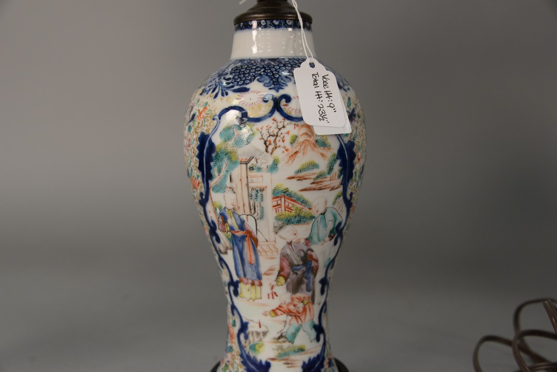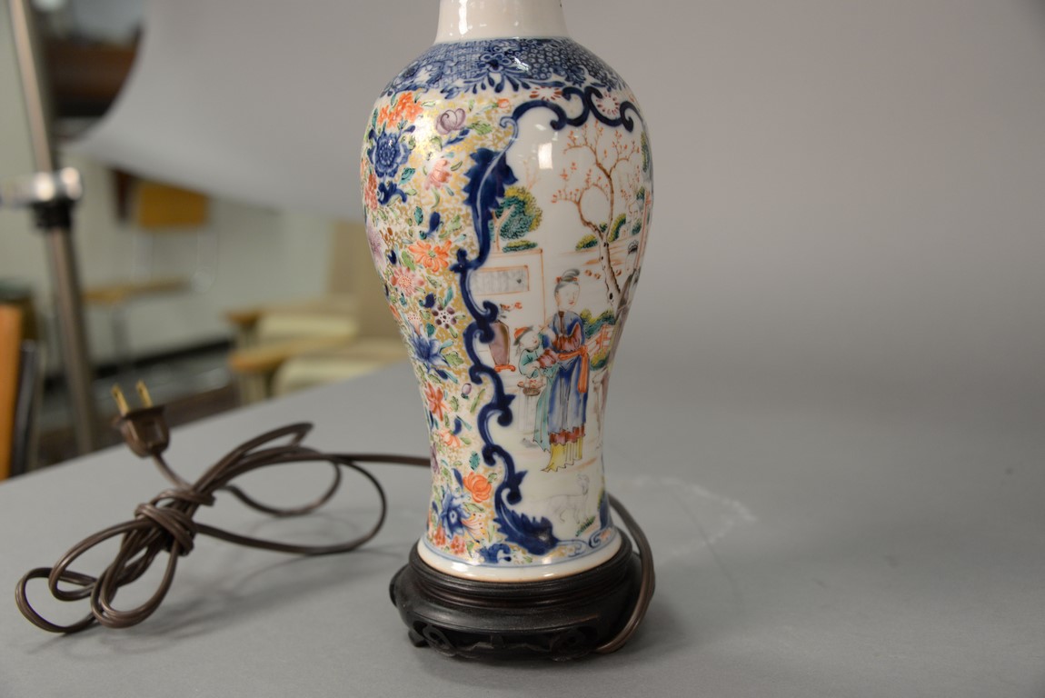 Lot 331: Pair of Oriental porcelain small baluster vases made into lamp having two panels, each painted with Guanyin and courtyard scene, made into table lamps. vase ht. 9 in. total ht. 23 1/2 in.