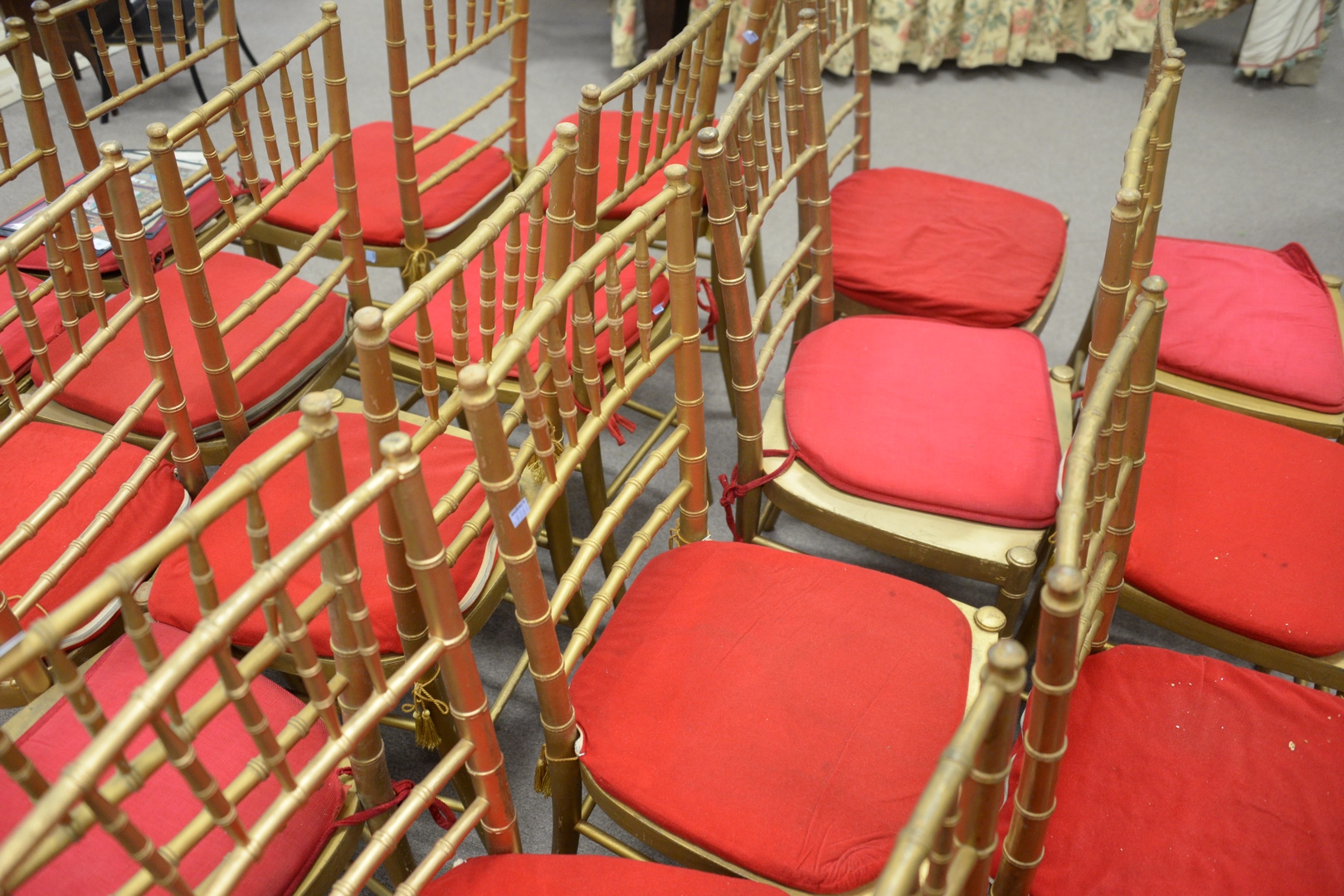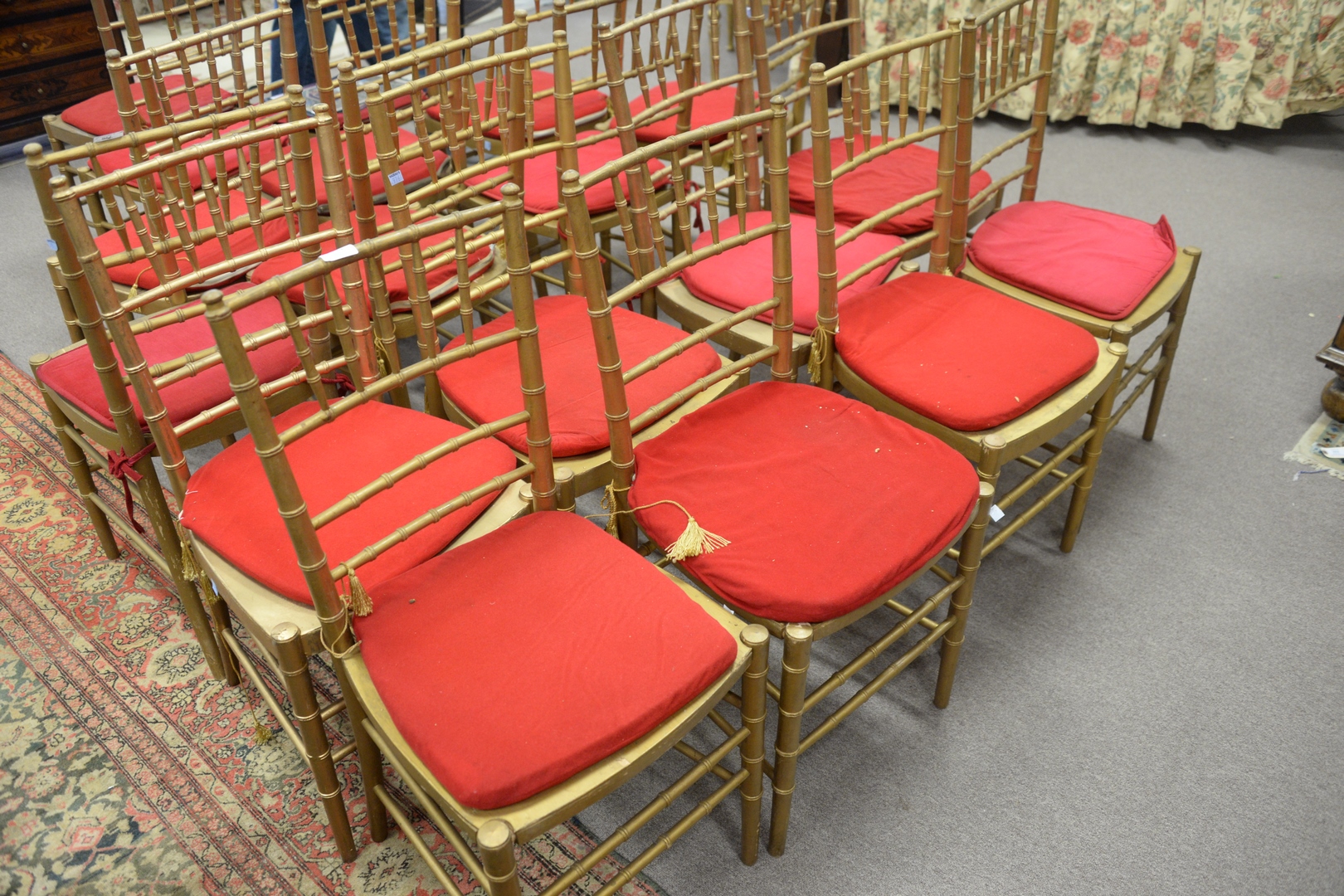 Lot 331: Set of Eight Faux Bamboo Chairs, gold with red slip seats, seat height 17 1/2 inches, total height 36.