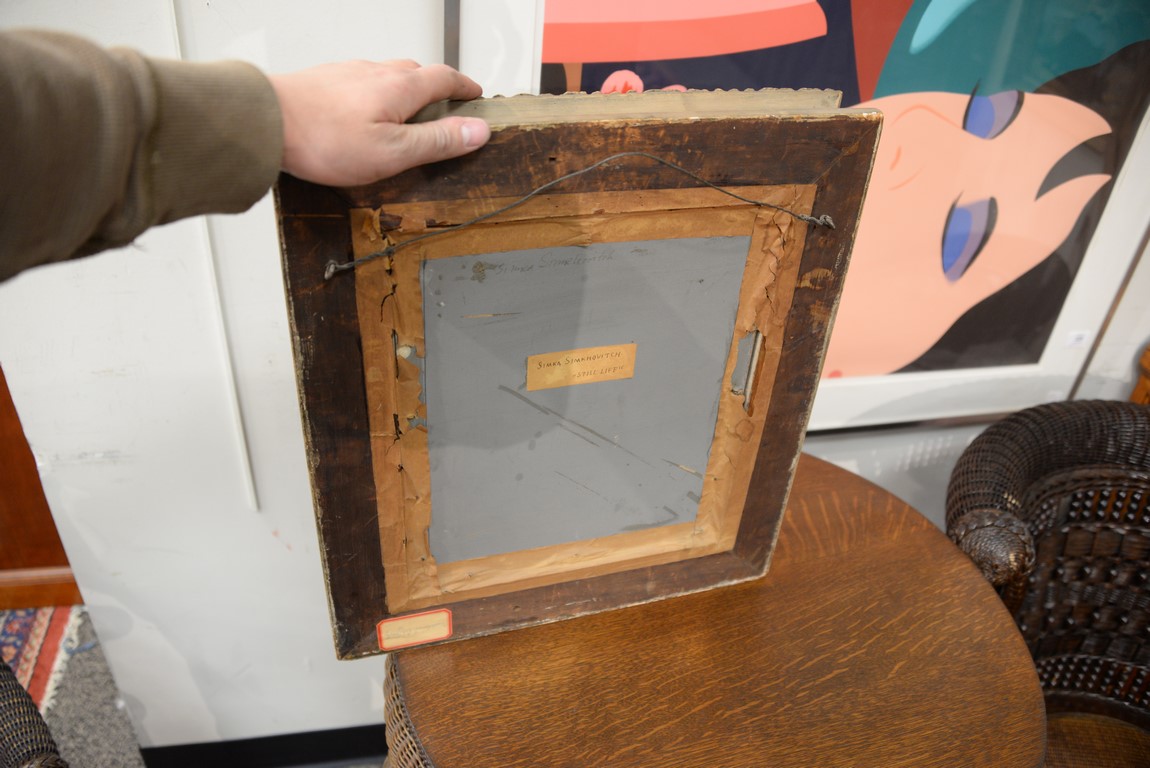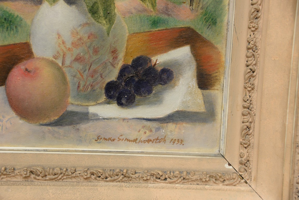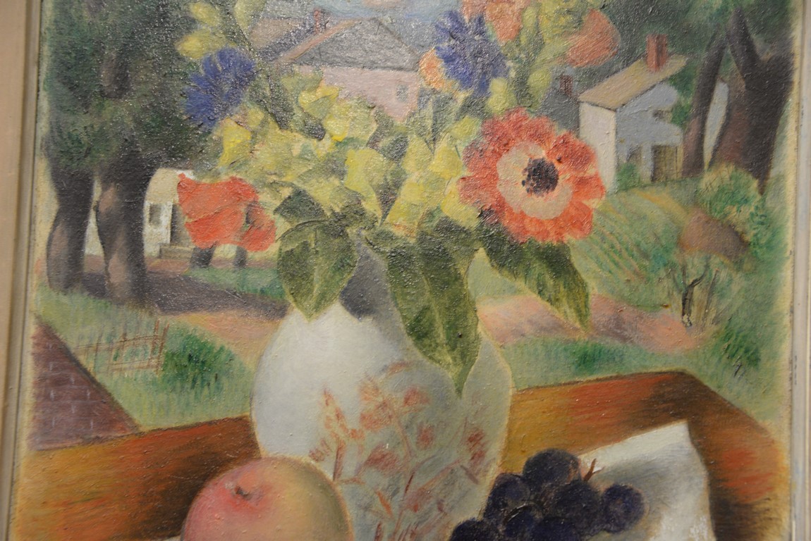 Lot 331: Simka Simkhovitch 1893-1949 Still Life of Flowers with Town in background oil on artist board signed and dated lower righ…
